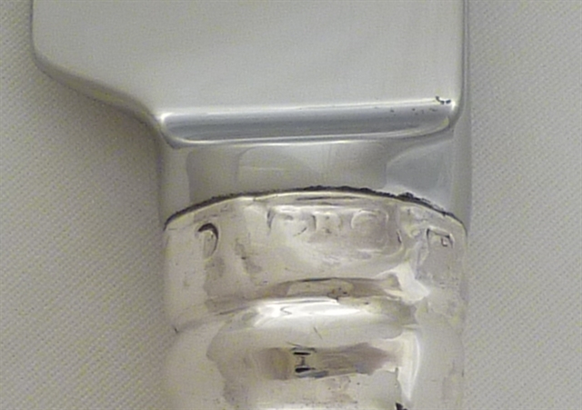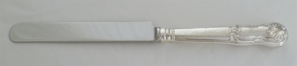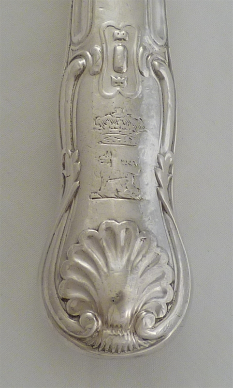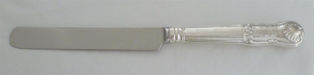 DESCRIPTION | One Victorian silver handled King's HourGlass pattern table knife with a double crest engraving to one side and fitted with a new mirror finished stainless steel parallel blade. |