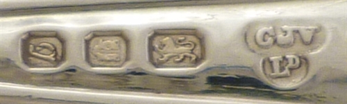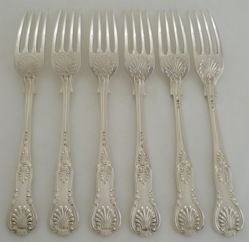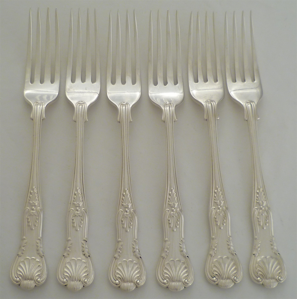 DESCRIPTION | Six solid silver double struck King's pattern with diamond shell heel dessert or salad forks with no engraving or erasure. |