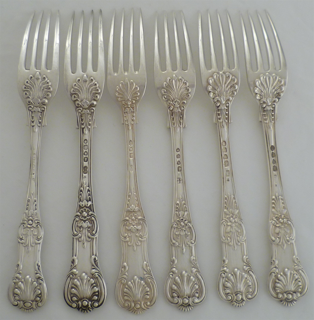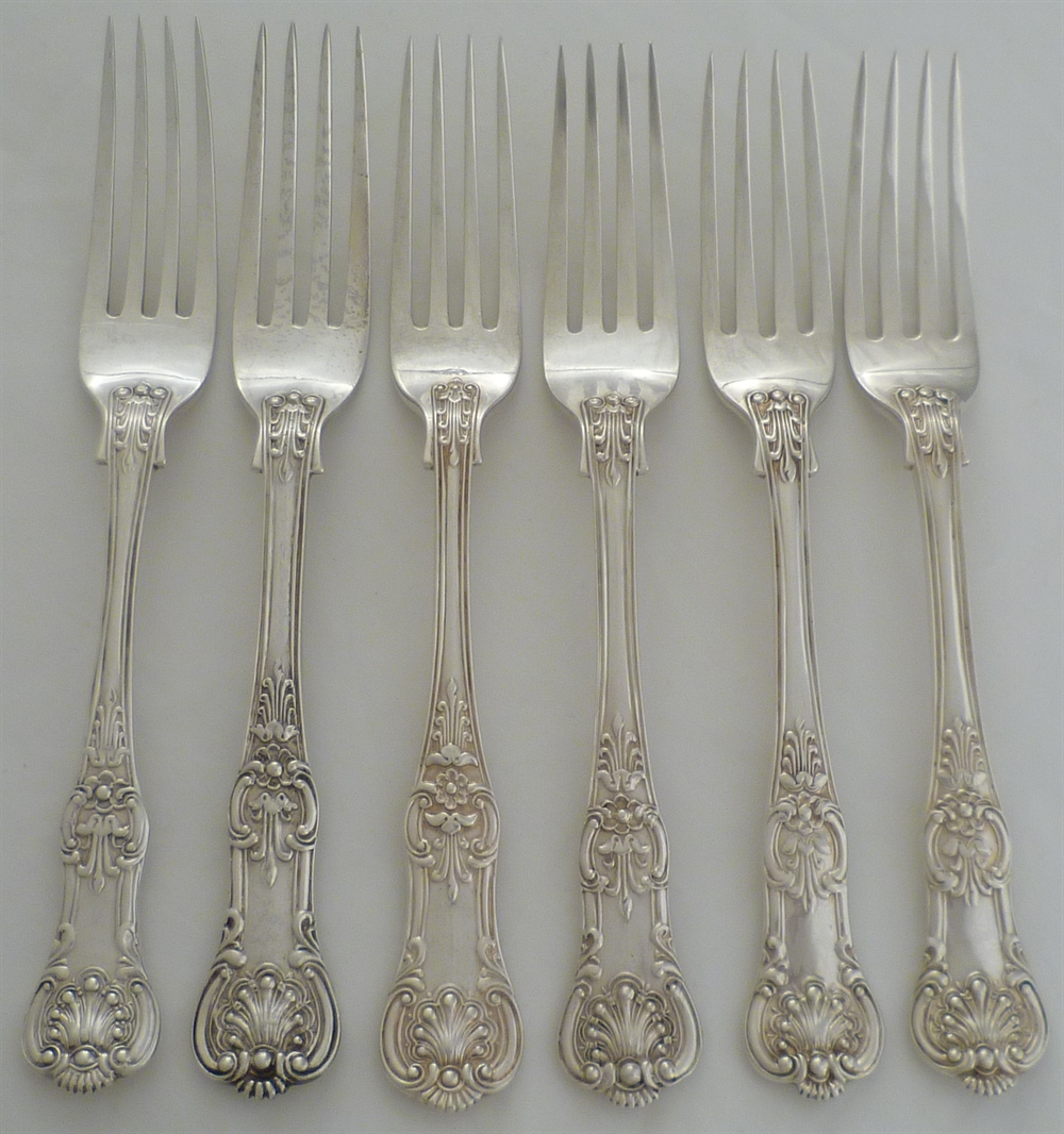 DESCRIPTION | Six 19th century solid silver double struck Queen's pattern dessert or salad forks with no engraving or erasure. Although a matched set of various makers and dates they work well together. |