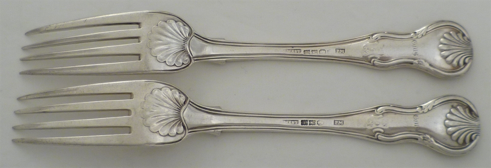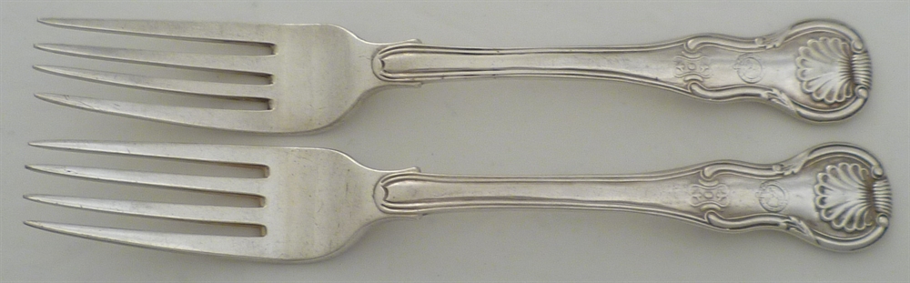 DESCRIPTION | Pair of heavy Irish Georgian silver King's HourGlass pattern forks with a discreet frontal crest engraving and monogram verso. |