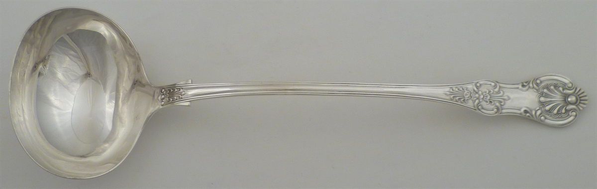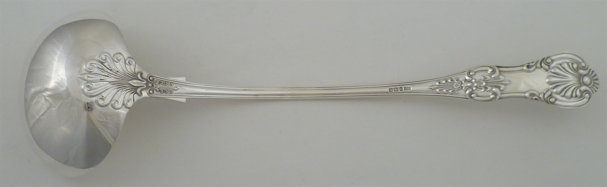 DESCRIPTION | Large and heavy Edwardian solid silver Queen's pattern soup ladle with no engraving or erasure. |