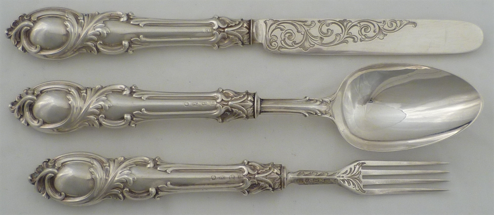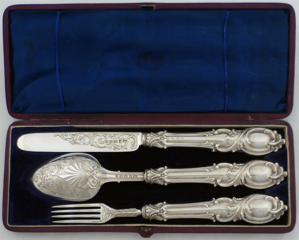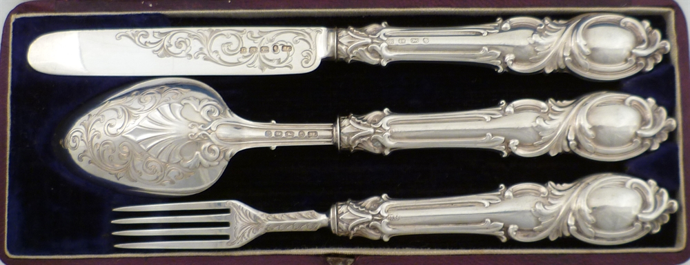 DESCRIPTION | Superb Victorian silver three piece christening set within original silk and velvet lined case. The pattern is a rococo variant of King's with additional engraved scrolling decoration. |