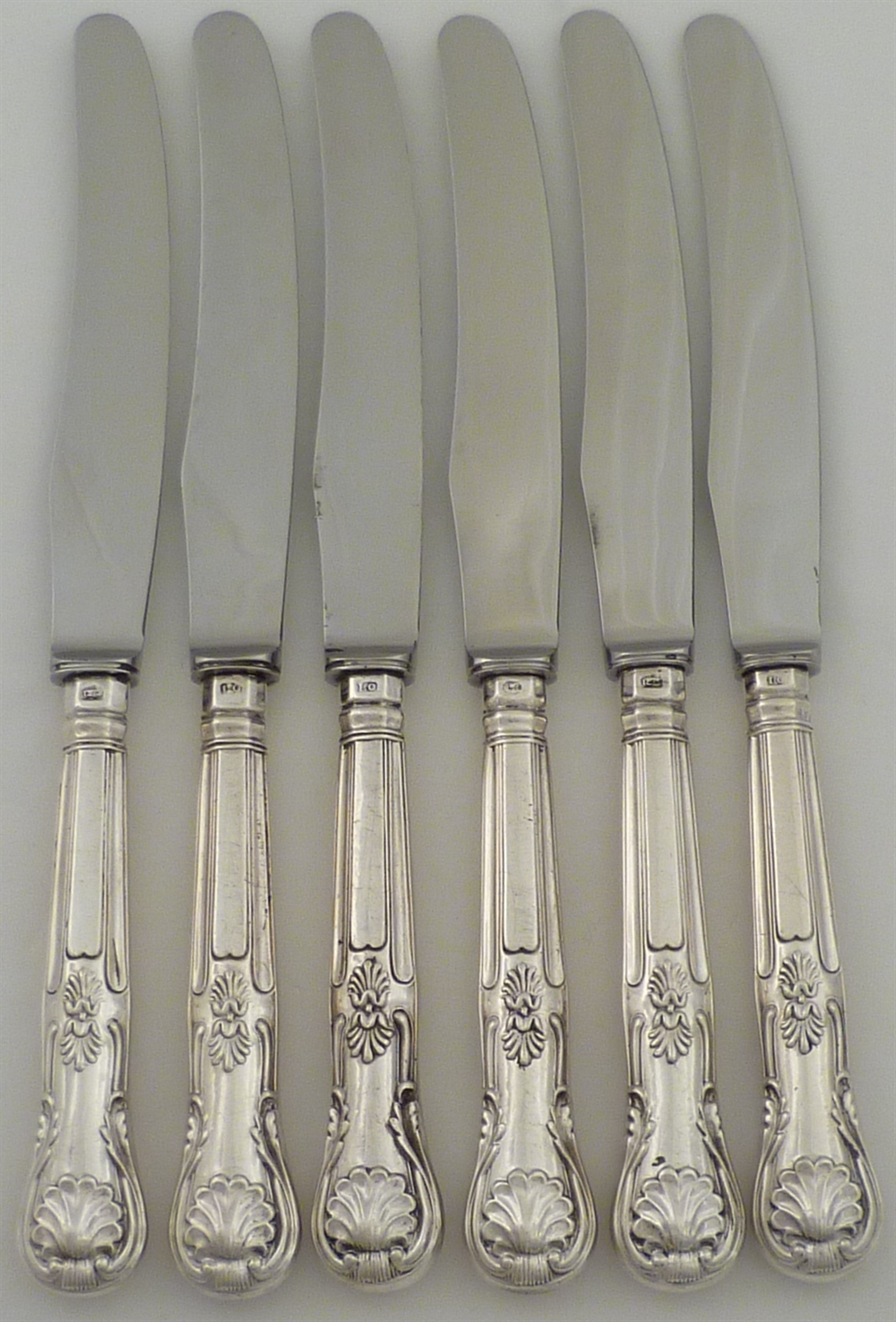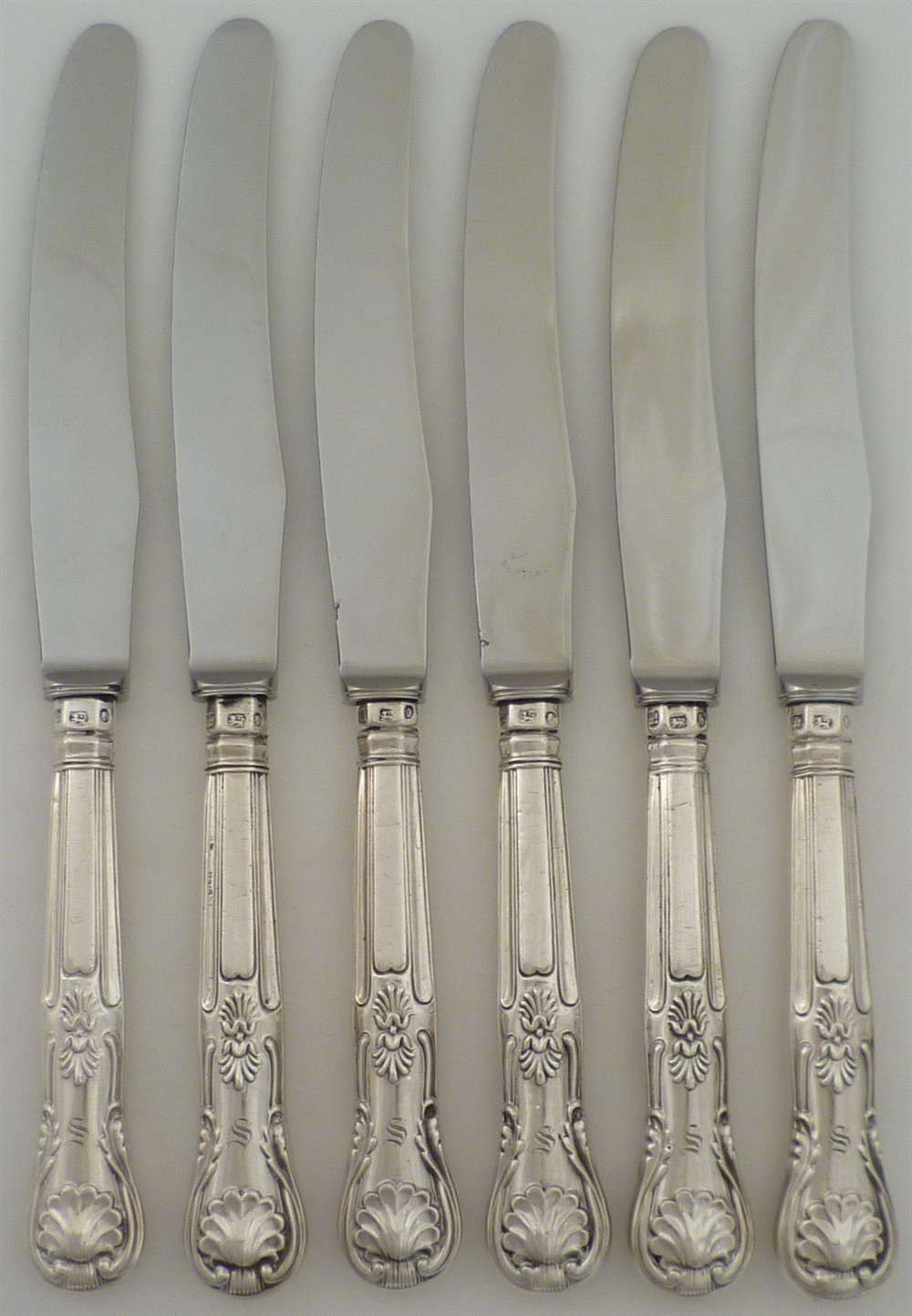 DESCRIPTION | Set of six Victorian silver handled King's pattern dessert or salad knives with an initial 'S' engraving. |