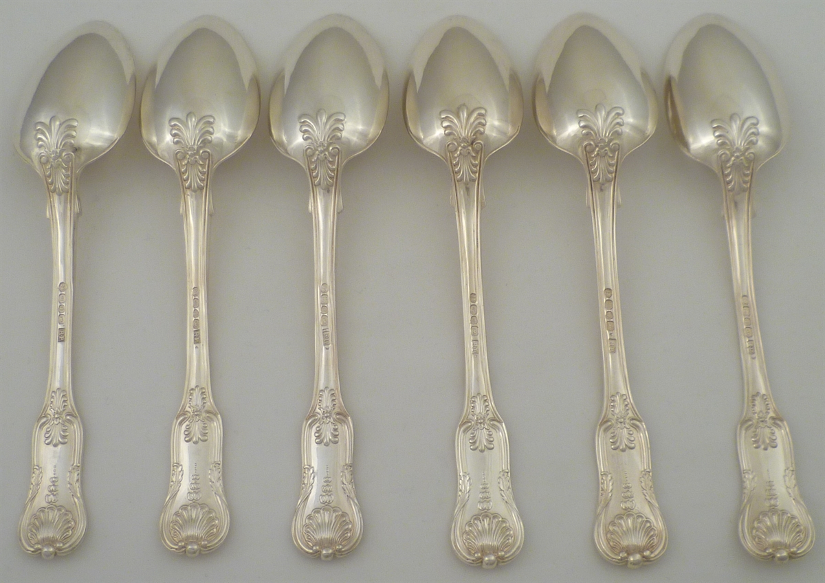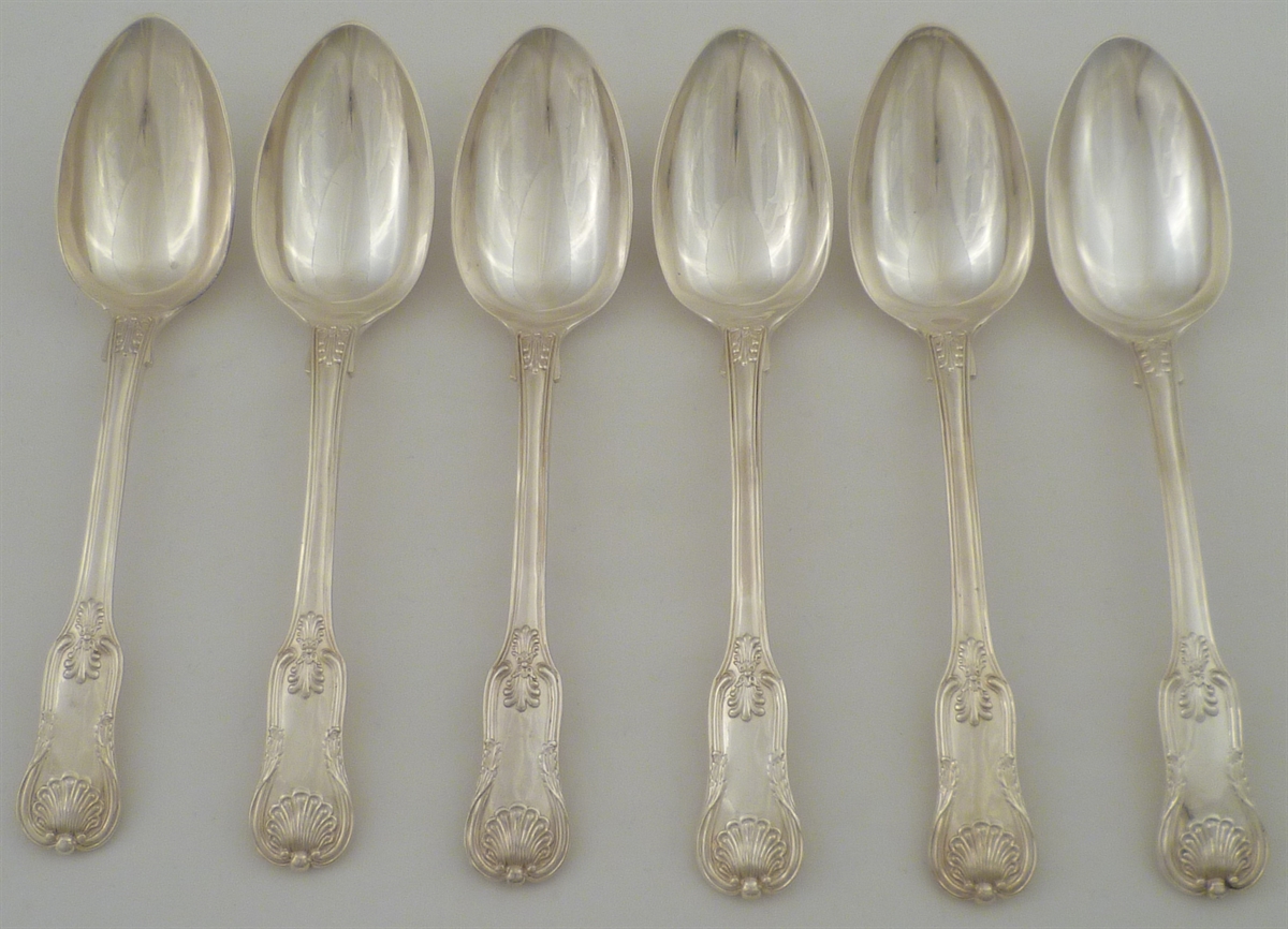 DESCRIPTION | Superb set of six large and heavy Georgian silver King's Honeysuckle pattern with Honeysuckle heel table or serving spoons. |