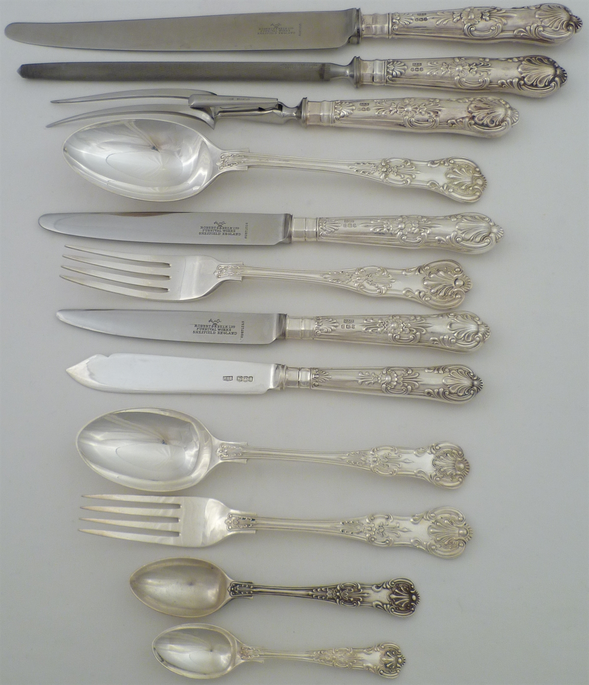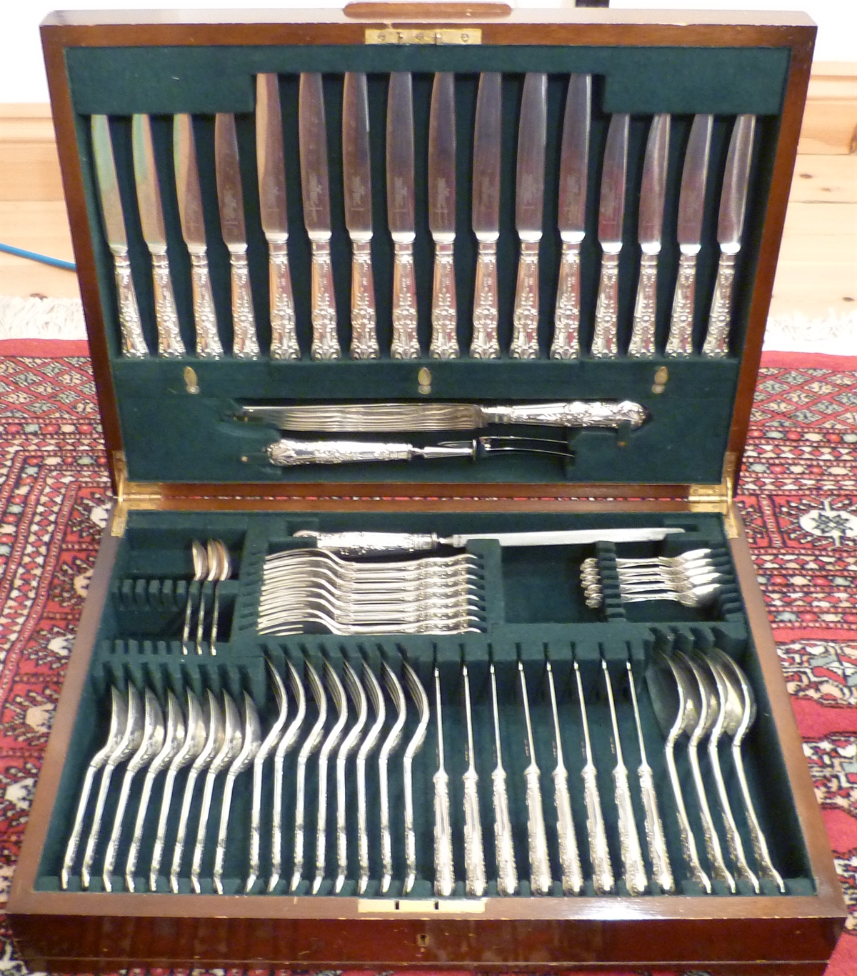 DESCRIPTION | Good quality solid silver canteen of Queen's pattern within a felt lined wooden case comprising of; Four large and heavy table or serving spoons 9 ¼", 235mm, 512g. Unused condition. Eight large and heavy table forks 8 ½", 213mm, 905g. Unused condition. Eight dessert spoons 7 ½", 194mm, 612g. Unused condition. Eight dessert or salad forks 7 ¼", 186mm, 625g. Unused condition. Eight table knives with stainless steel blades and soldered joints so can be safely cleaned in a dish washer. 10", 256mm, total 566g. Unused condition. Eight fish knives with solid silver blades and soldered joints so can be safely cleaned in a dish washer. 8 ½", 214mm, total 516g. Unused condition. Eight dessert, salad or cheese knives with stainless steel blades and soldered joints so can be safely cleaned in a dish washer. 9", 226mm, total 455g. Unused condition. Three piece carving set with soldered joints so can be safely cleaned in a dish washer. Knife 14", 353mm, total 439g. Unused condition, some sharpening marks to knife blade. Three teaspoons 5 ¼", 136mm, 92g. Signs of use including small bowl bump and bowl tip wear. Five coffee spoons 4 ½", 115mm, 99g. |