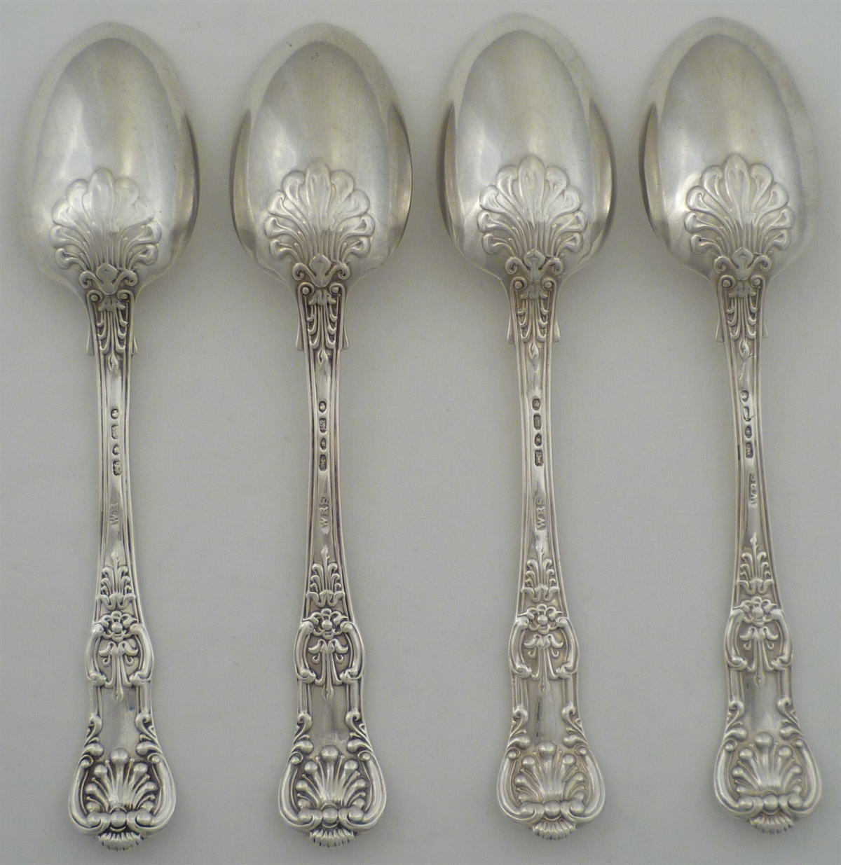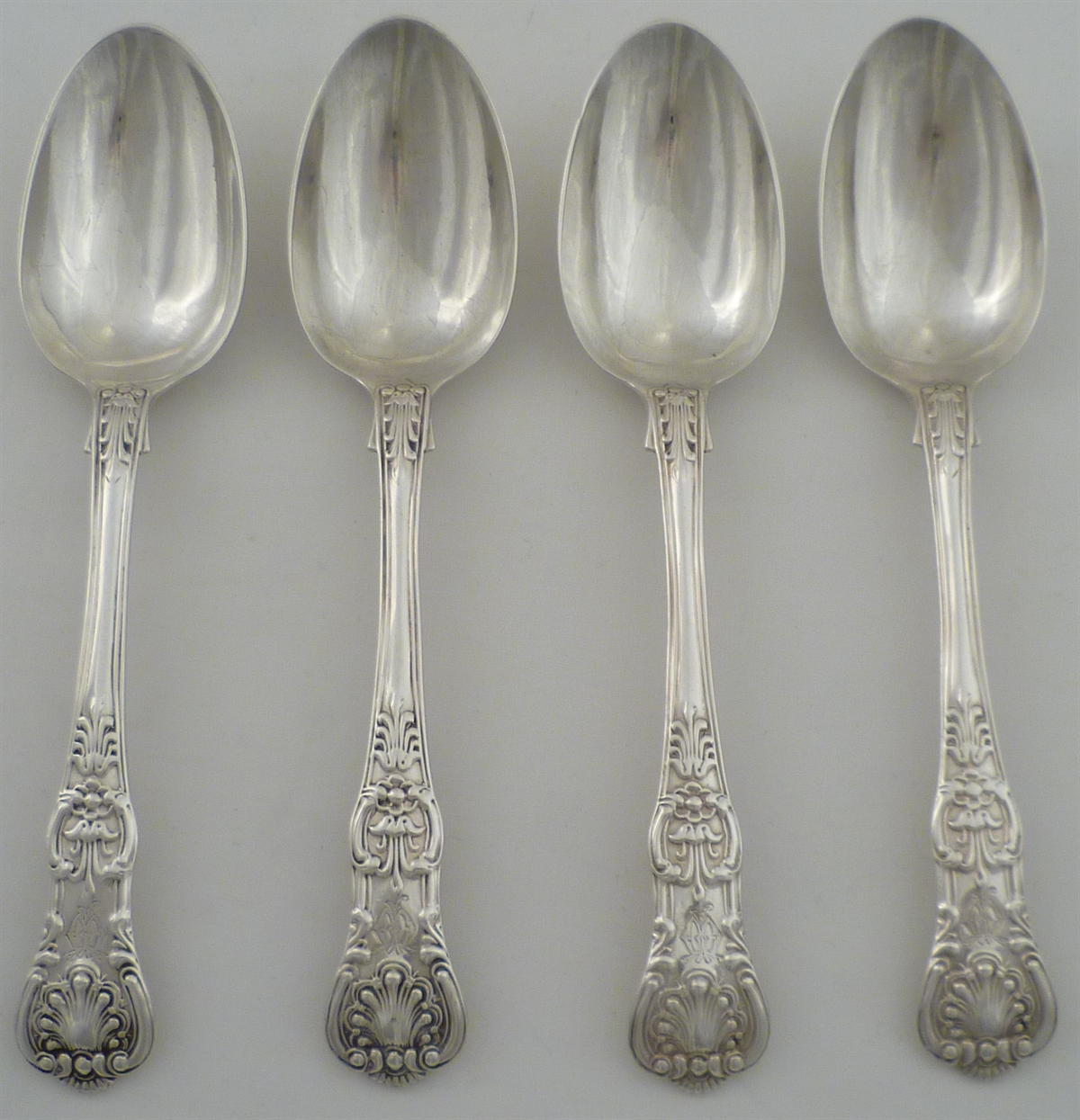 DESCRIPTION | Four Victorian solid silver Queen's pattern dessert spoons with a frontal monogram engraving possibly over an erasure. |