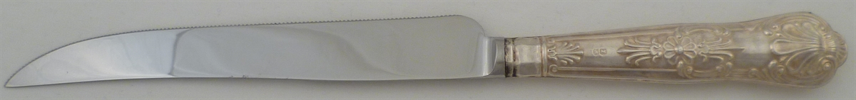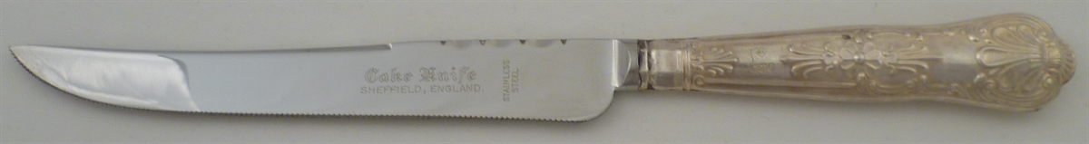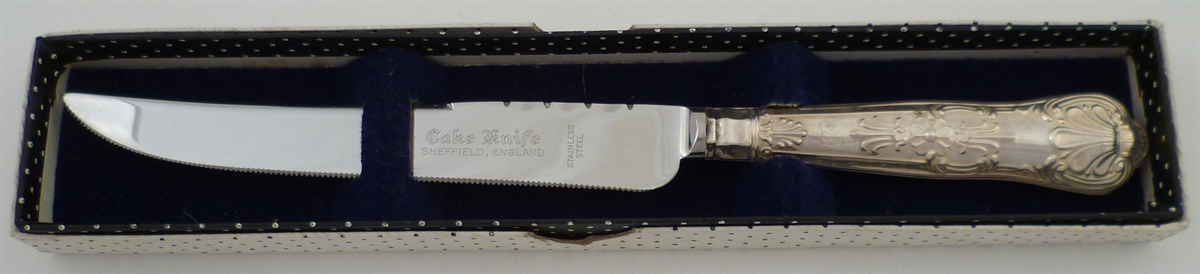 DESCRIPTION | Cake knife with double struck Queen's pattern loaded silver handle and polished stainless steel blade, complete with original box. |