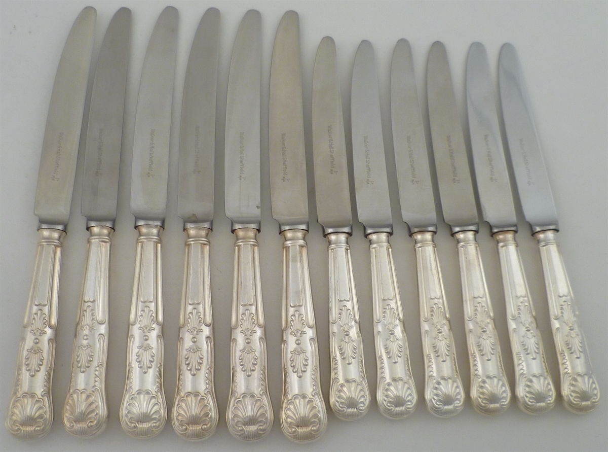 The six King's pattern table knives and dessert/salad knives have no engraving or erasure and are silver-plated with stainless steel blades