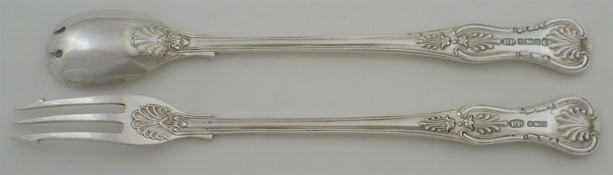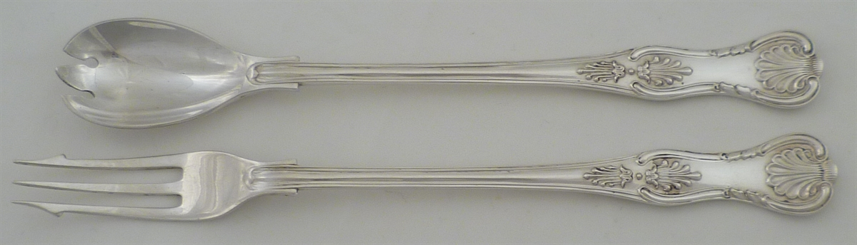 DESCRIPTION | Solid silver King's pattern with diamond shell heel olive spoon and pickle fork with no engraving or erasure. |