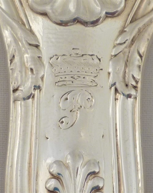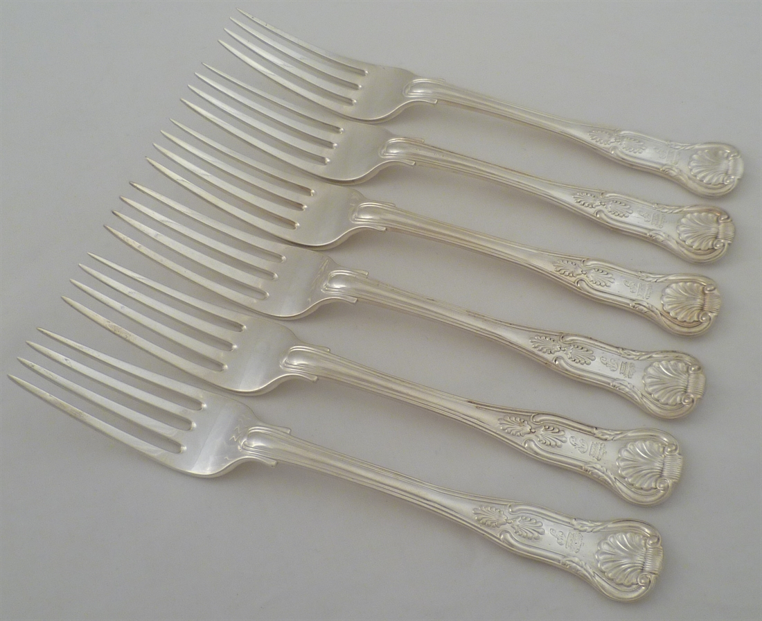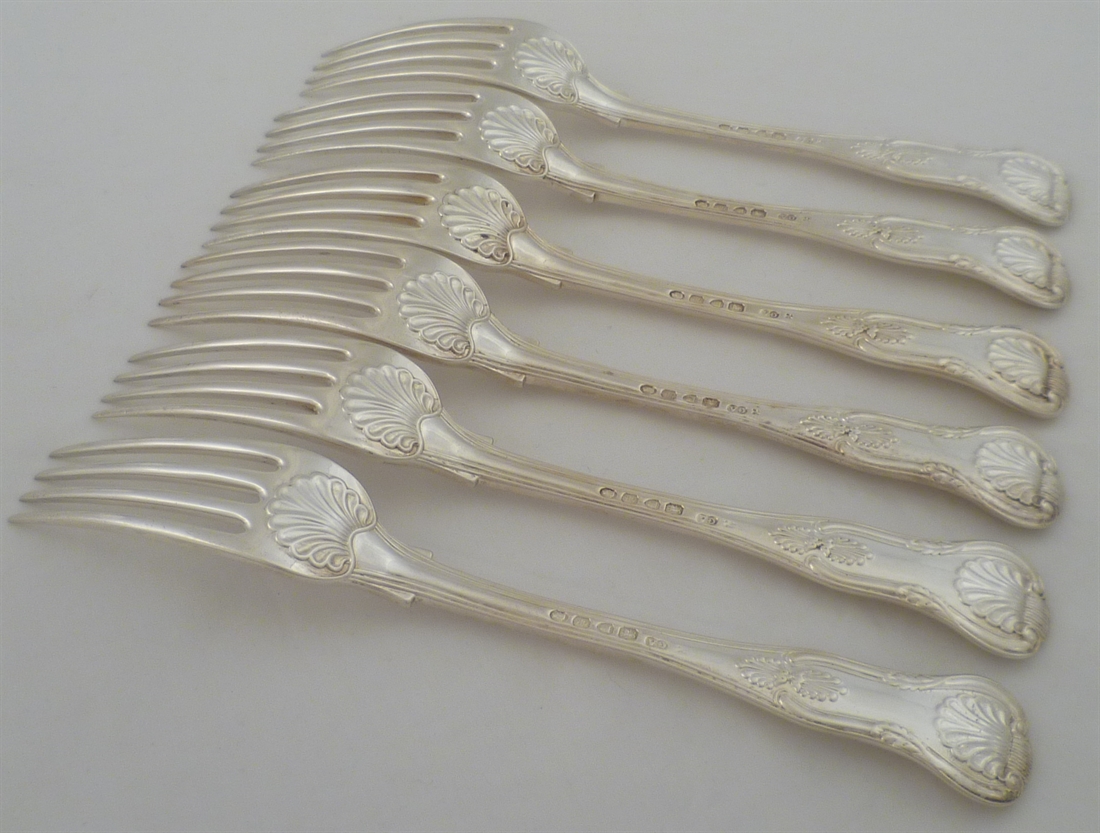 DESCRIPTION | Set of six Victorian solid silver King's pattern with Union Shell heel table forks with a frontally engraved initial below a coronet all over a sympathetically executed erasure. |