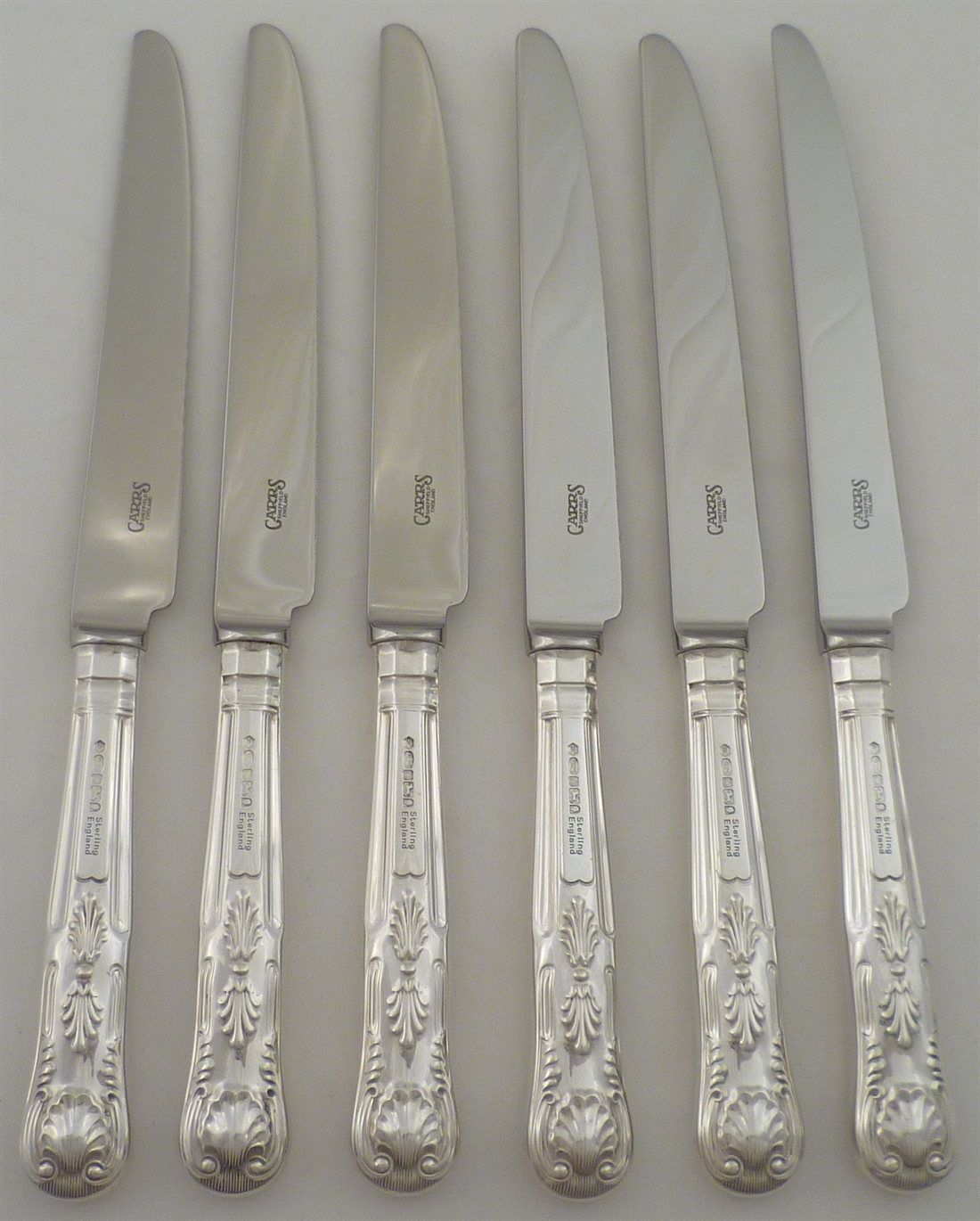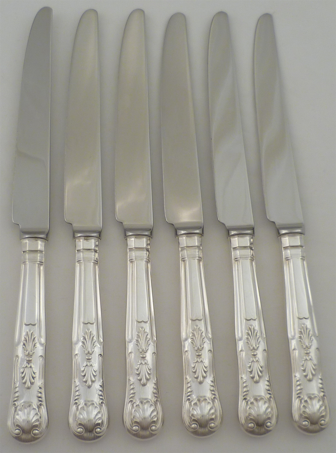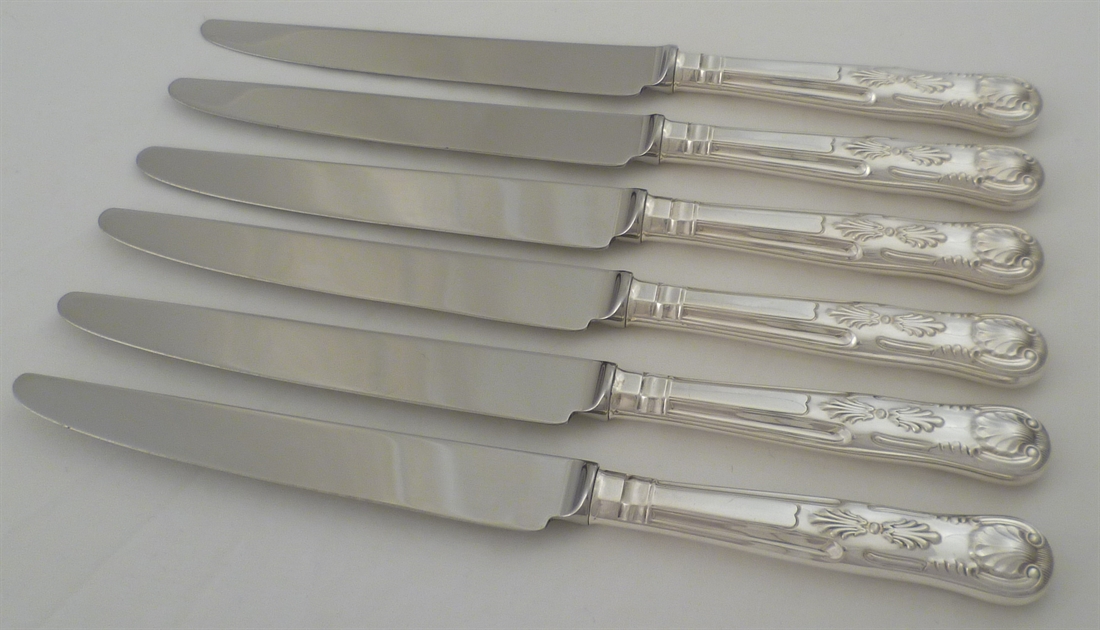 DESCRIPTION | Modern set of six highest quality loaded silver handled King's pattern table knives with no engraving and soldered joints so can be safely cleaned in a dishwasher. Mirror finished finger point stainless steel blades. |