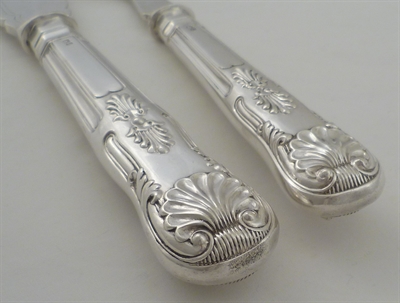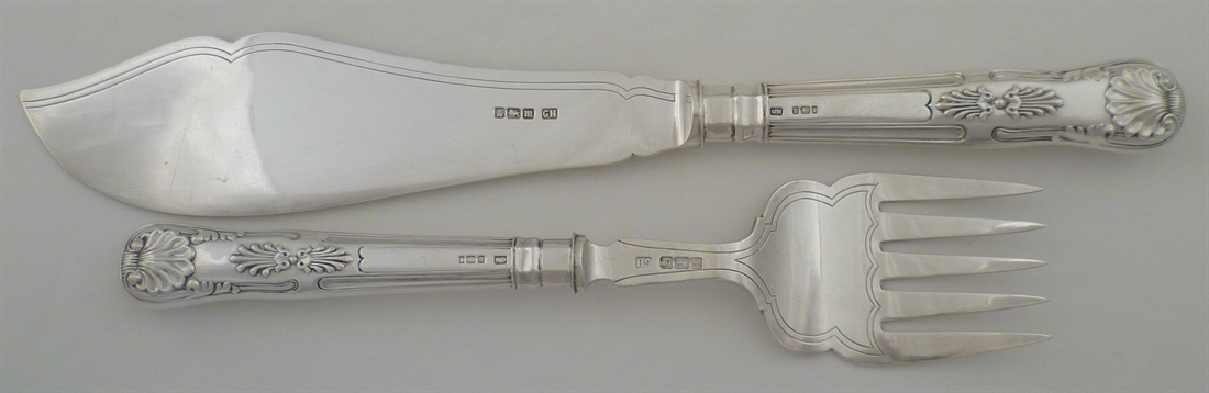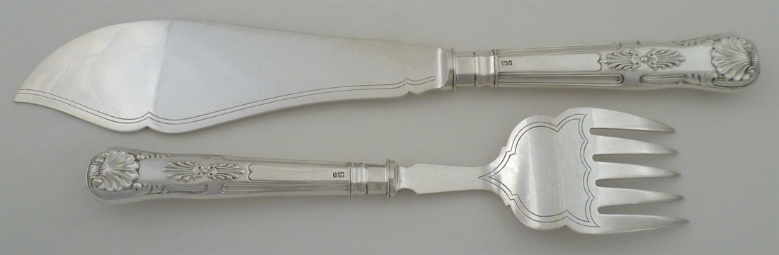 Superb and large Edwardian silver King's pattern serving knife and fork with loaded silver handles and solid silver blade