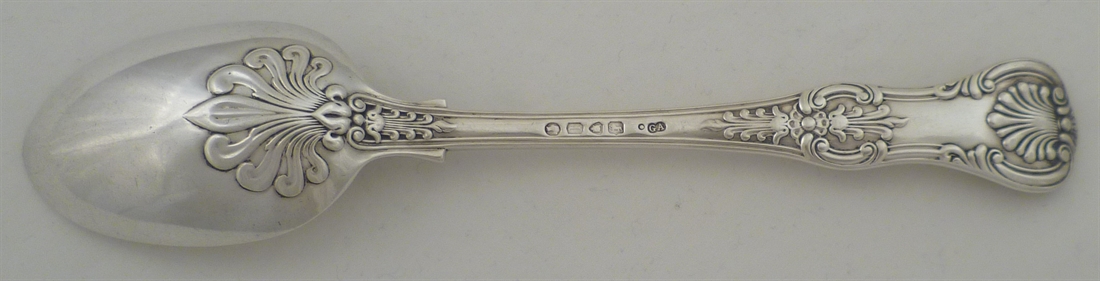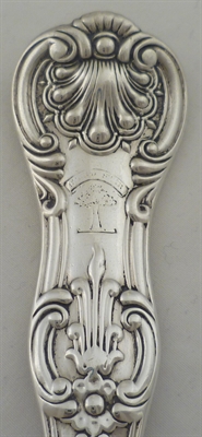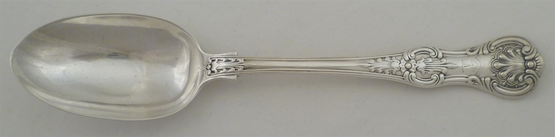 DESCRIPTION | Victorian solid silver Queen's pattern table or serving spoon with a frontal crest and motto engraving. The motto is rubbed on this example but matches others that I have listed and reads 'stand sure'. |