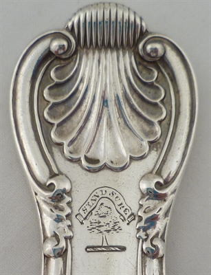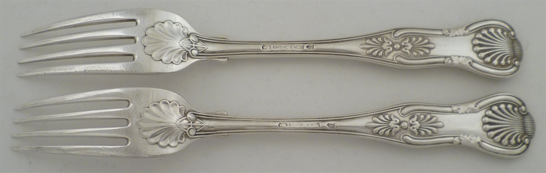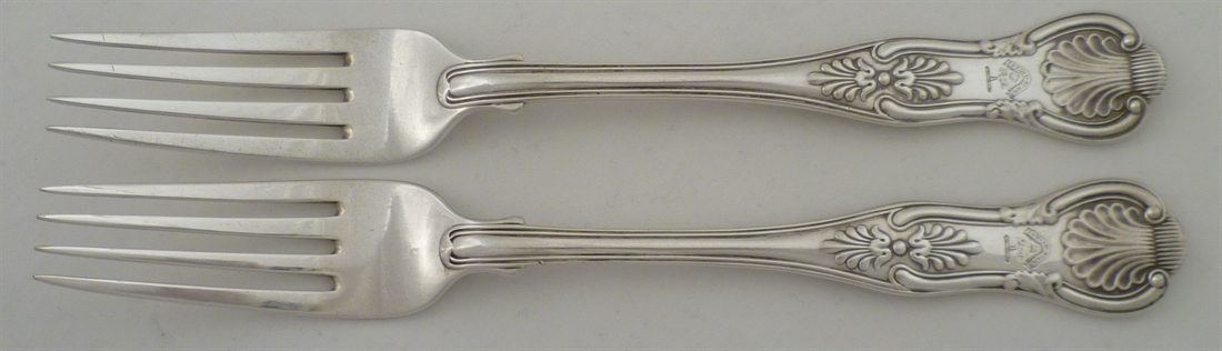 DESCRIPTION | Pair of Victorian solid silver King's pattern table forks with a frontal crest and motto engraving. |