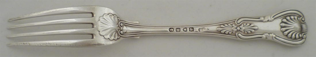 DESCRIPTION | Victorian solid silver King's pattern table fork with a frontal crest and motto engraving. |