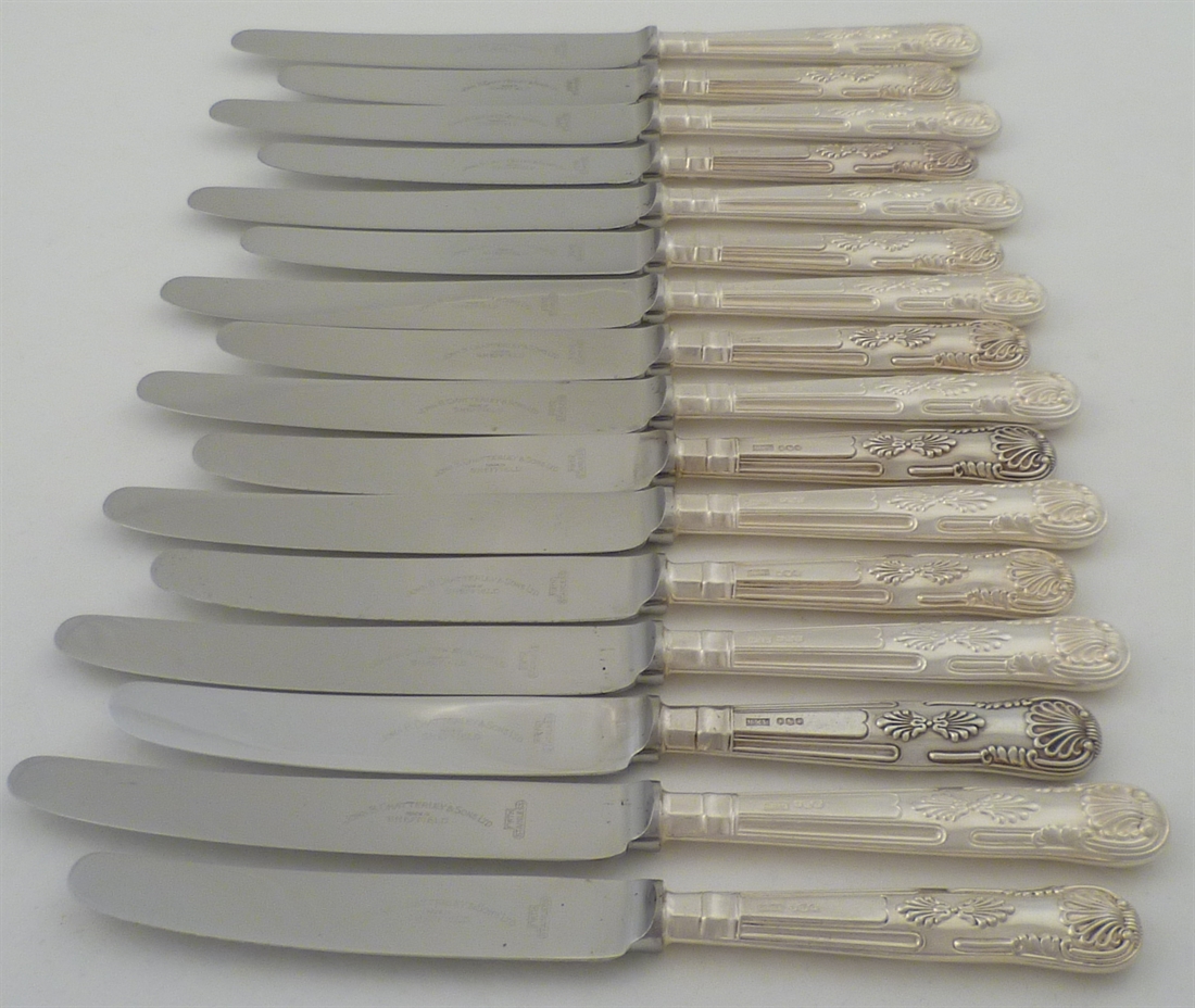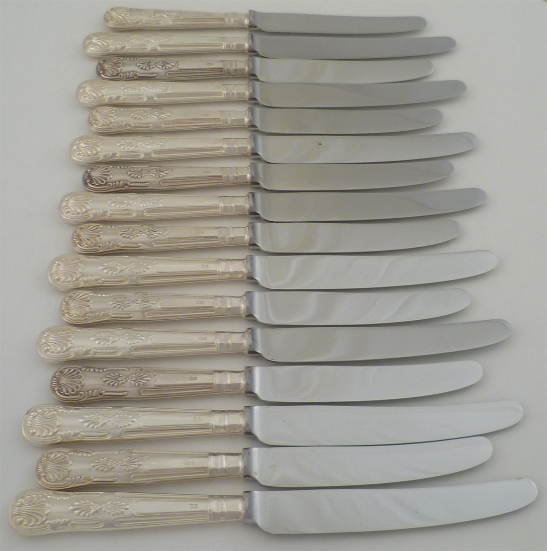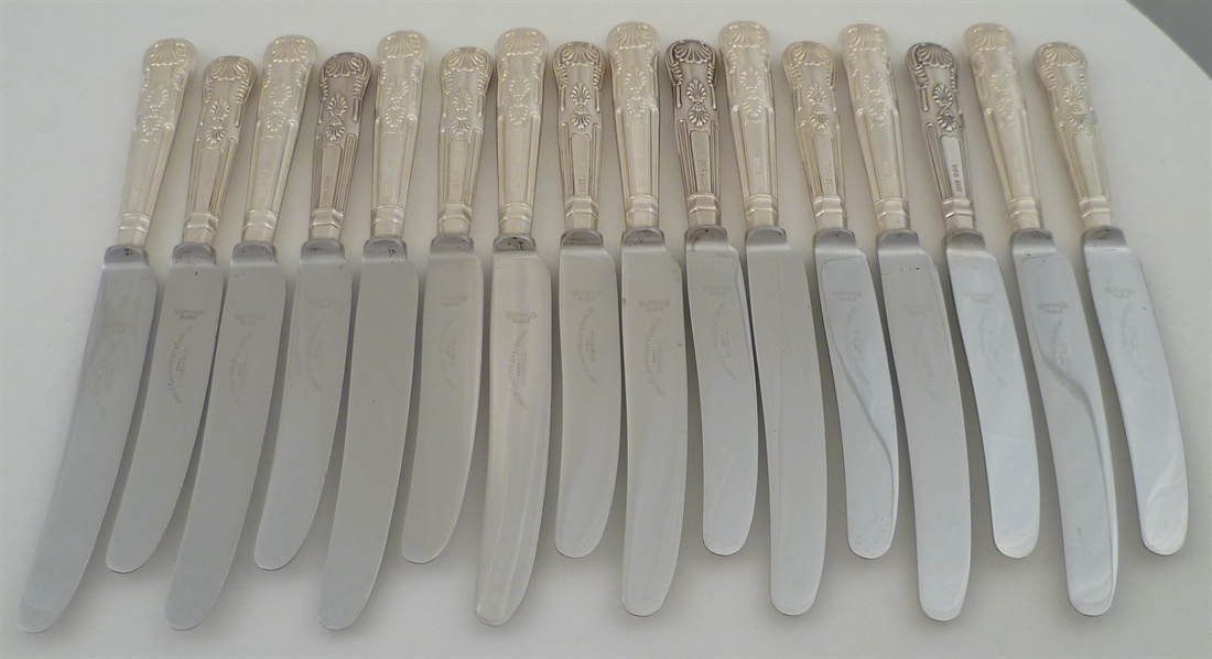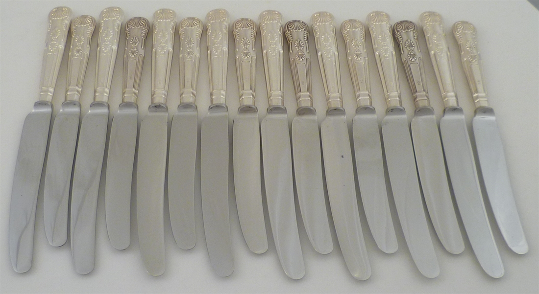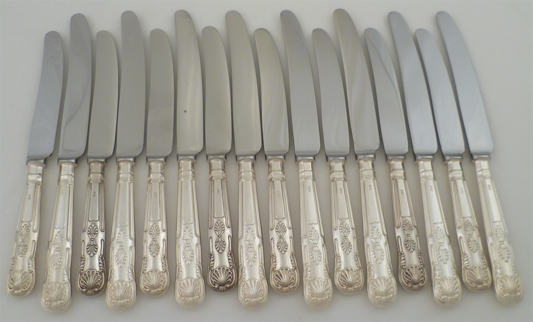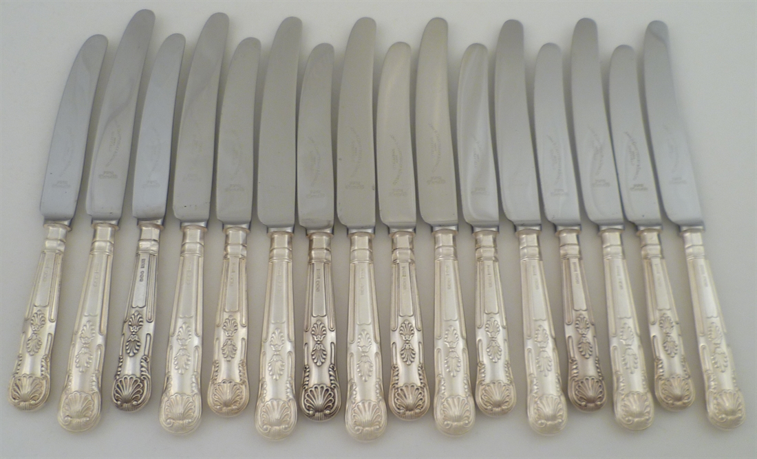 High quality set of sixteen King's pattern knives with loaded silver handles and mirror finished