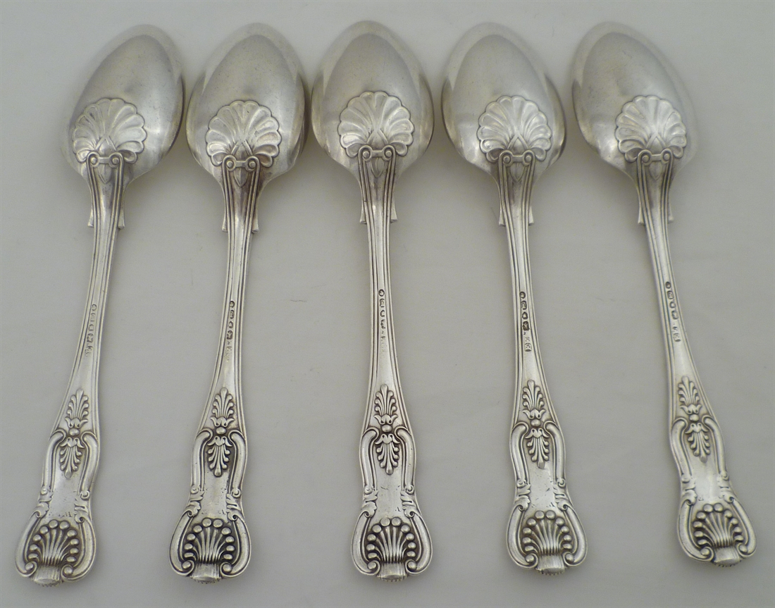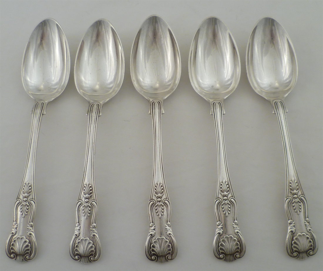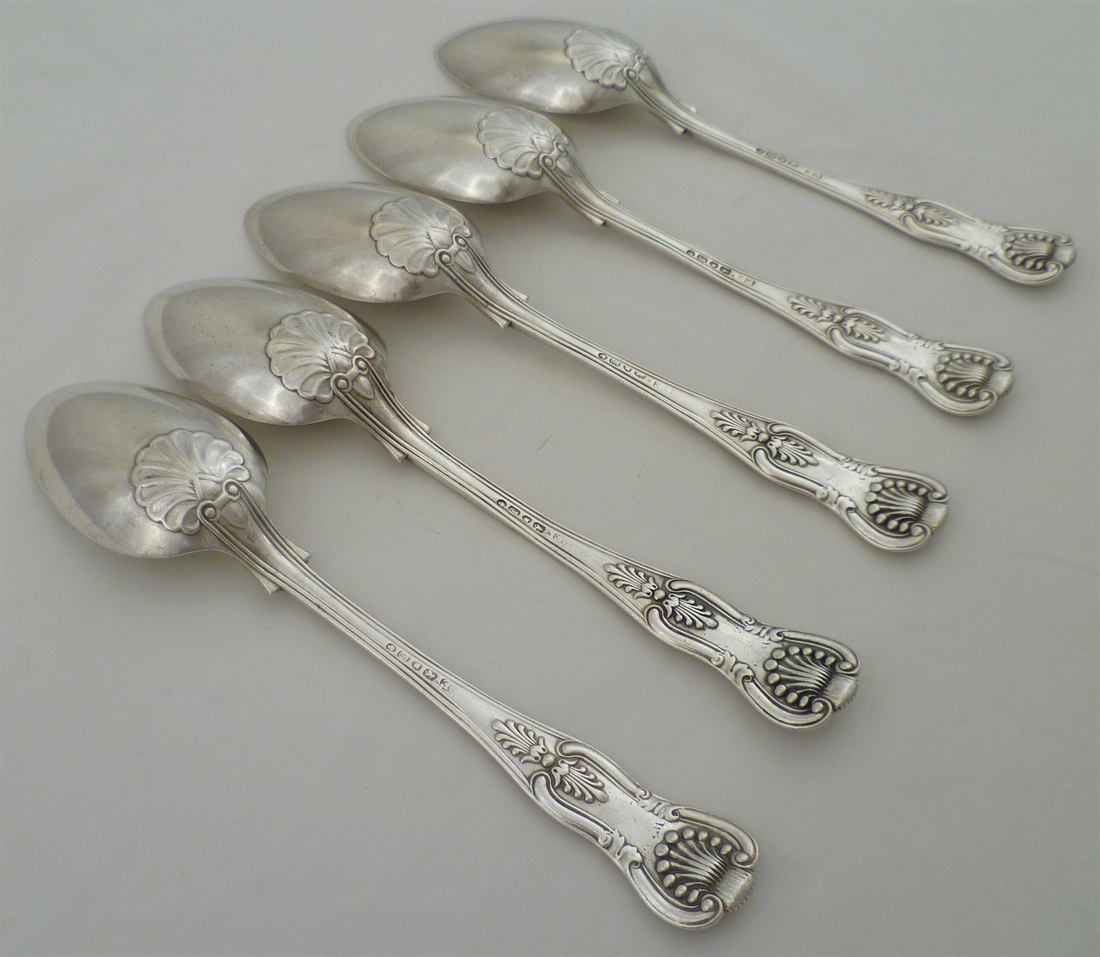 DESCRIPTION | Five Victorian solid silver King's pattern dessert spoons with sympathetic erasure verso. |
