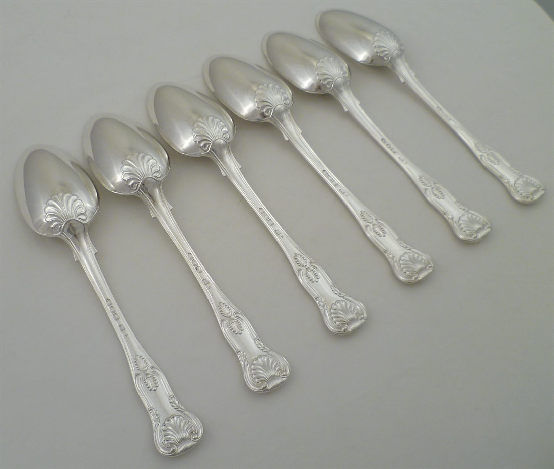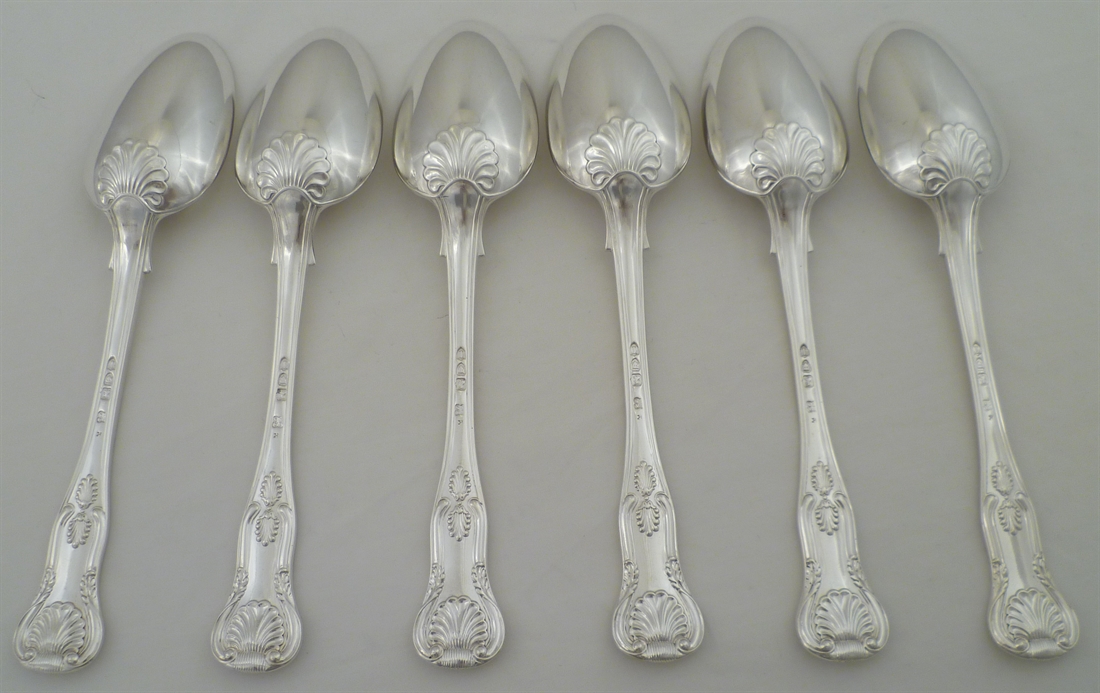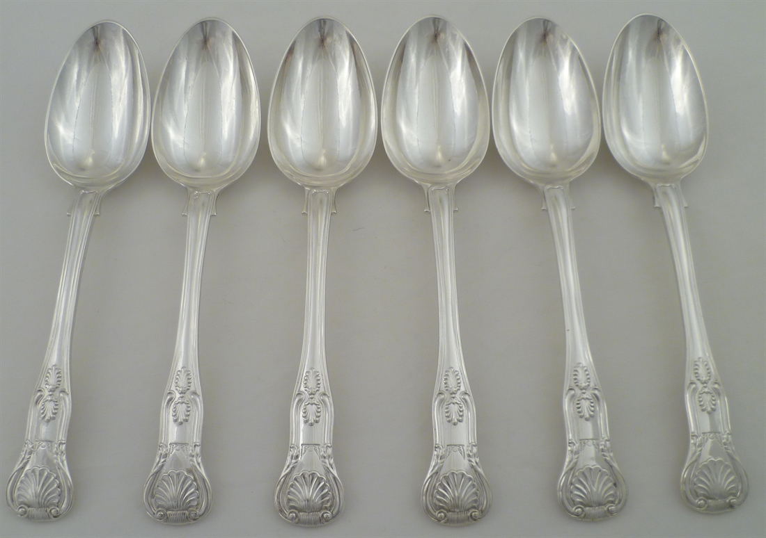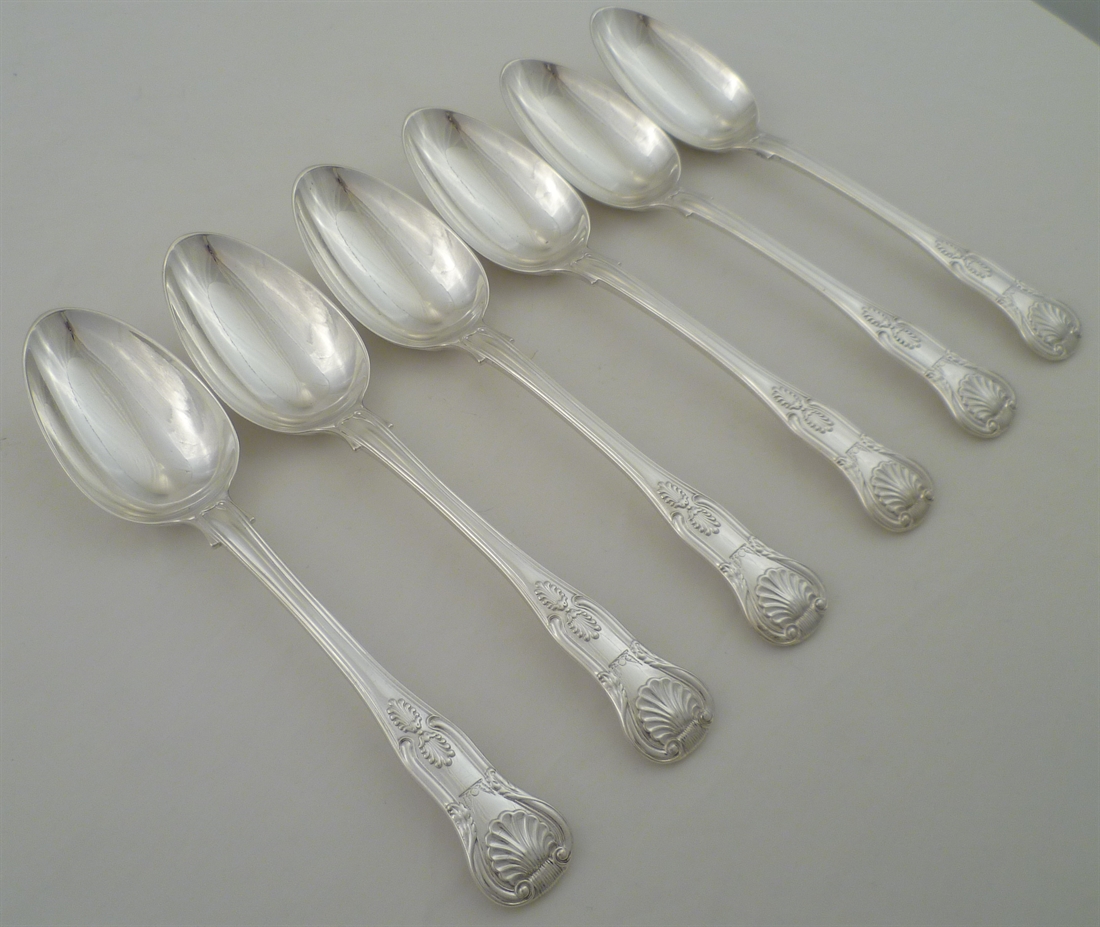 DESCRIPTION | Superb set of six Victorian solid silver King's pattern table spoons with union shell heels and frontal crest engraving. |