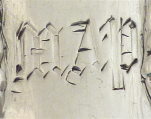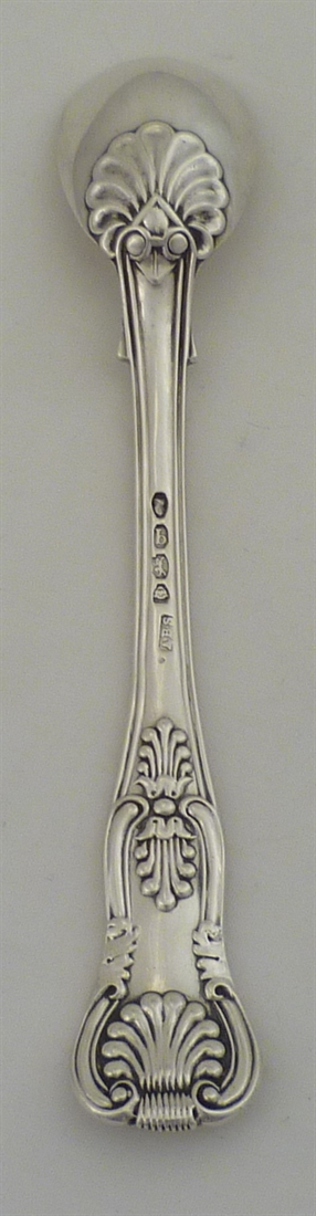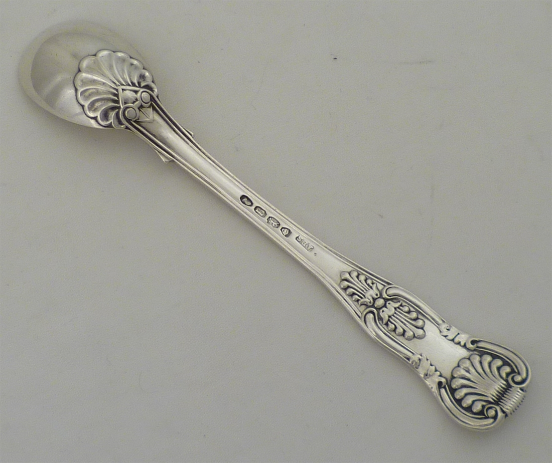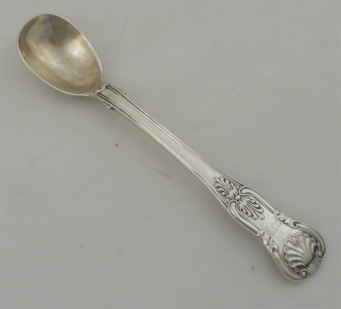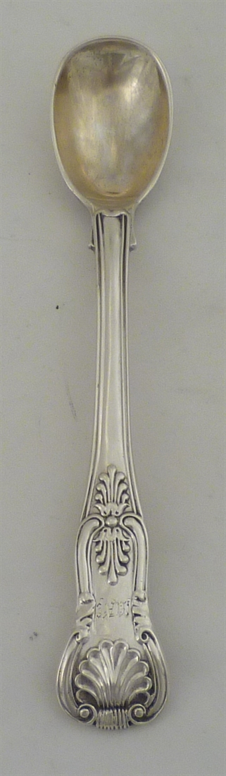 DESCRIPTION | Large and heavy William IV solid silver double struck King's pattern mustard ladle with a frontal monogram engraving over an erasure and a gilded bowl. |