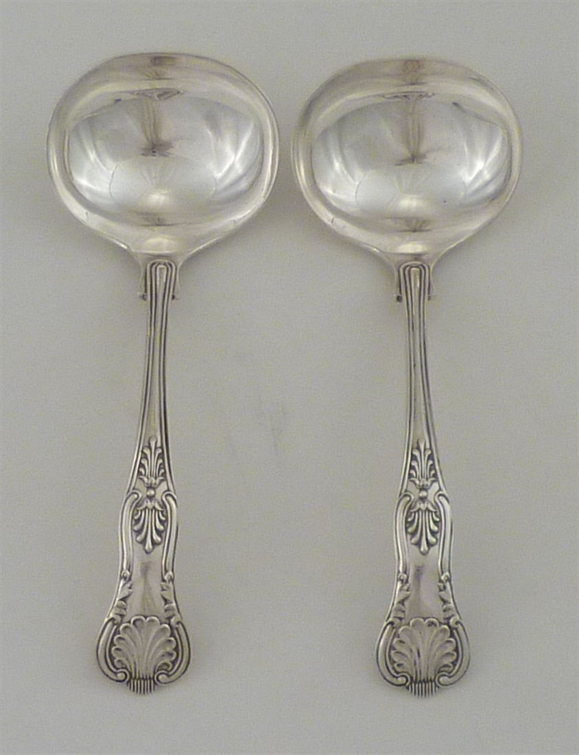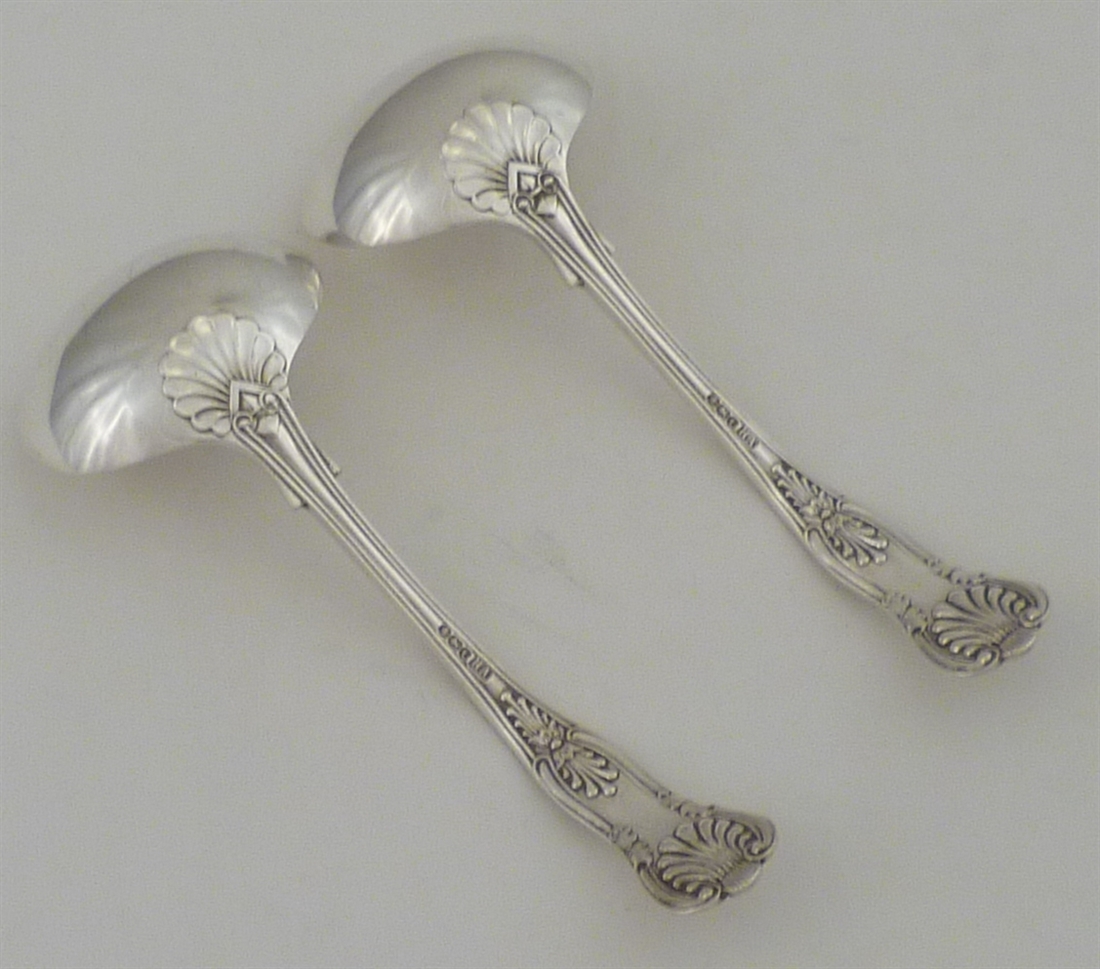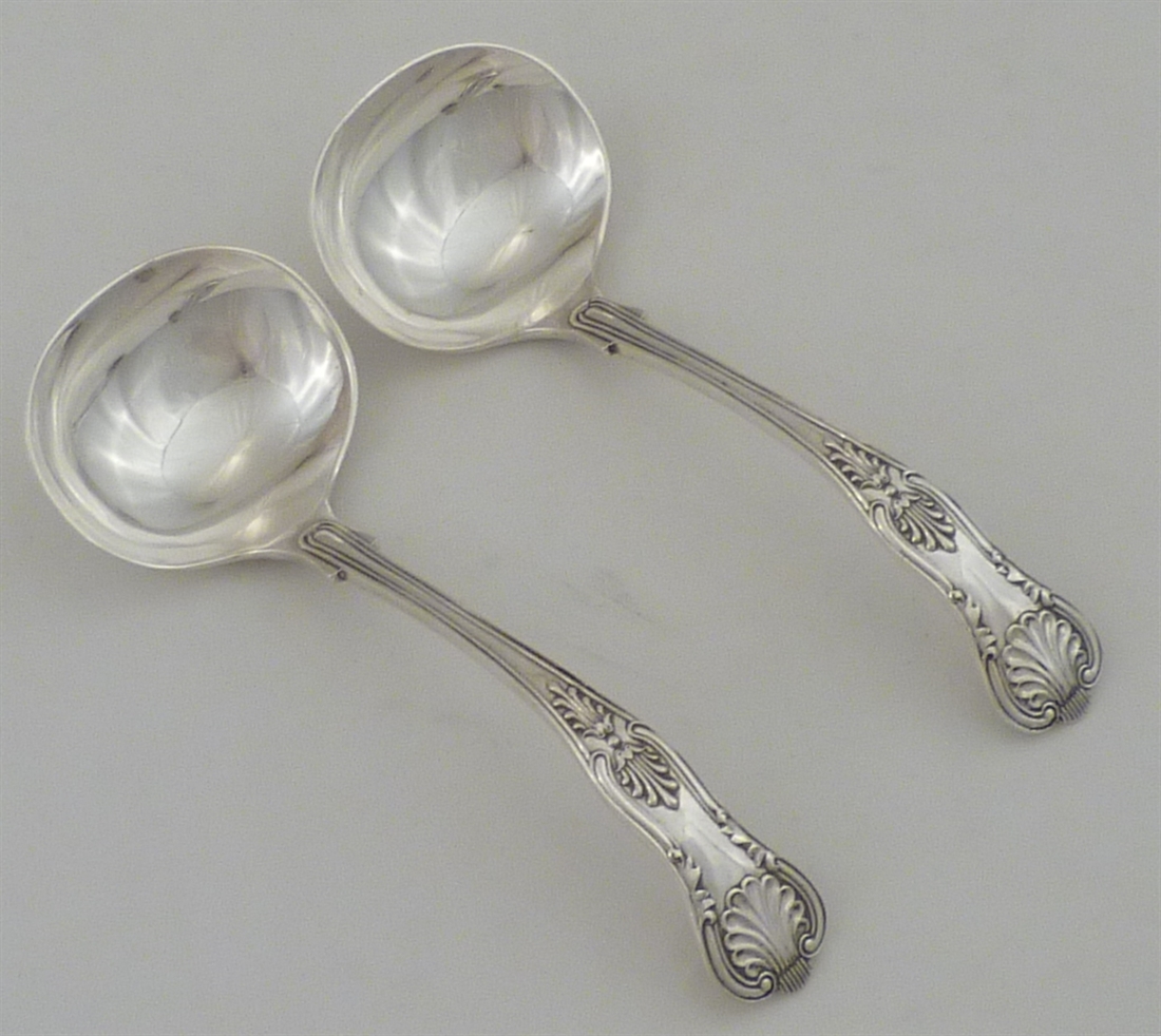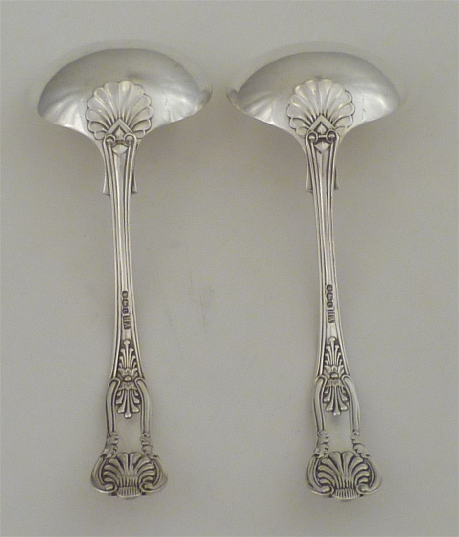 DESCRIPTION | Good pair of solid silver King's pattern sauce ladles with strongly curved stems and no engraving or erasure. |