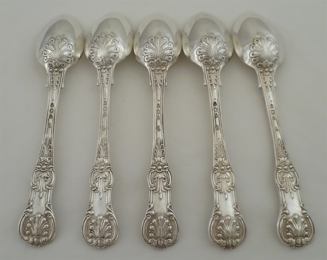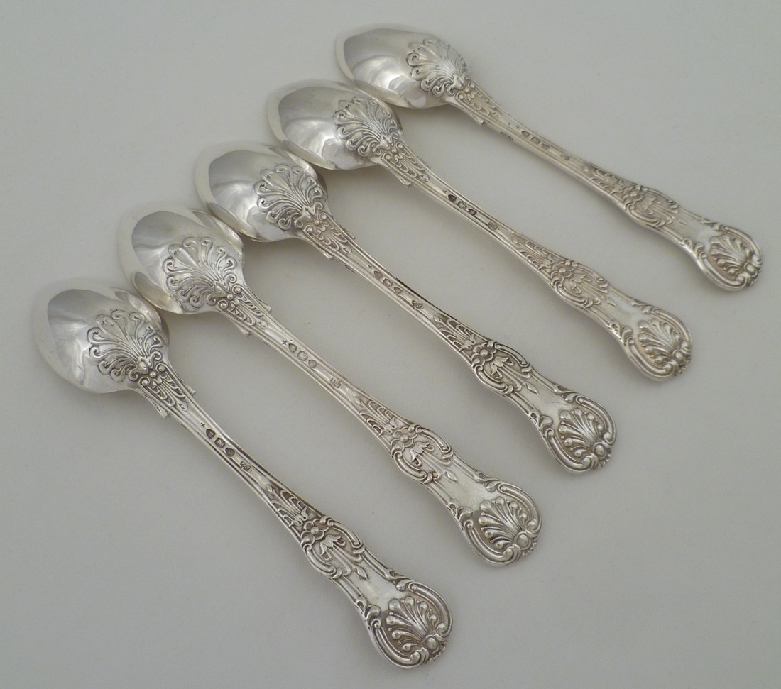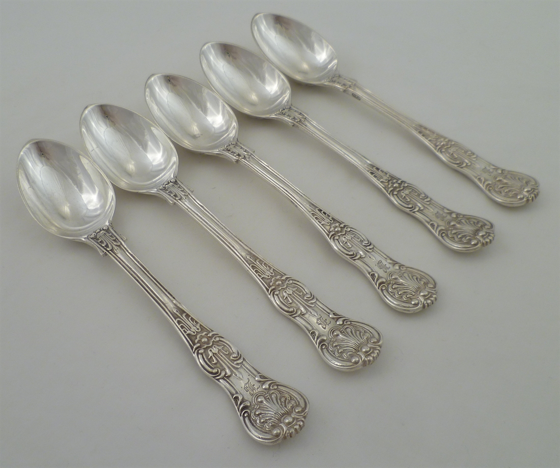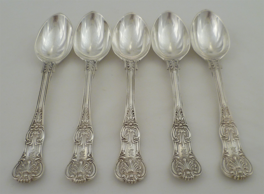 Set of five Victorian solid silver Queen's pattern teaspoons with frontal gothic 'B' engraving. Very unusually these have partial Russian hallmarks that pre-date the 1896 national mark so it is