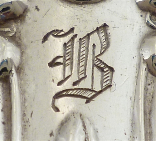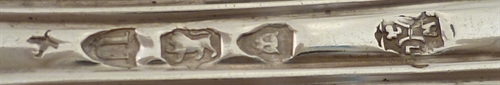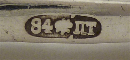 very likely that these spoons were exported to Russia immediately after manufacture. The Russian mark of 84 zolotniks (.875) is incorrect as the London sterling (.925) can clearly be seen. |