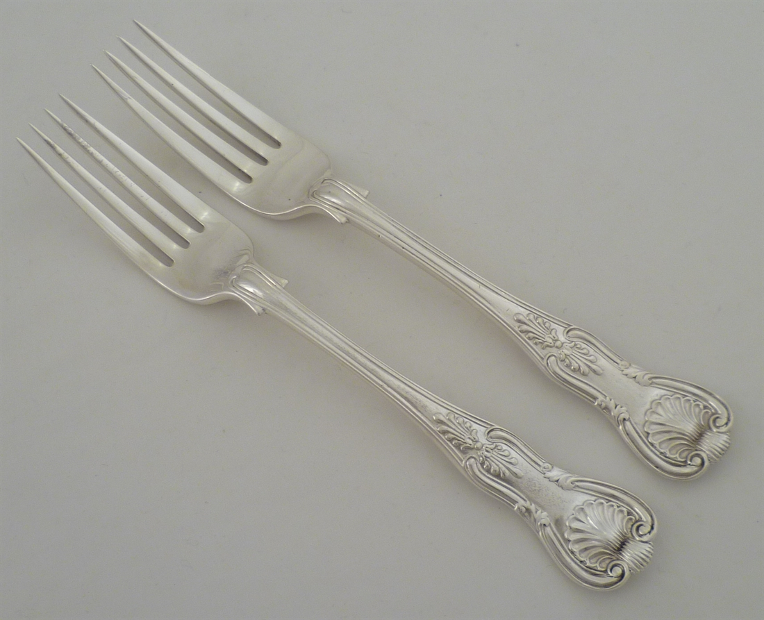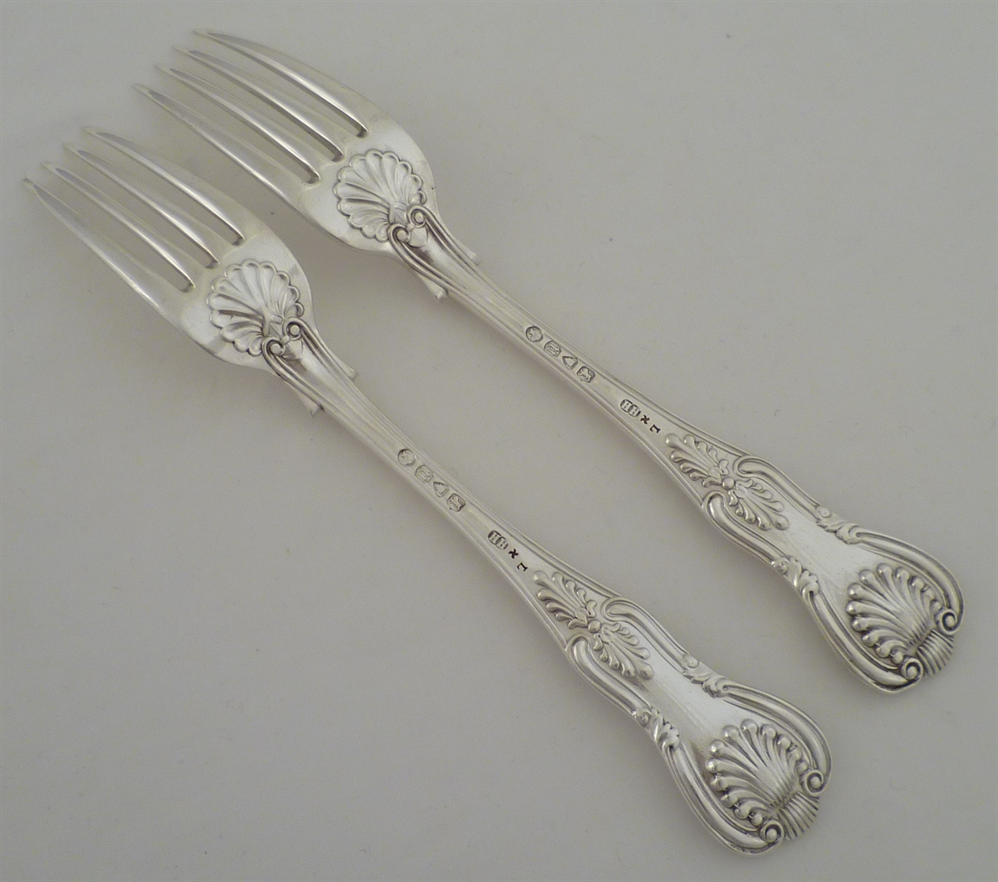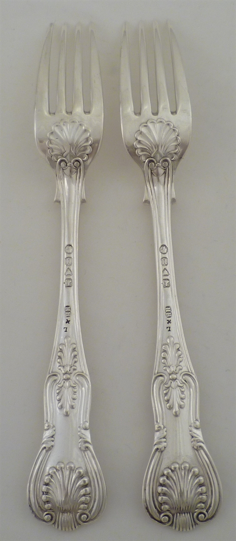 DESCRIPTION | Pair of heavy English Victorian solid sterling silver double struck King's pattern table forks with no engraving or erasure. |
