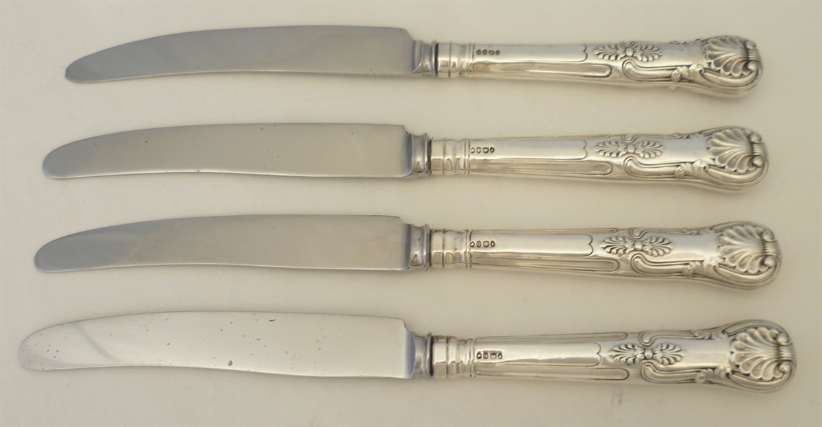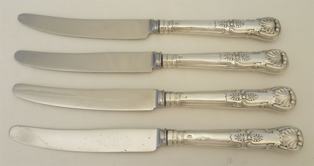 DESCRIPTION | Scarce set of four early Victorian English sterling silver King's pattern handled table knives with no engraving or erasure and good, clear hallmarks. The blades are later stainless steel replacements and could be updated to new but I think these have many more years left. Traditional pitch loading so best not to clean in a hot modern dishwasher. |