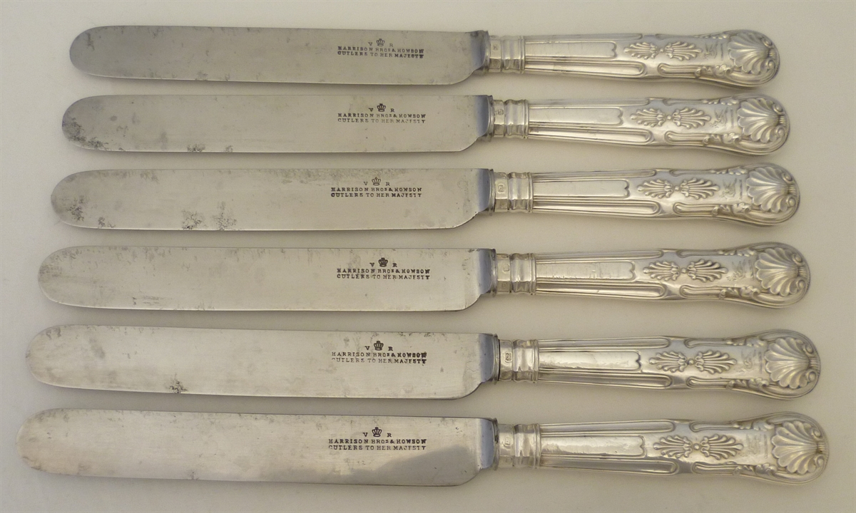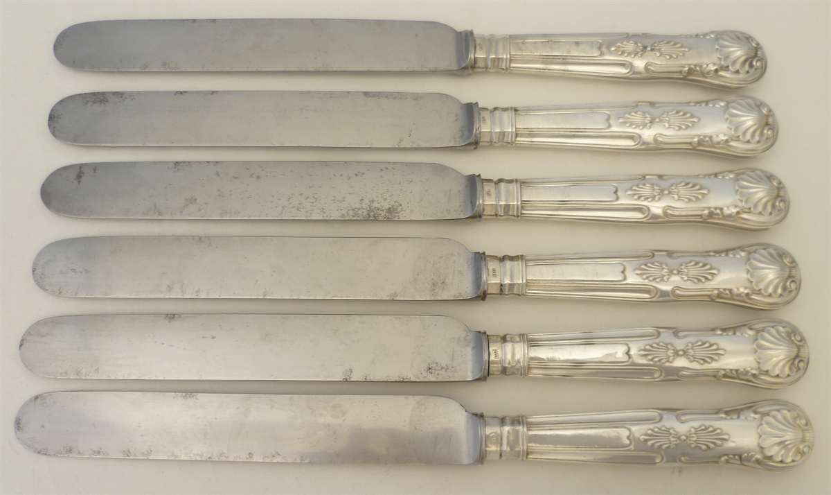 DESCRIPTION | Scarce set of six Victorian English sterling silver King's pattern handled table knives with a discreet crest engraving. The blades are the original wide and thick steel and all have a clear and matching cutler's mark which in this instance is that of the silversmith too. Traditional pitch loading so best not to clean in a hot modern dishwasher. |