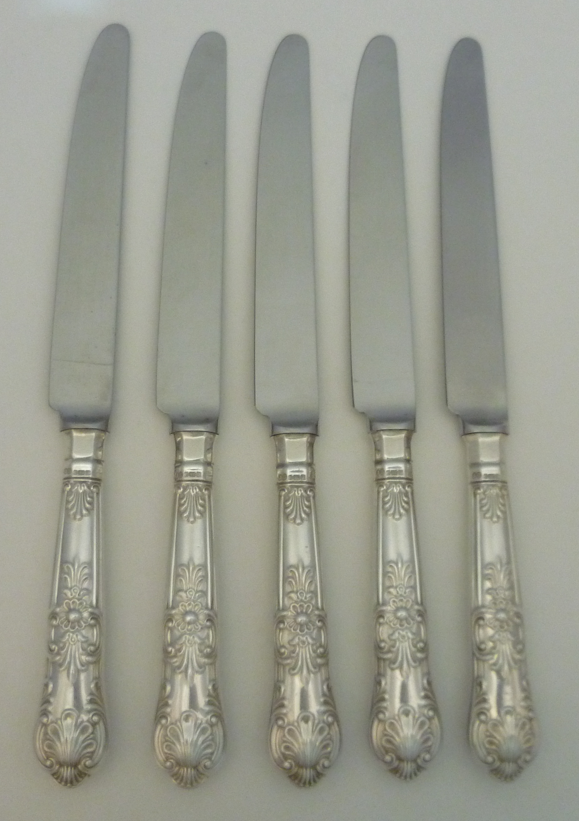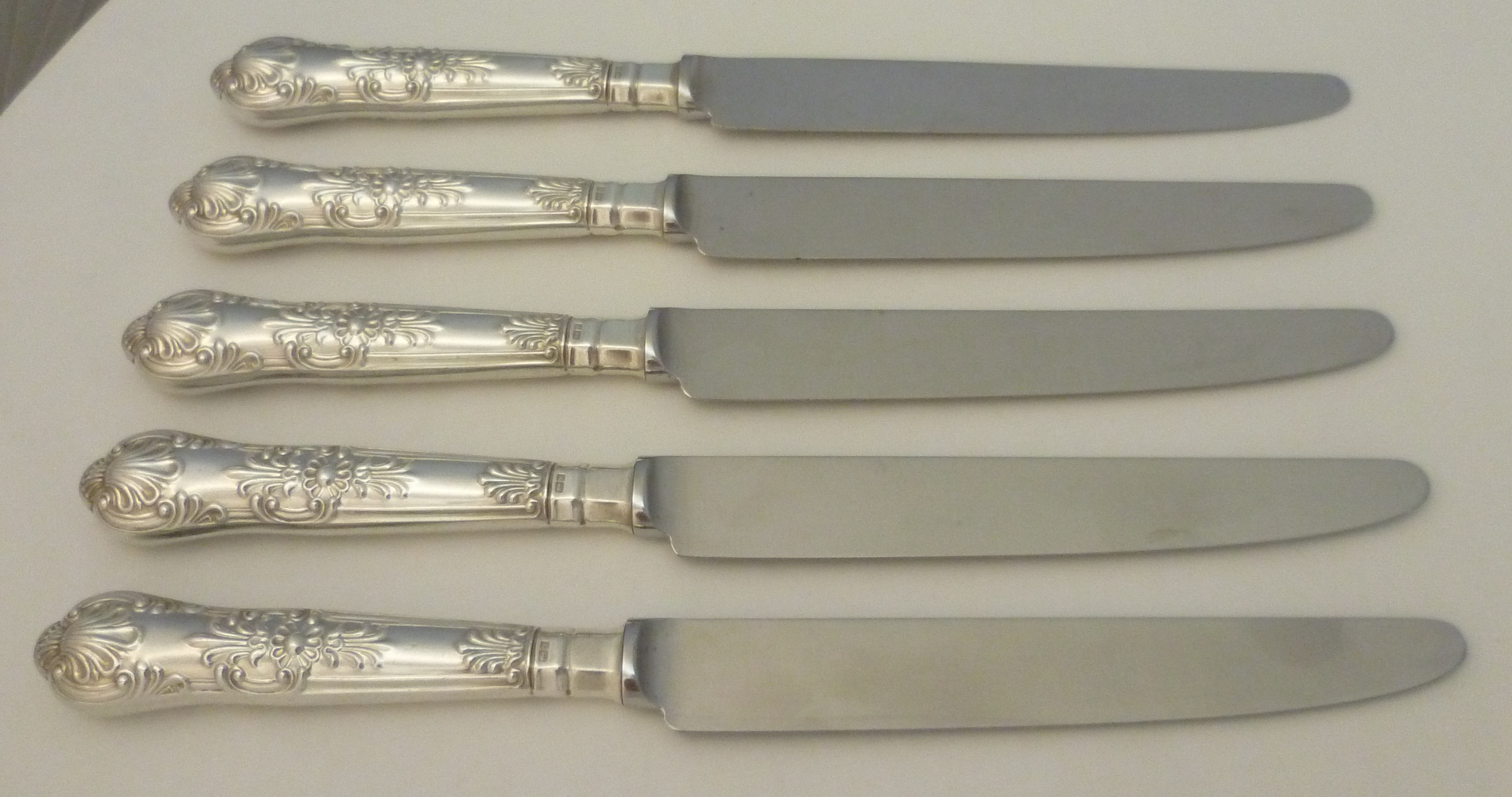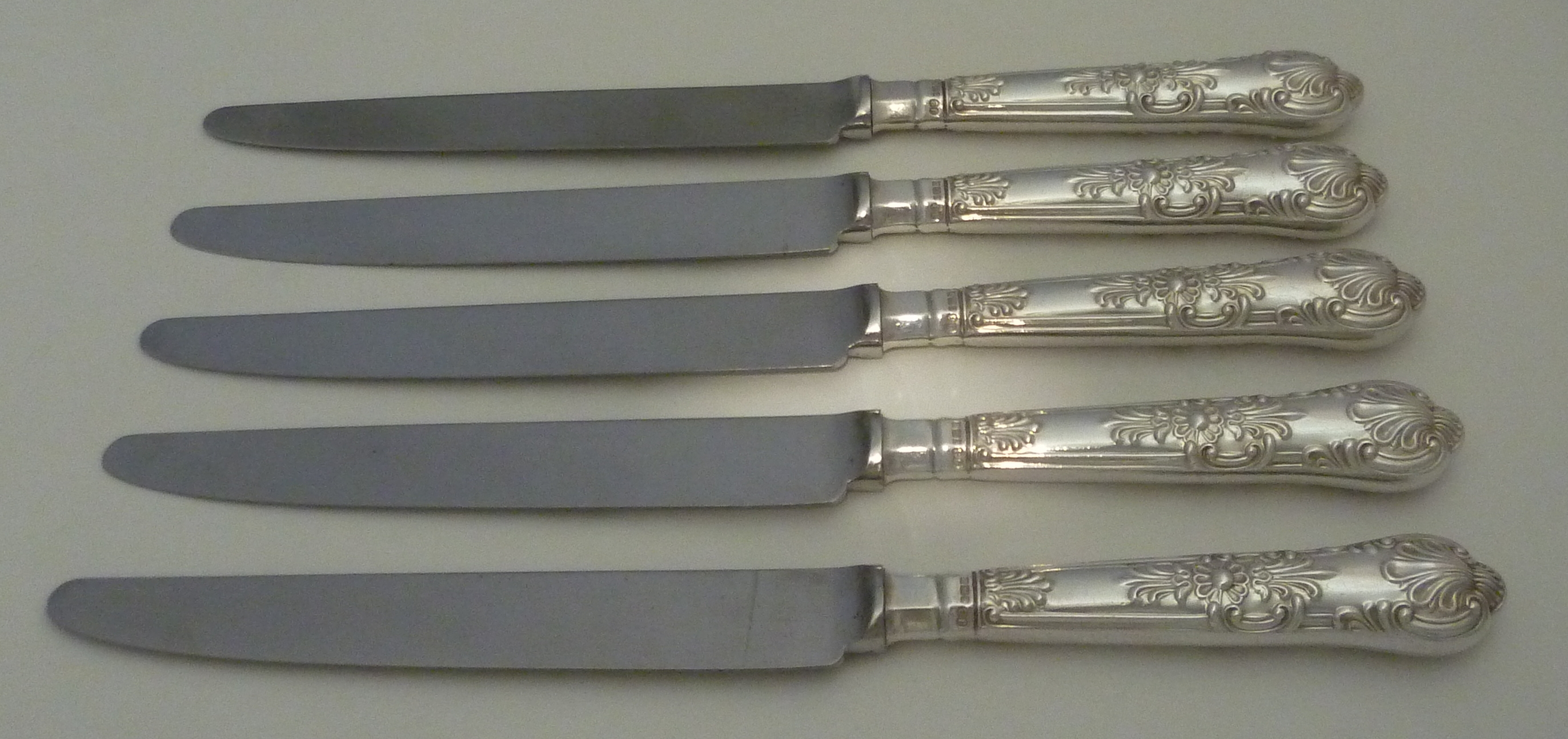 DESCRIPTION | Five loaded sterling silver handled Queen's pattern table knives with stainless steel blades. |