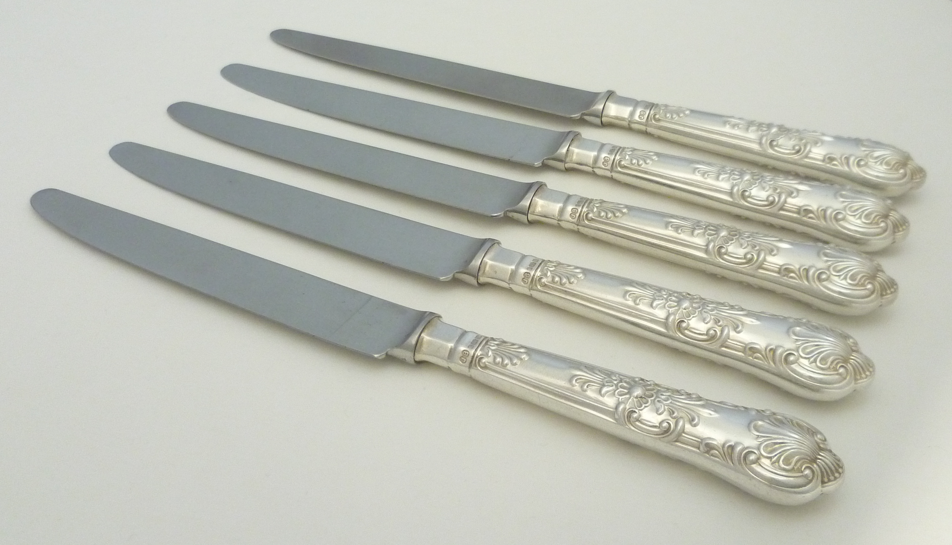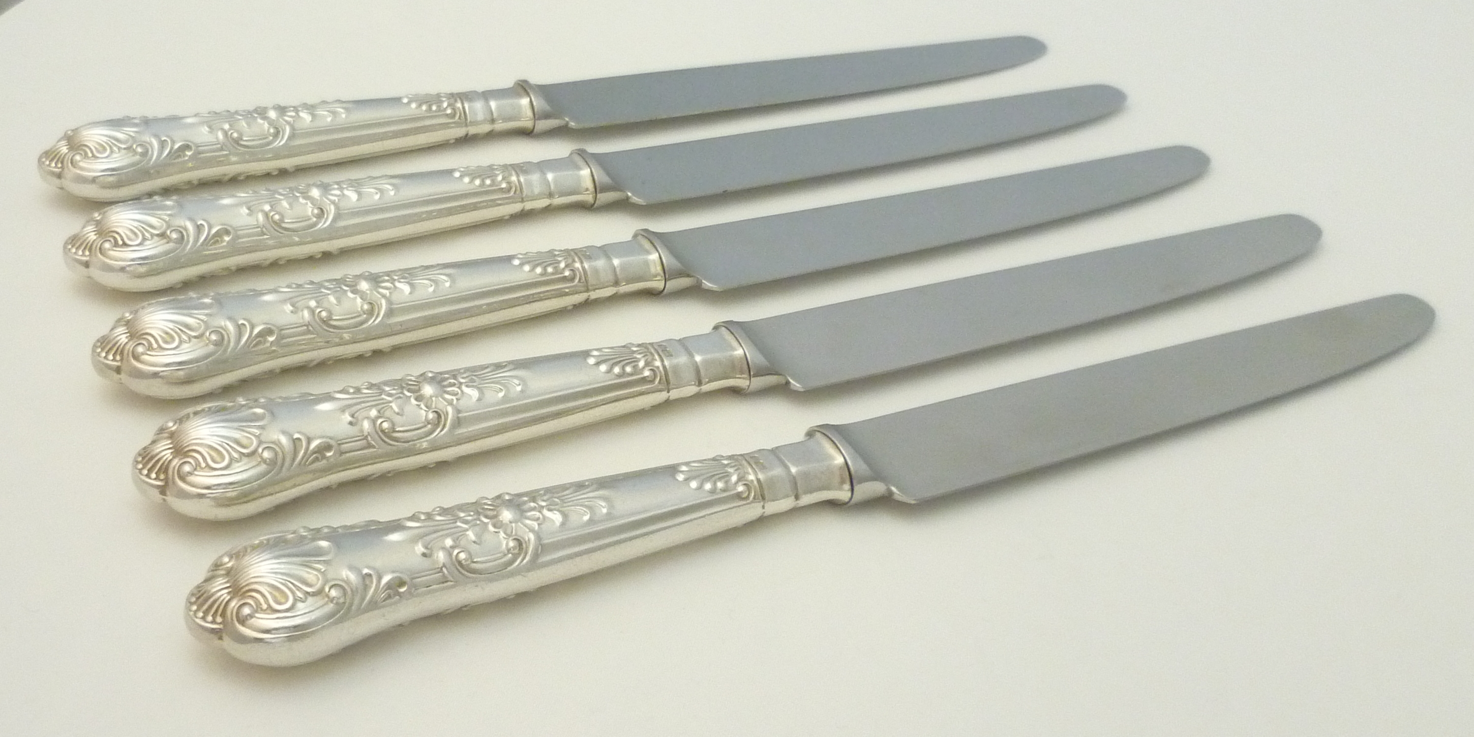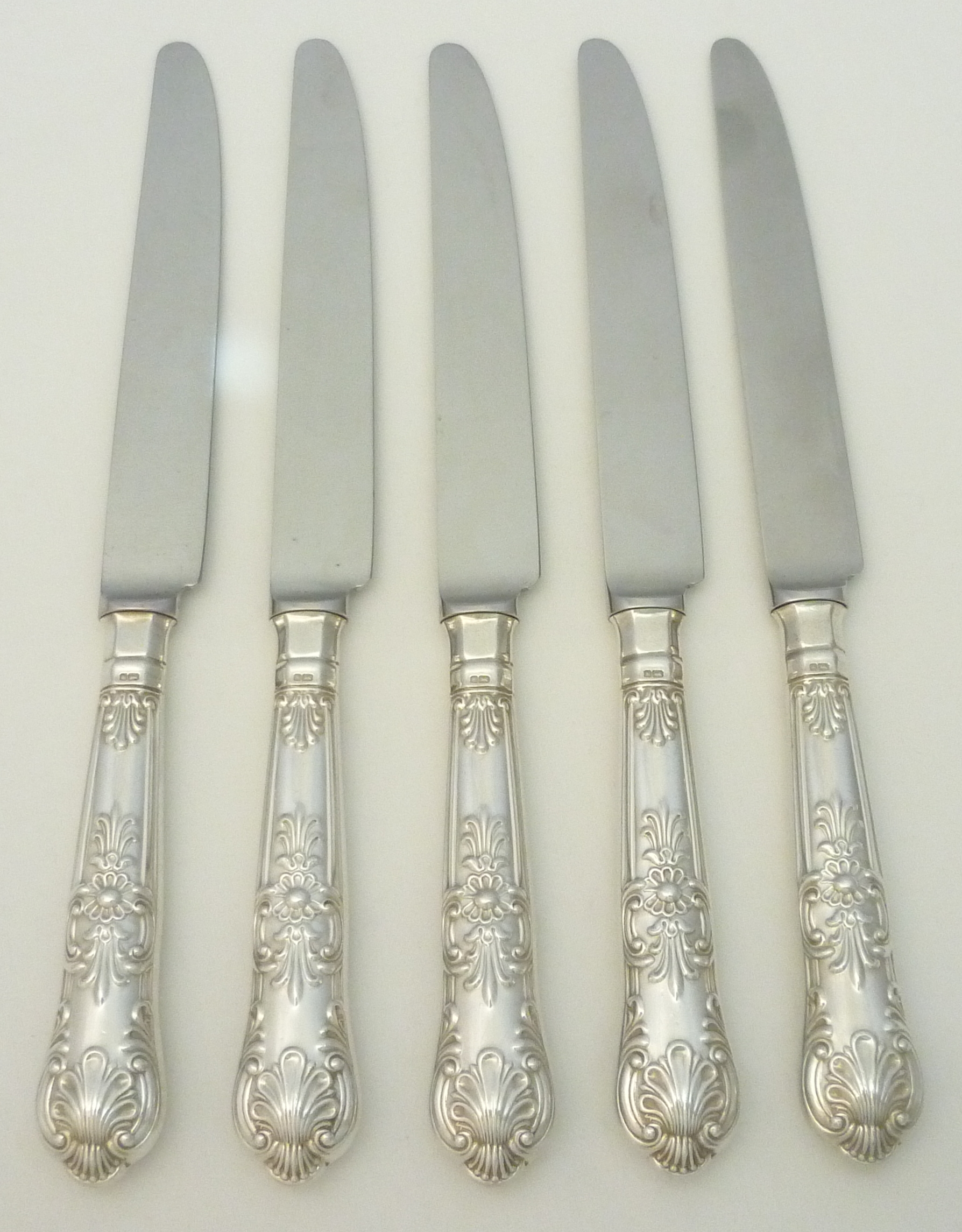 DESCRIPTION | Five loaded sterling silver handled Queen's pattern table knives with stainless steel blades. |