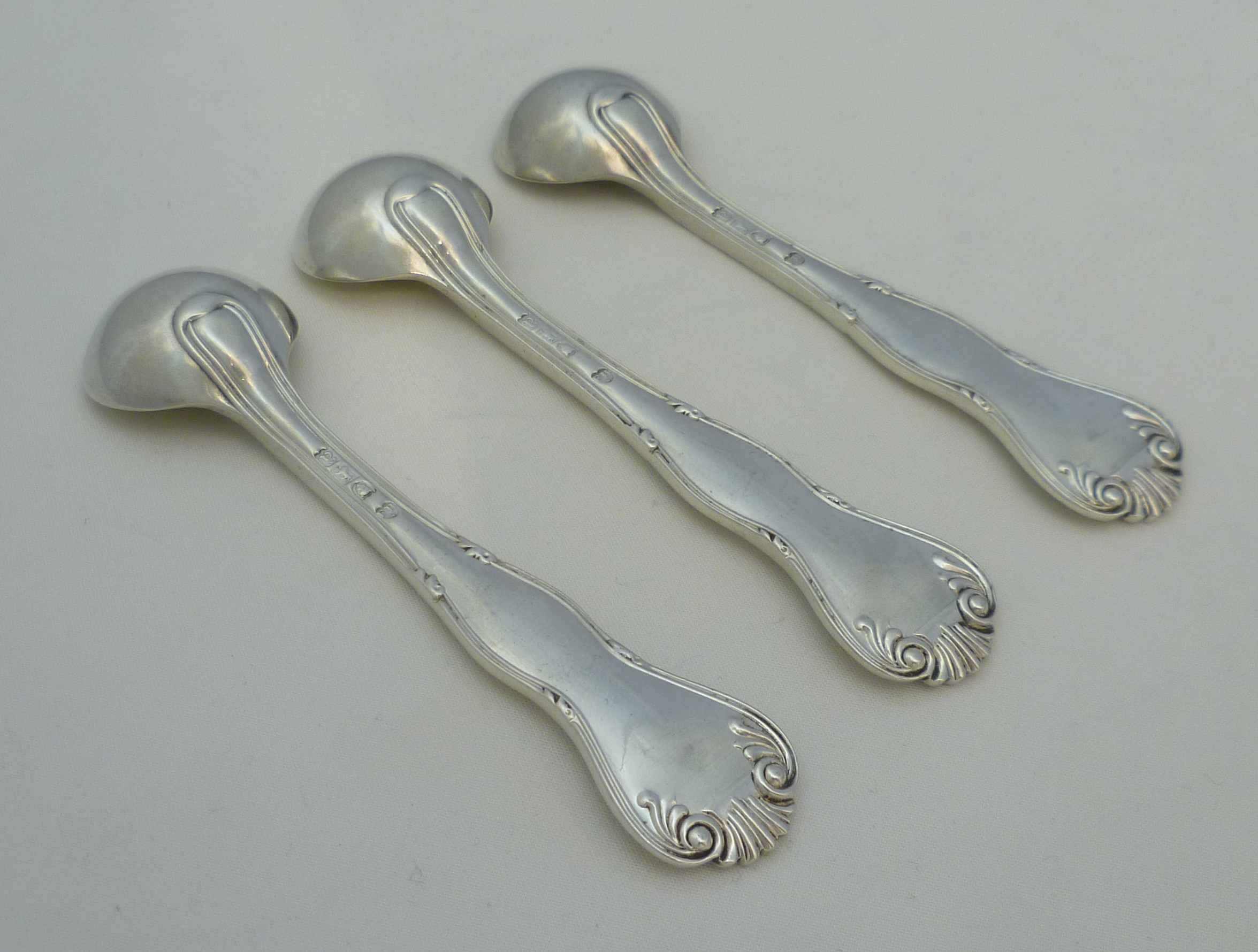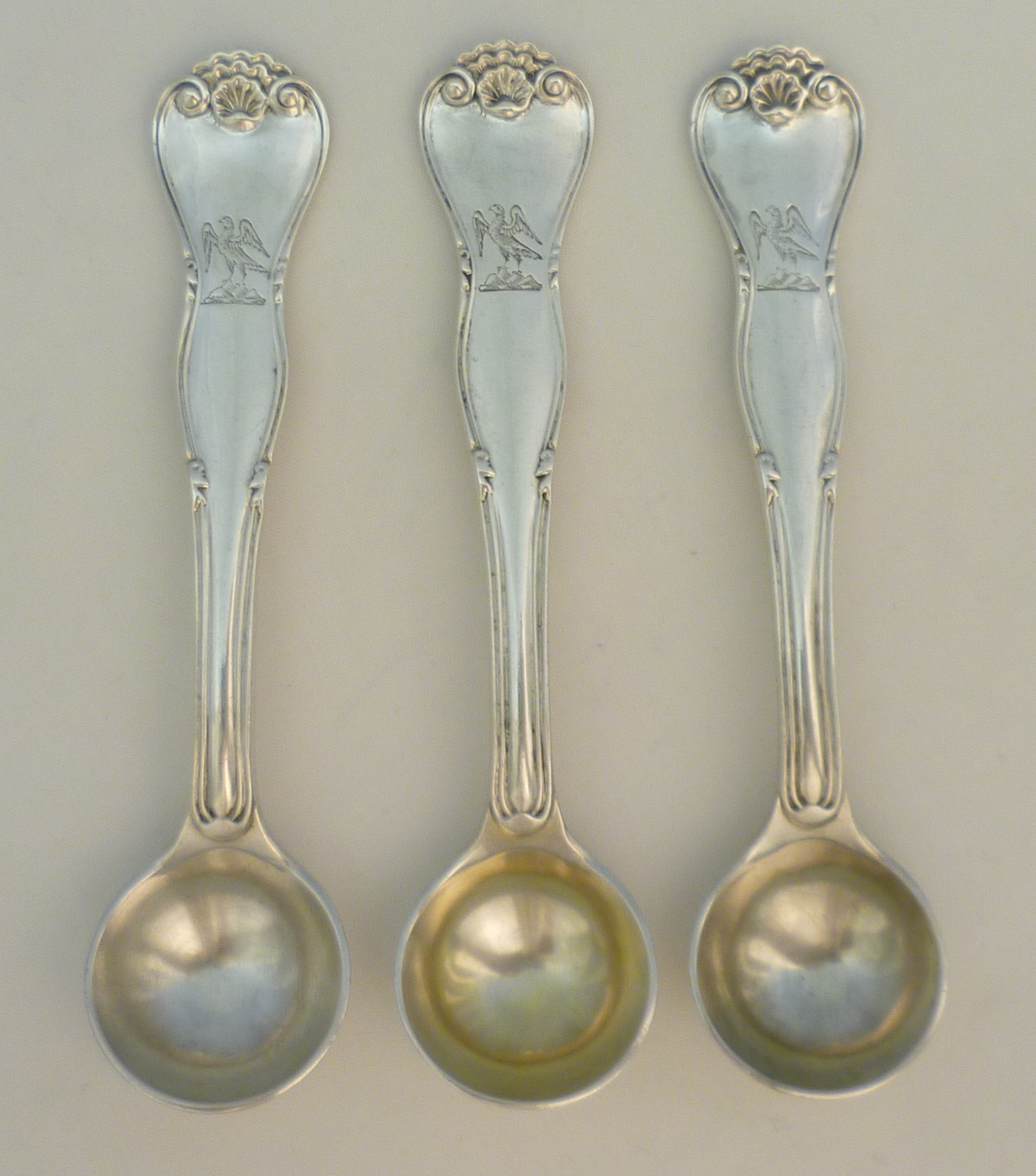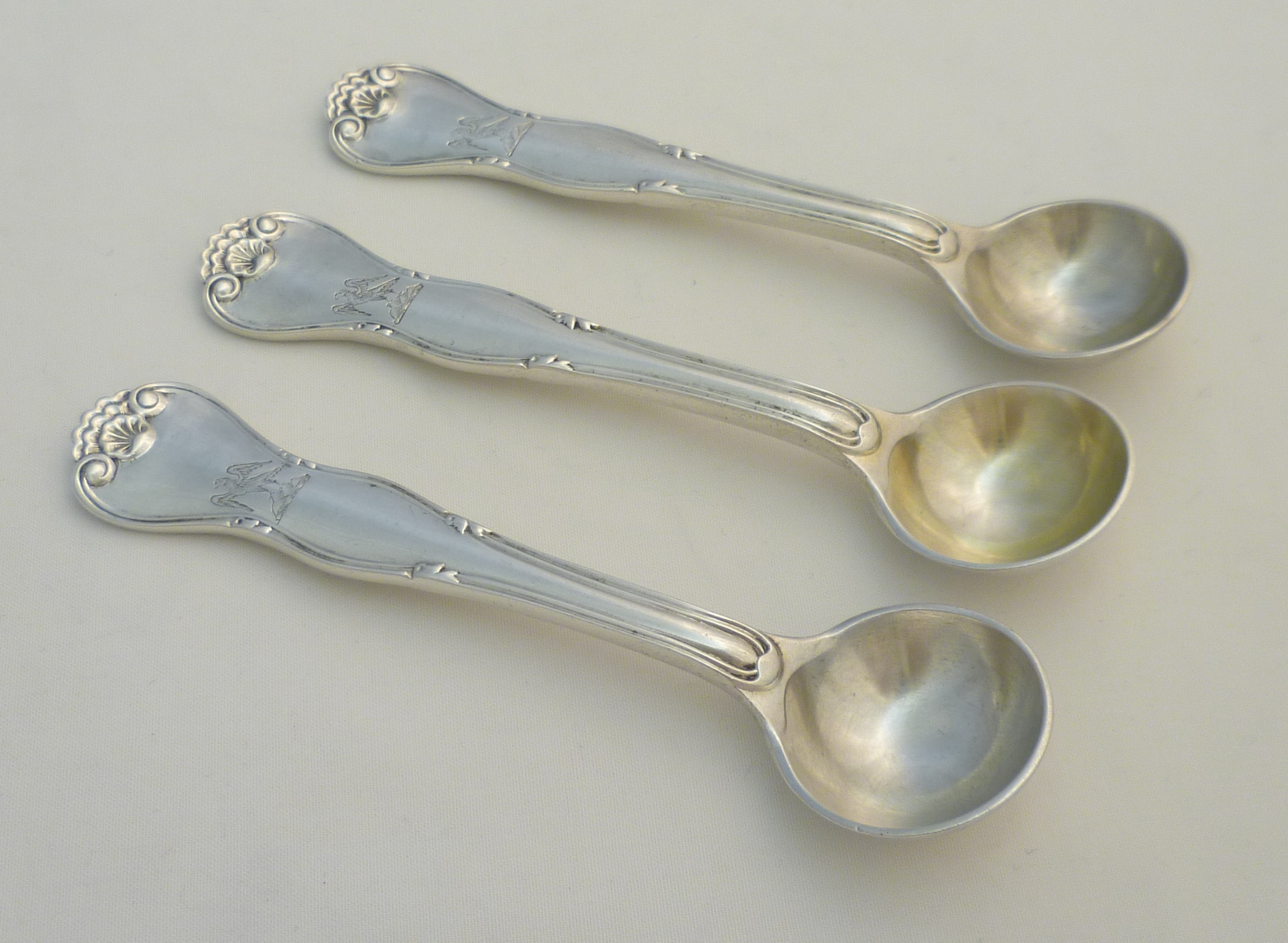 DESCRIPTION | Set of three high quality, very rare, English solid sterling silver King's Variant; King's Husk Without Husk pattern salt spoons with good frontal crest engraving. No husk to the bowl heel either so technically King's Husk Without Husk Without Husk pattern. Much of the bowl gilding has now rubbed away but it could be reinstated for small cost, email for details. |
