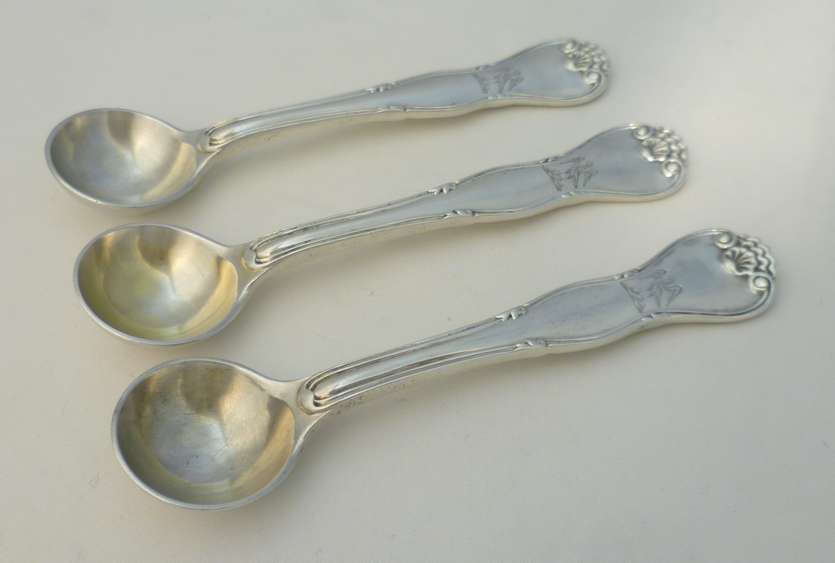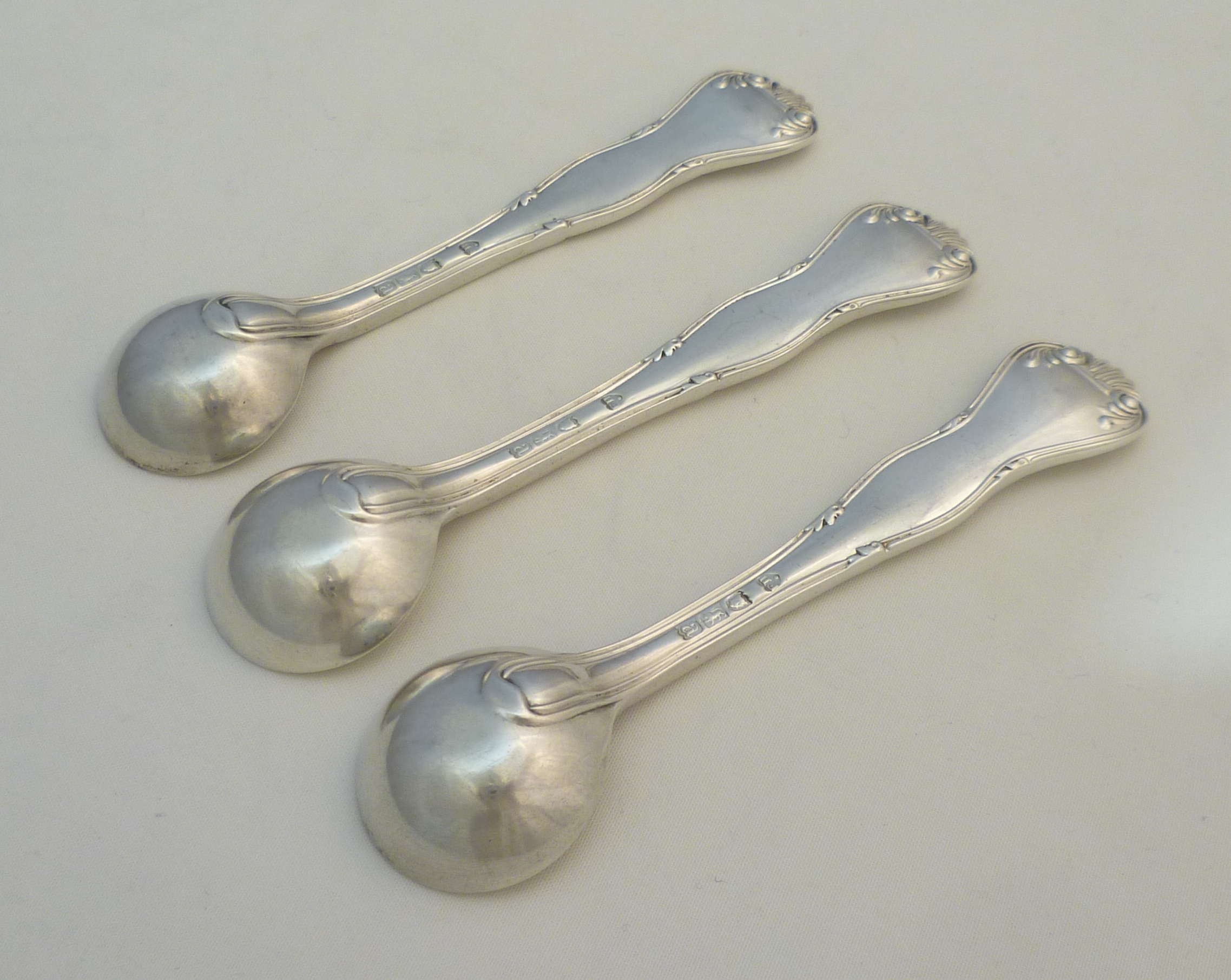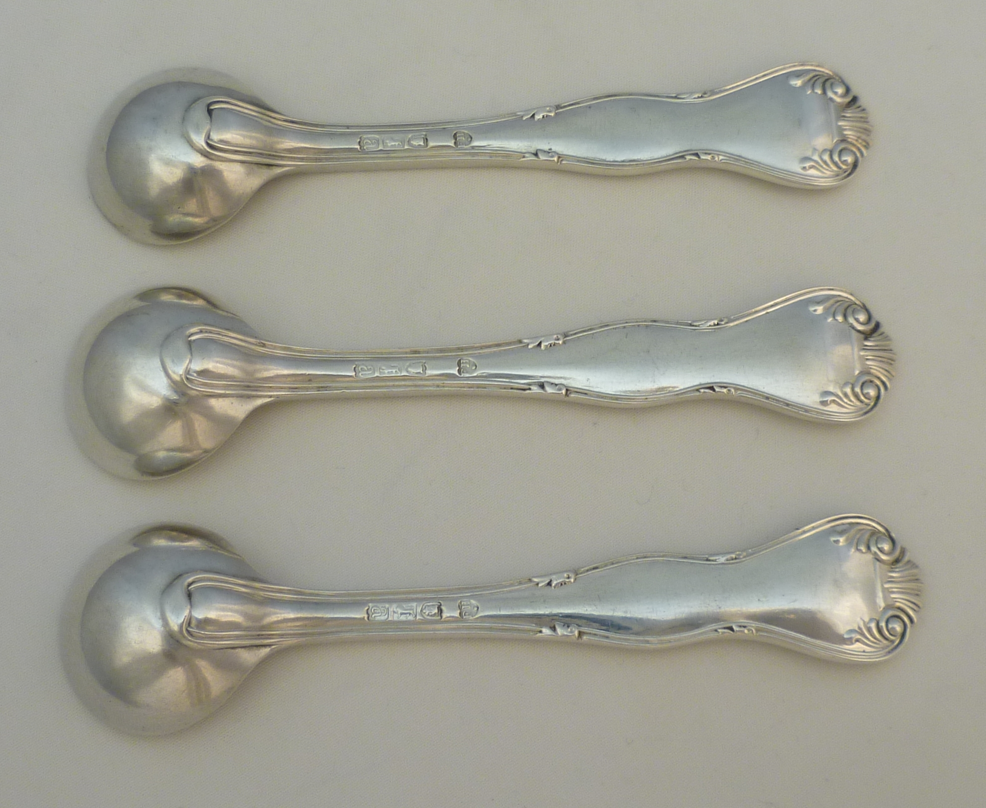 DESCRIPTION | Set of three high quality, very rare, English solid sterling silver King's Variant; King's Husk Without Husk pattern salt spoons with good frontal crest engraving. No husk to the bowl heel either so technically King's Husk Without Husk Without Husk pattern. Much of the bowl gilding has now rubbed away but it could be reinstated for small cost, email for details. |