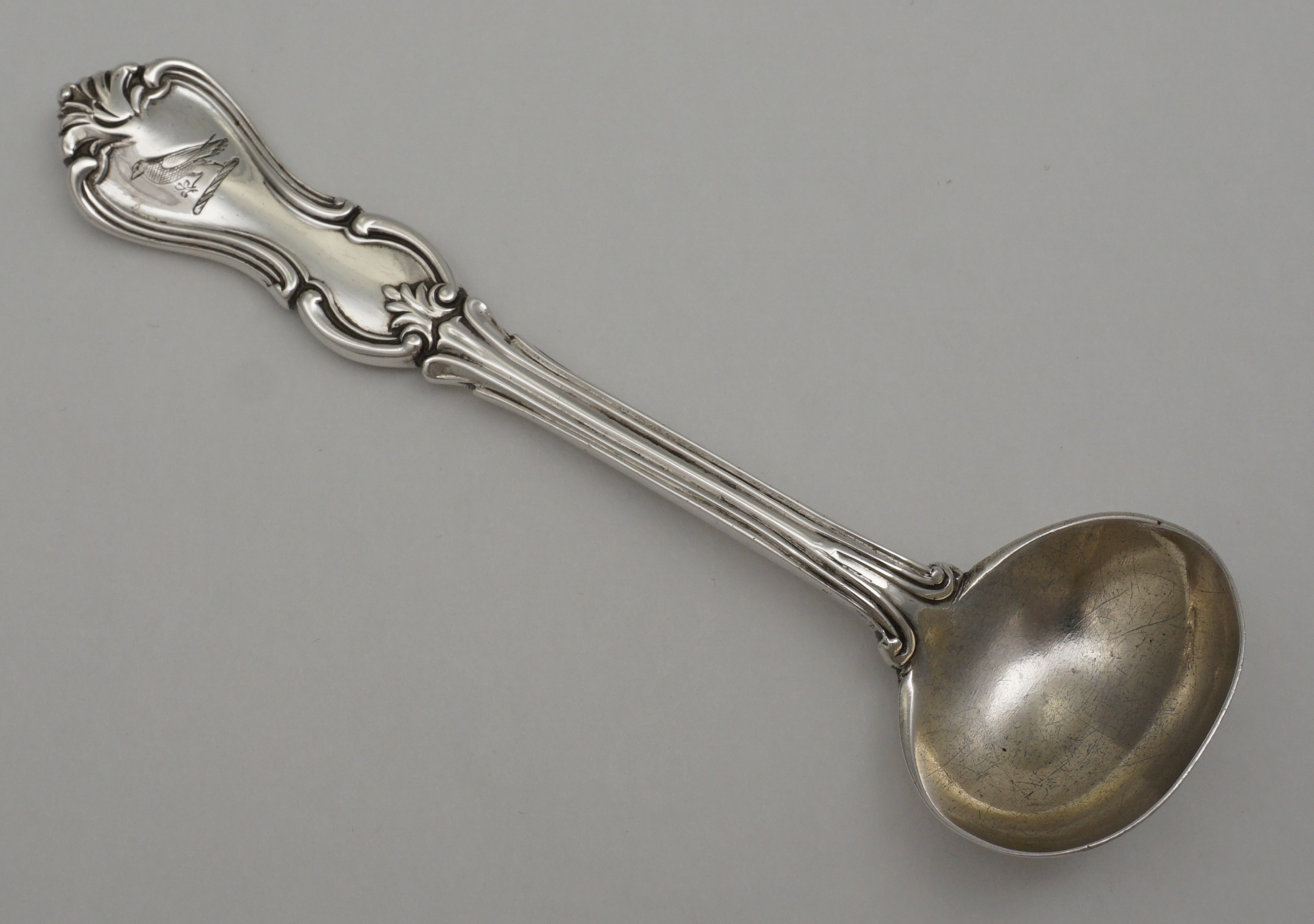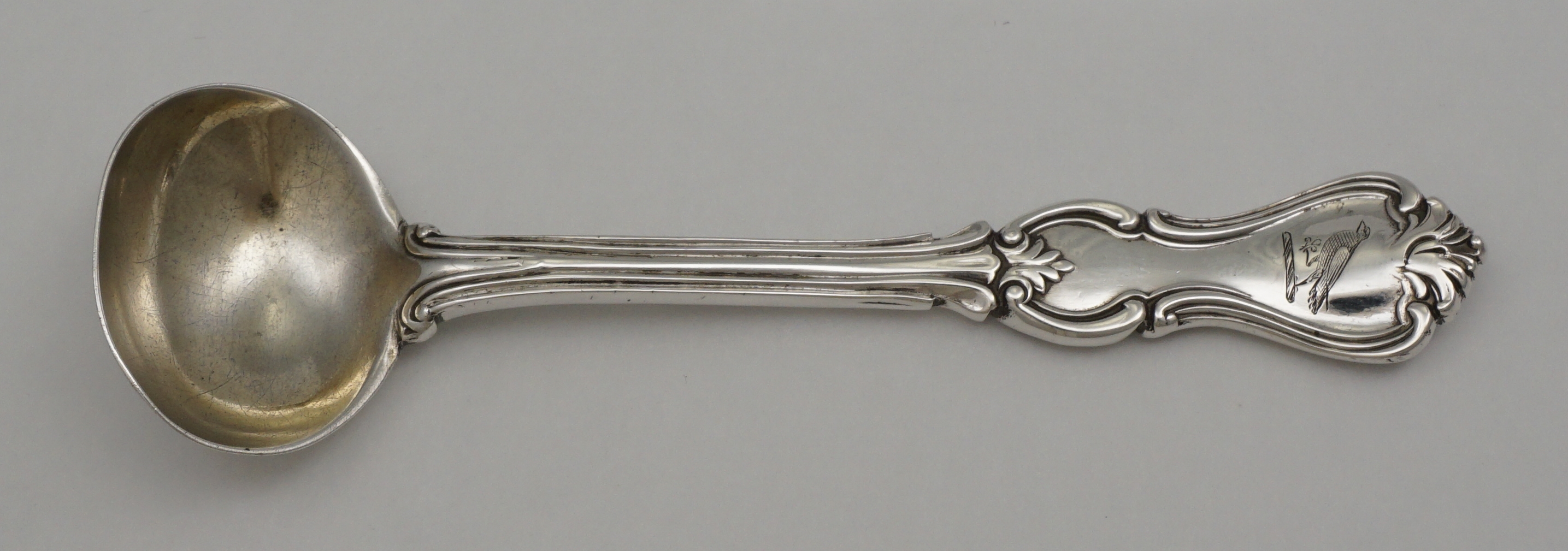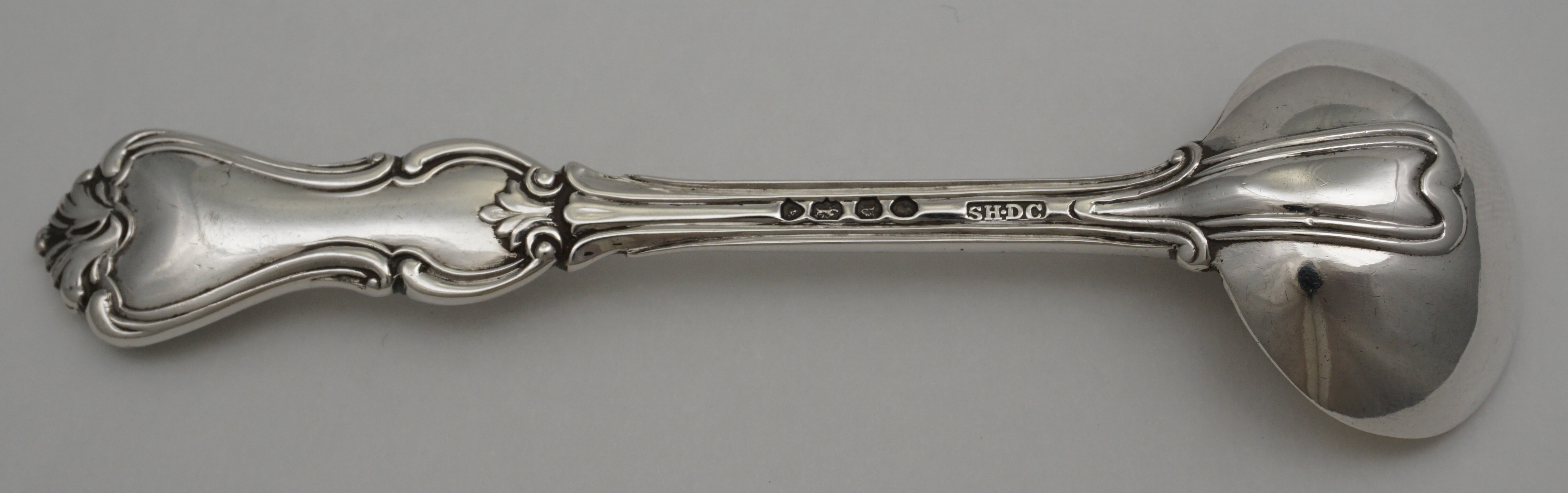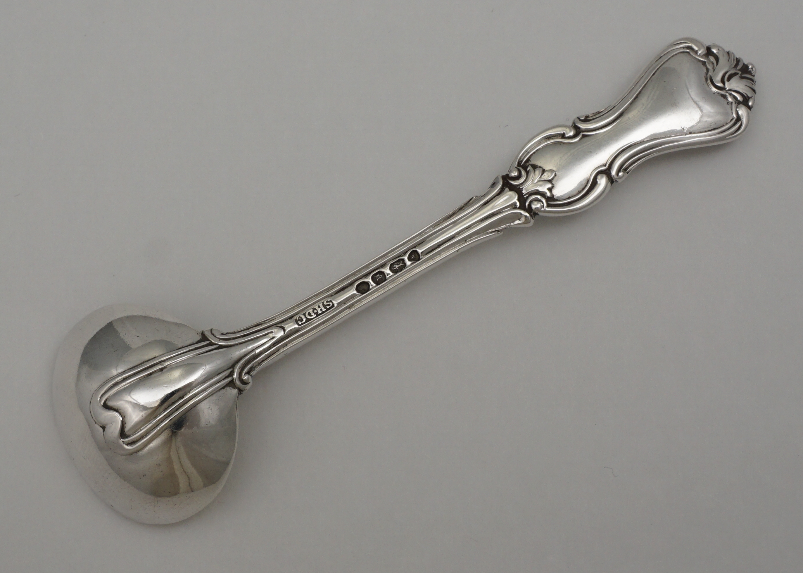 DESCRIPTION | High quality antique English Victorian solid sterling silver double struck Albert with thread heel pattern salt spoon with a gilded bowl and pleasant frontal crest engraving. |