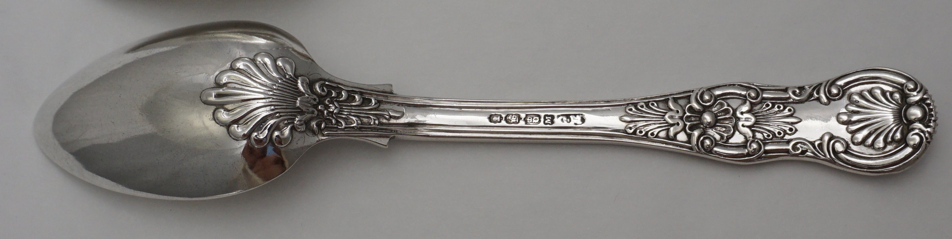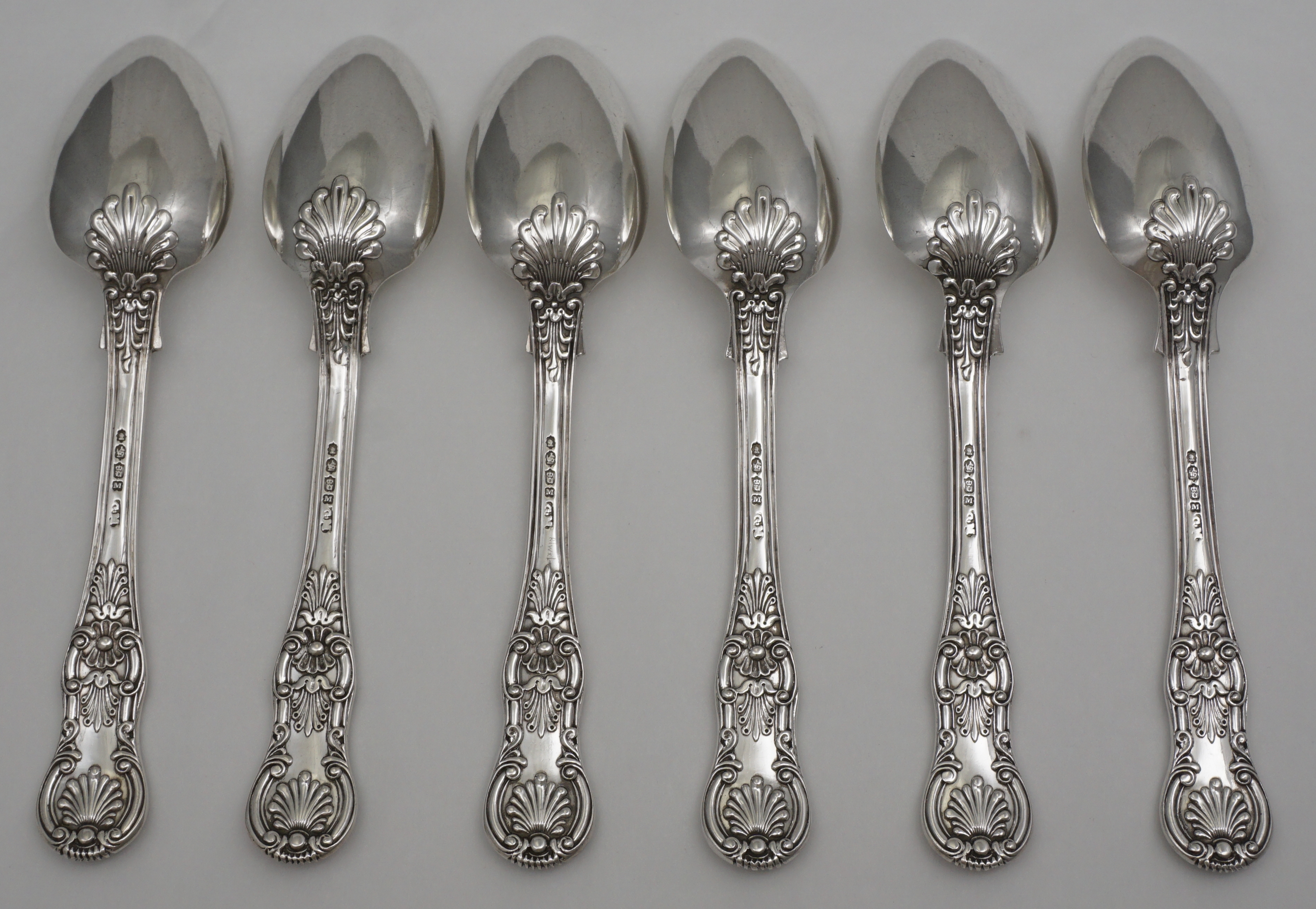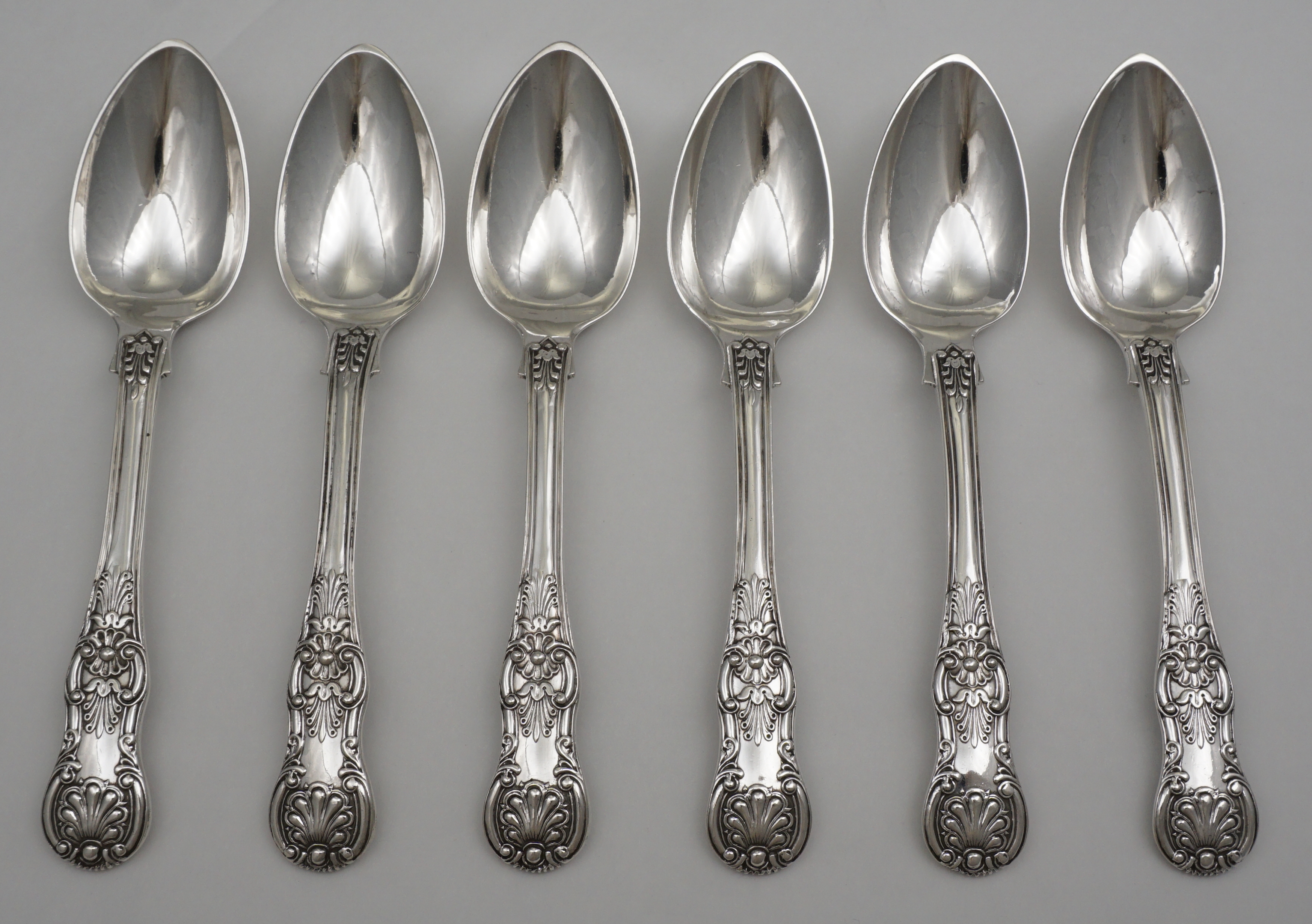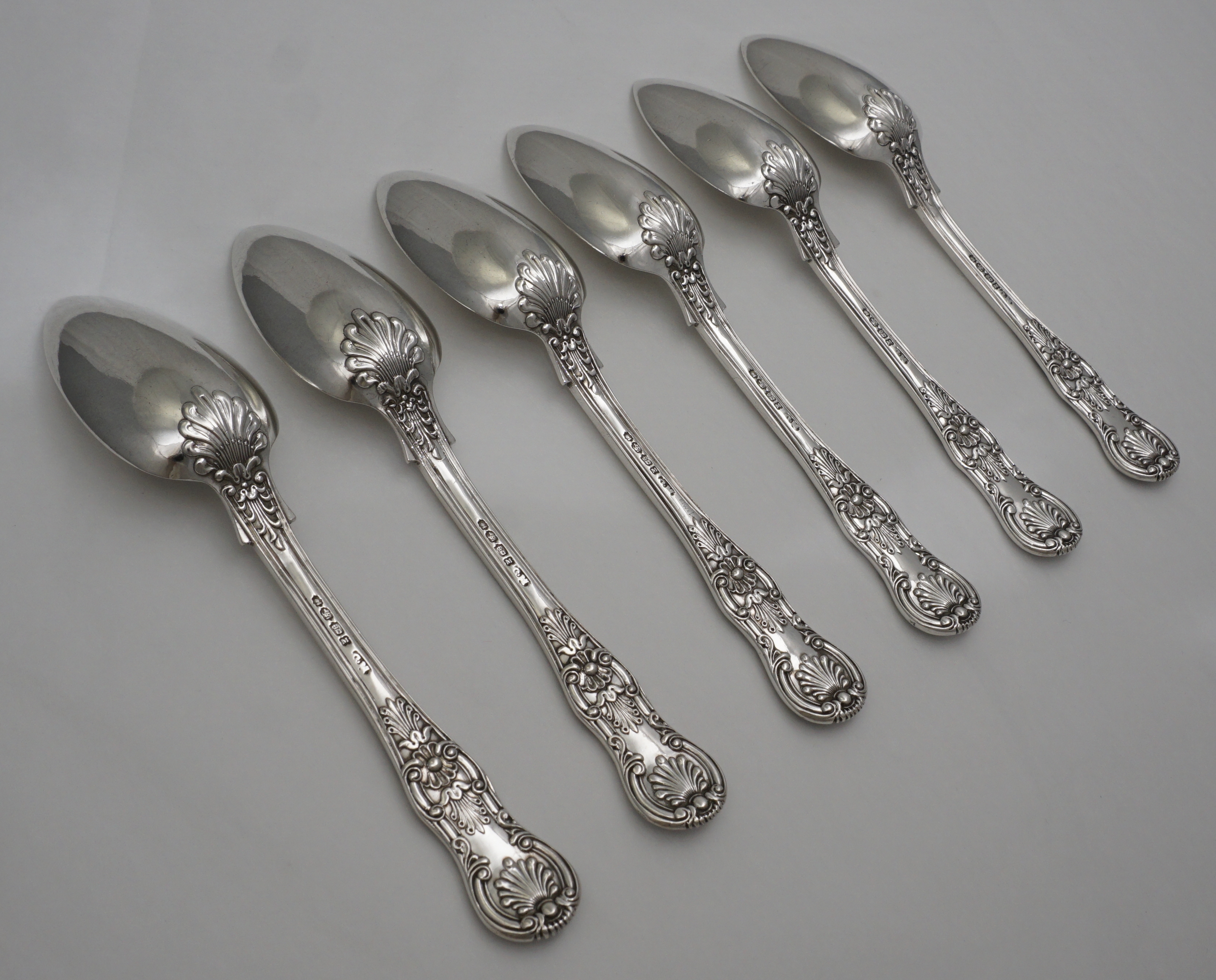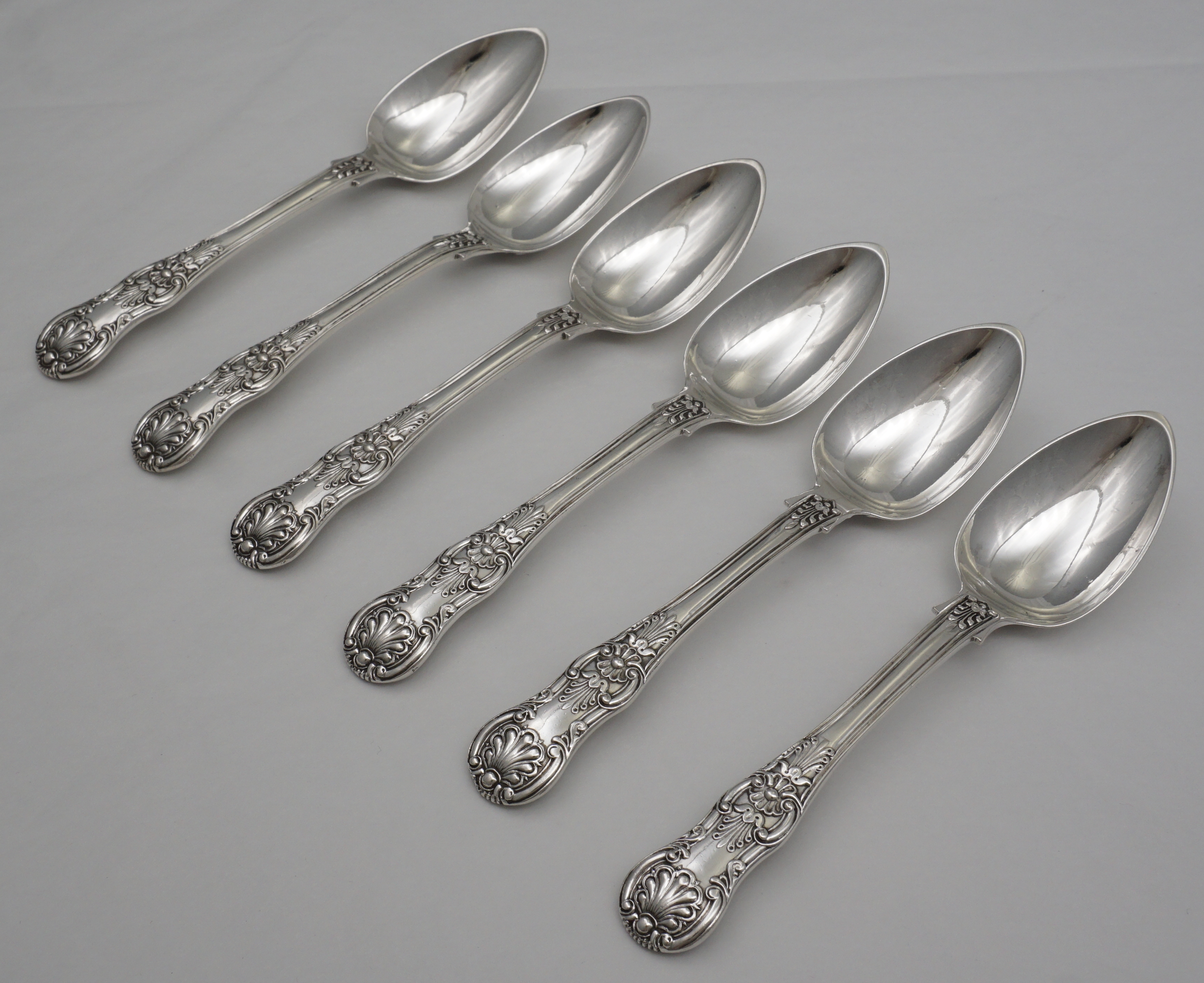 DESCRIPTION | Superb set of six William IV antique Irish solid sterling silver double struck Queen's pattern large teaspoons with no engraving. |