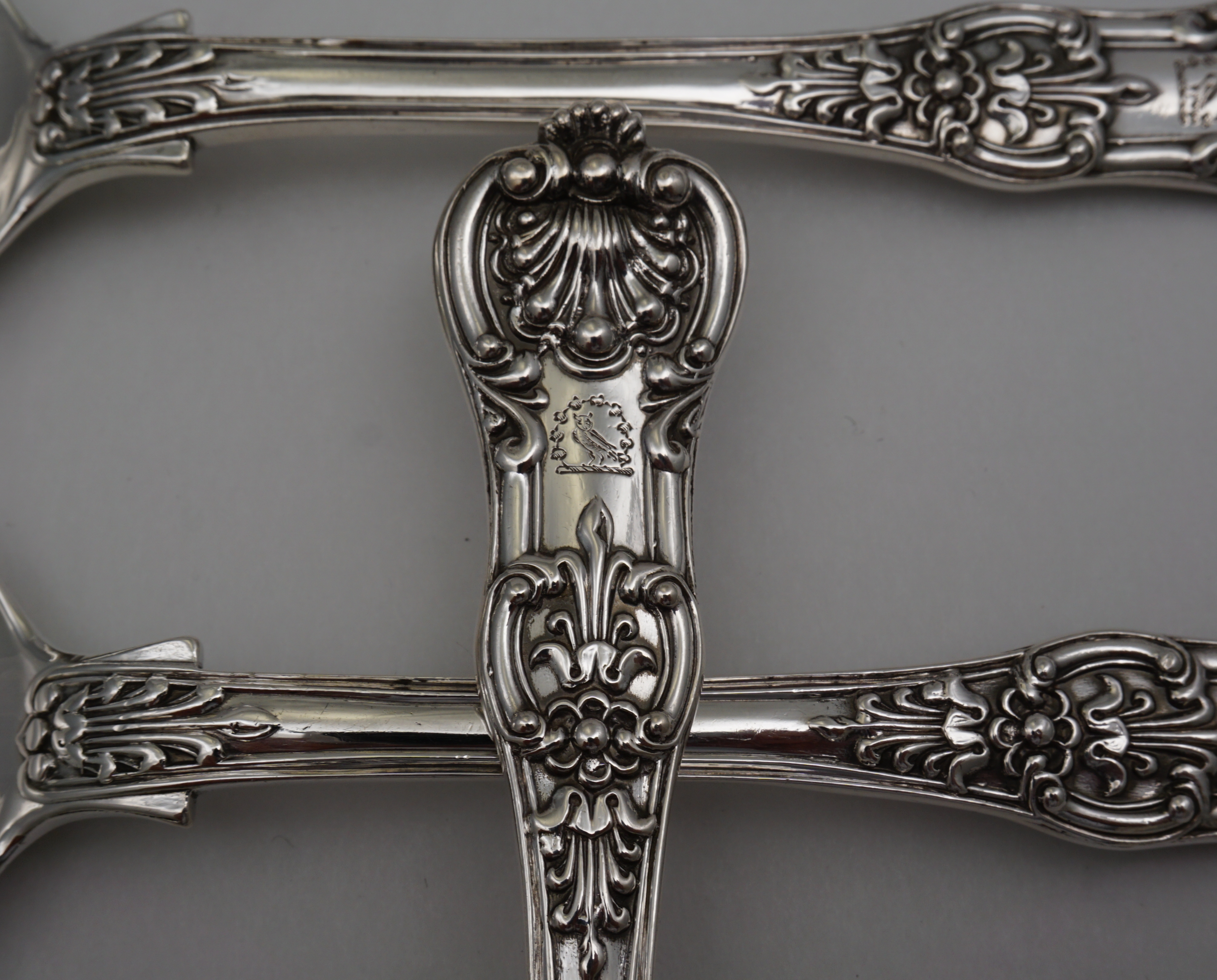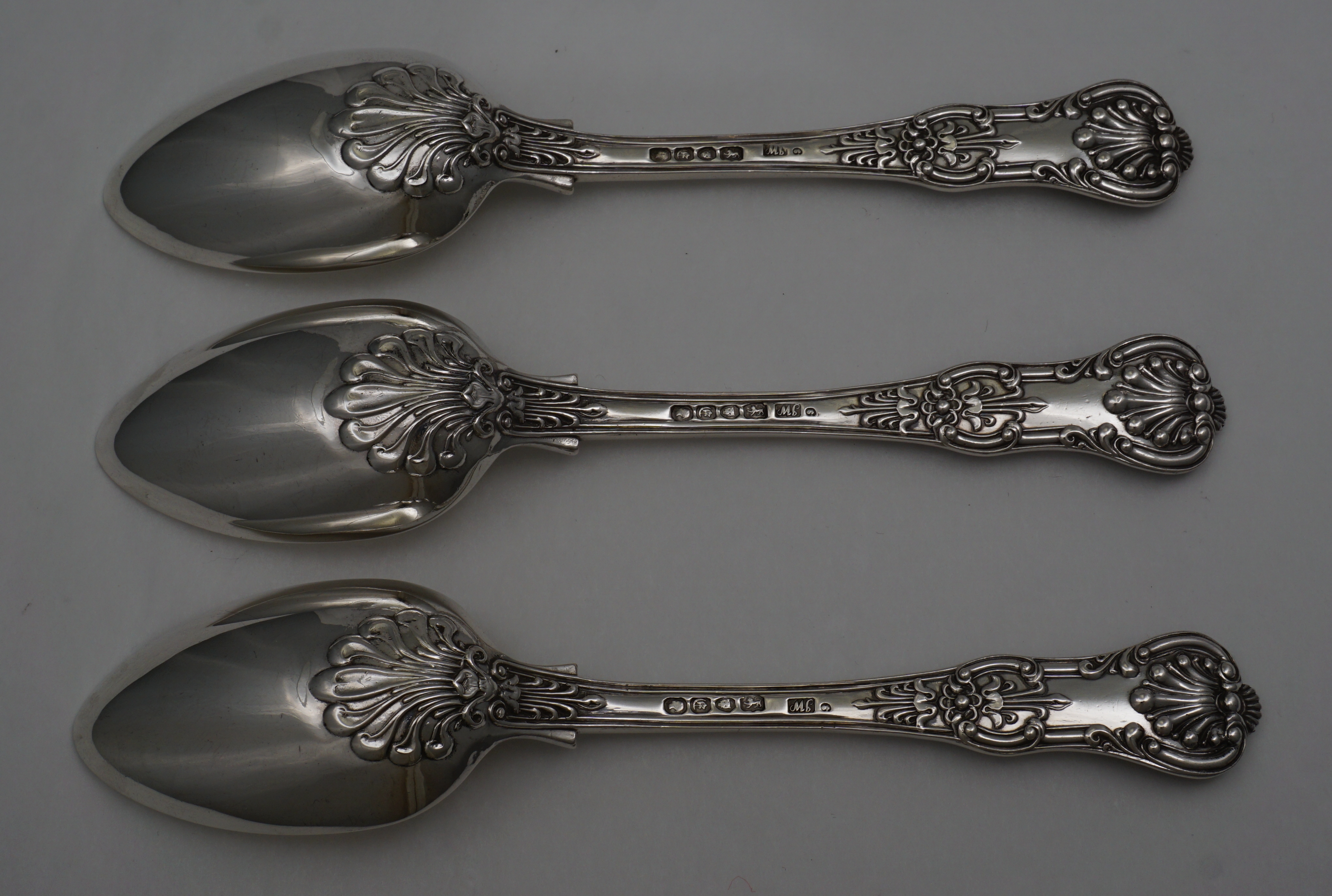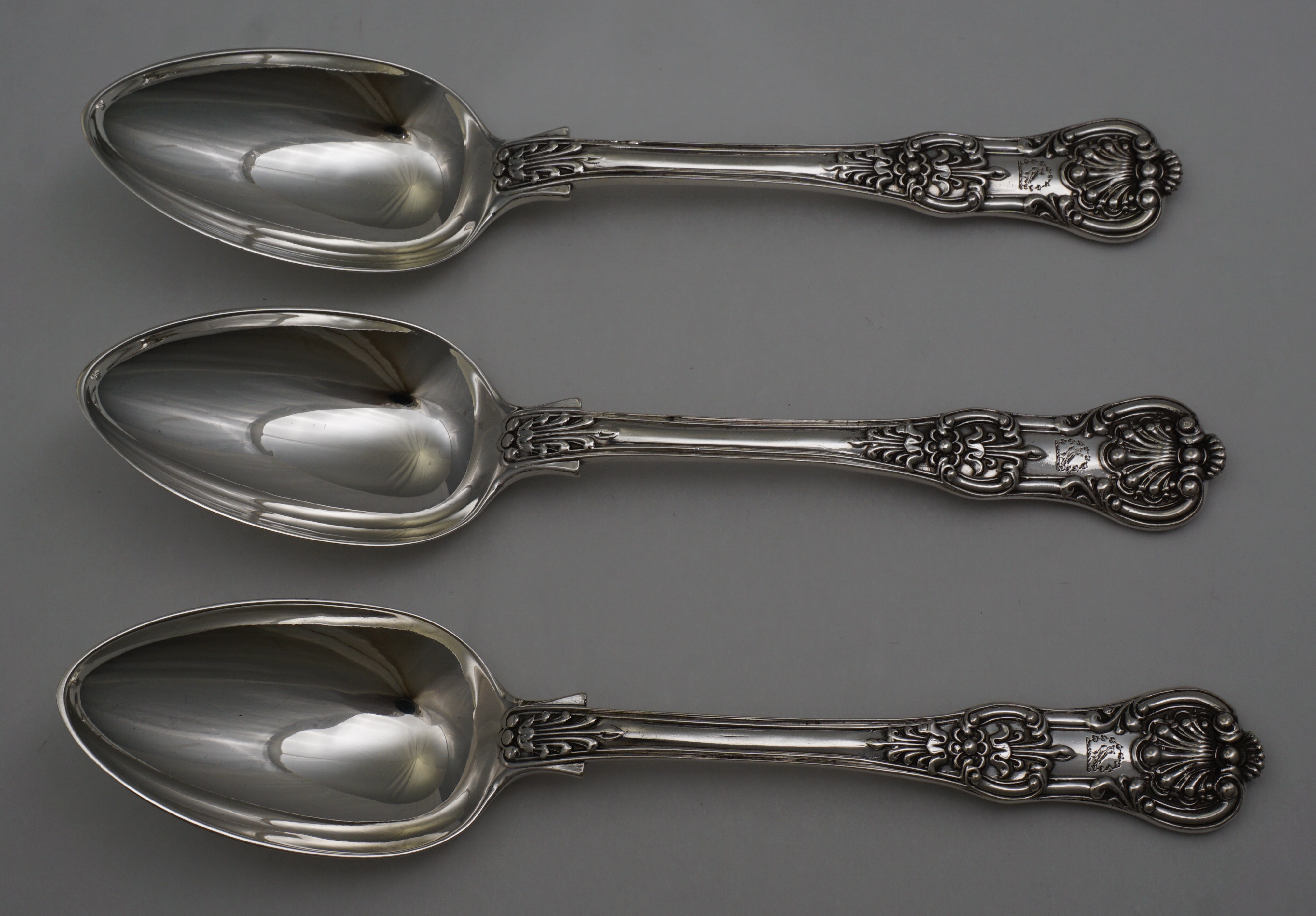DESCRIPTION | Superb set of three antique English early Victorian solid sterling silver double struck Queen's pattern dessert spoons with the garlanded owl crest engraving frontally. |