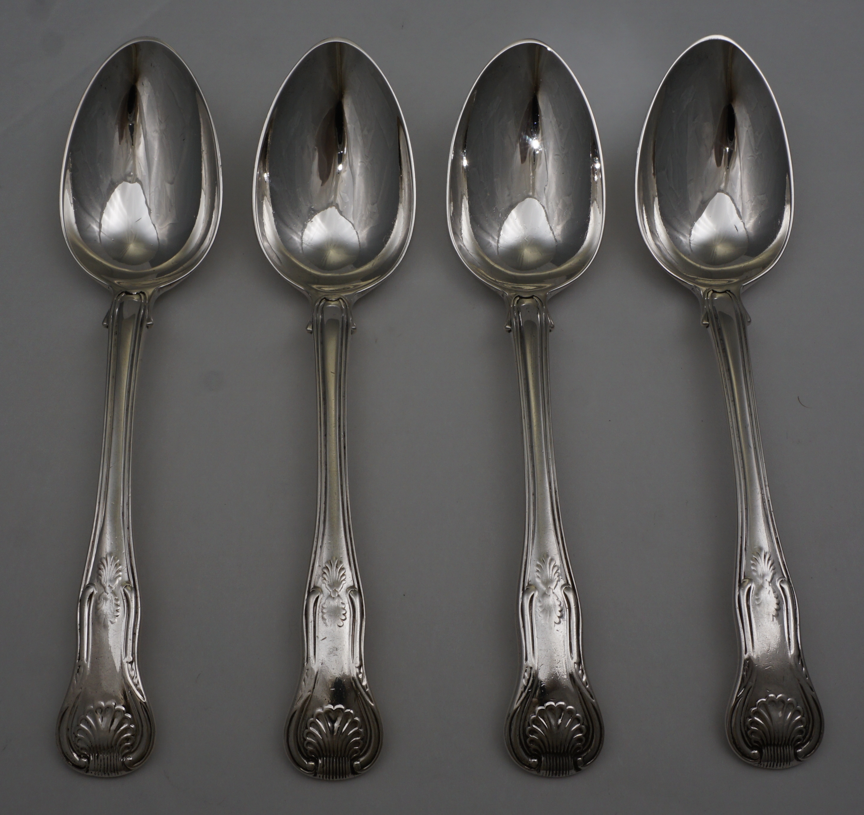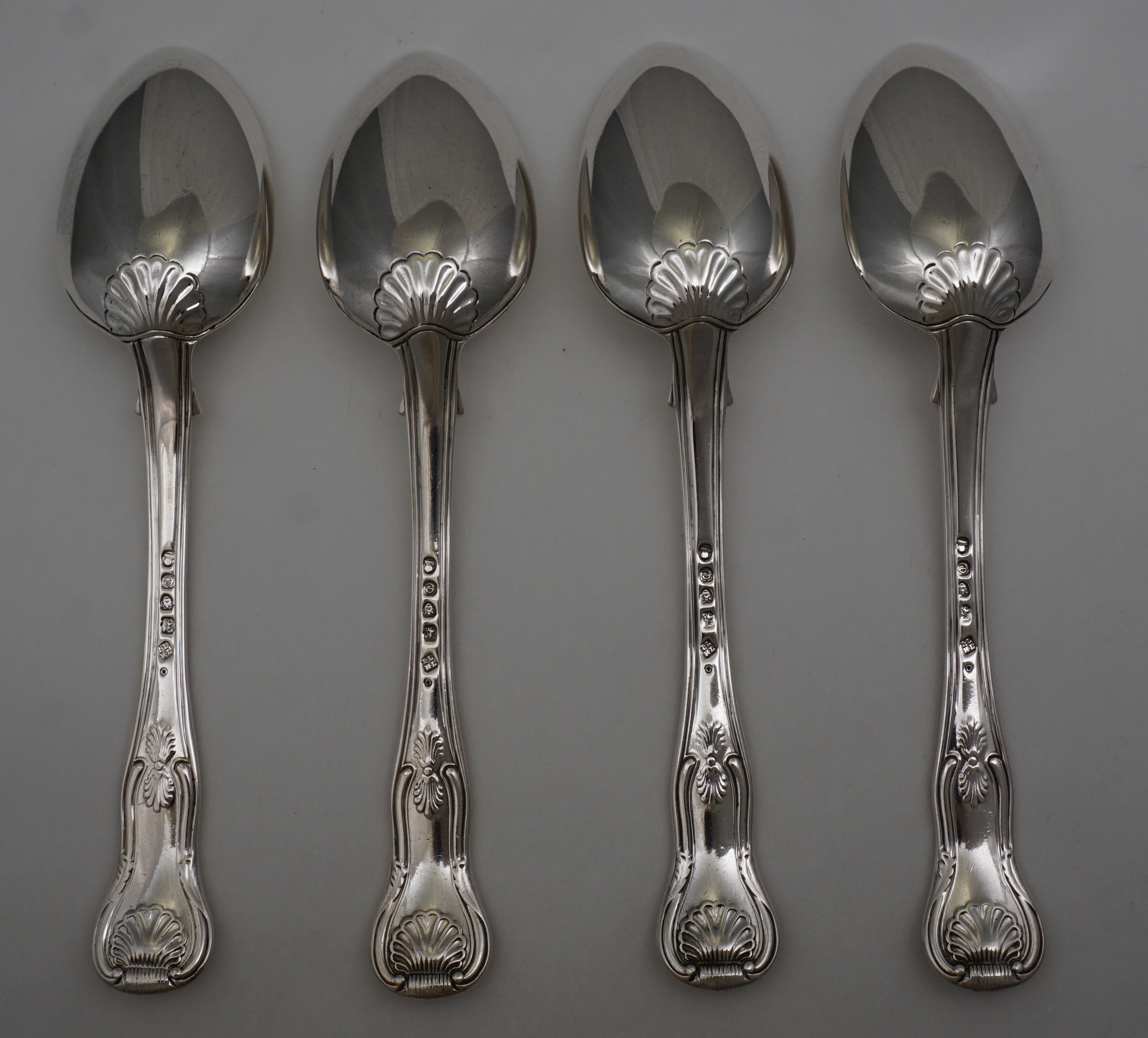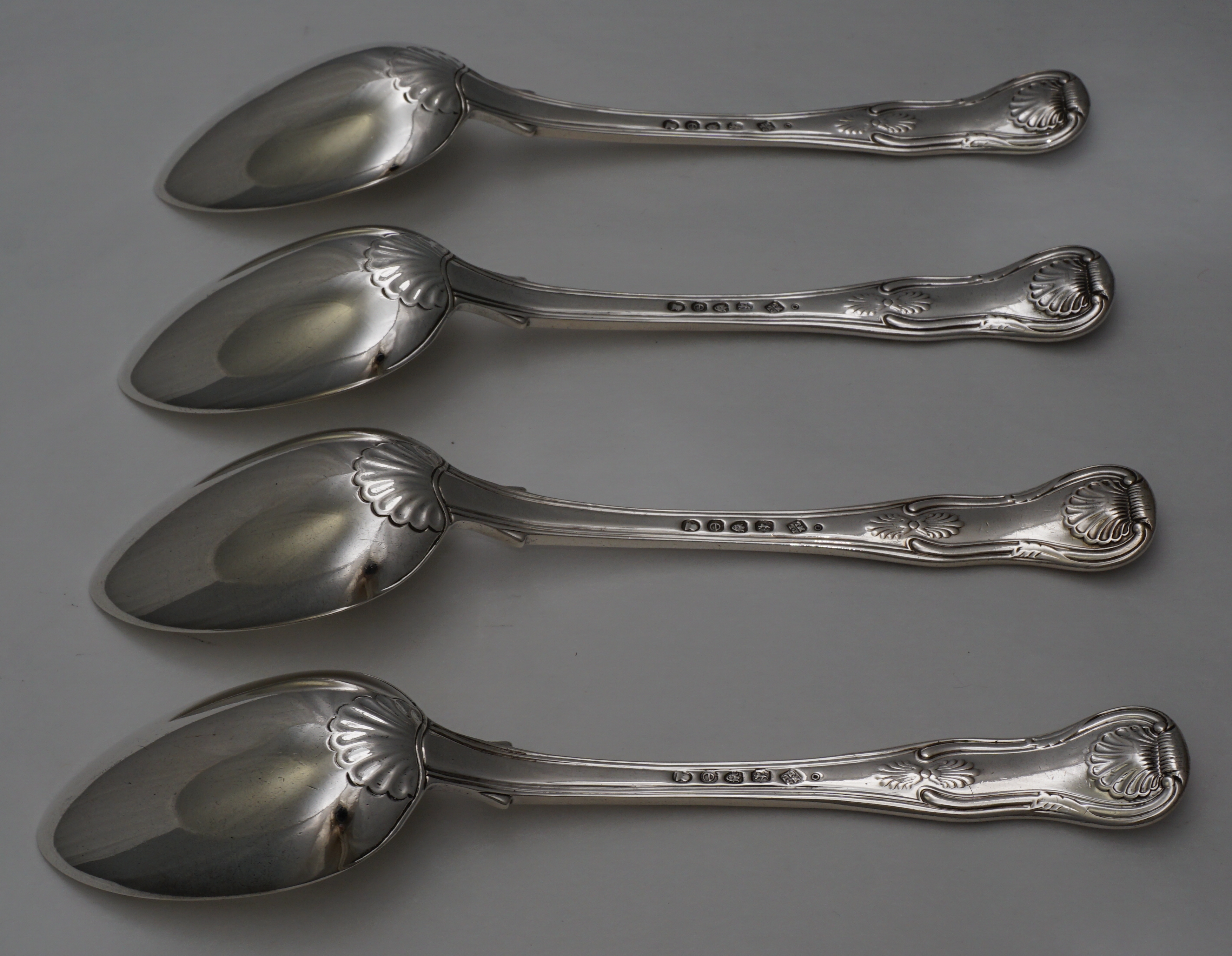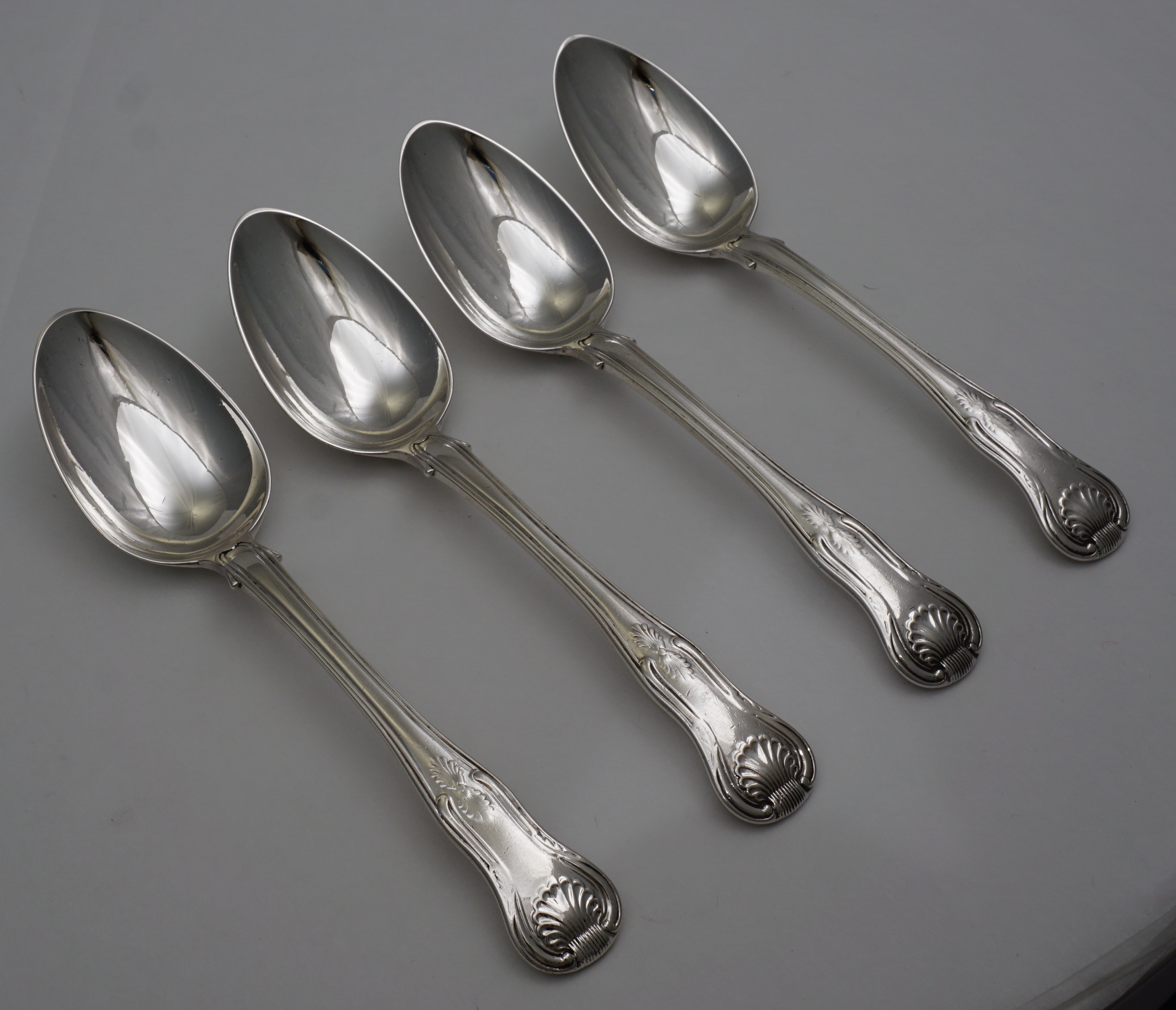DESCRIPTION | Set of four antique English Georgian solid sterling silver double struck King's with Union Shell Heel pattern dessert spoons with beautifully struck hallmarks and no engraving. |