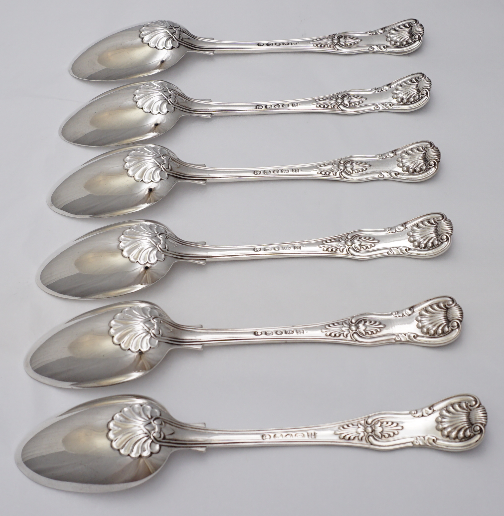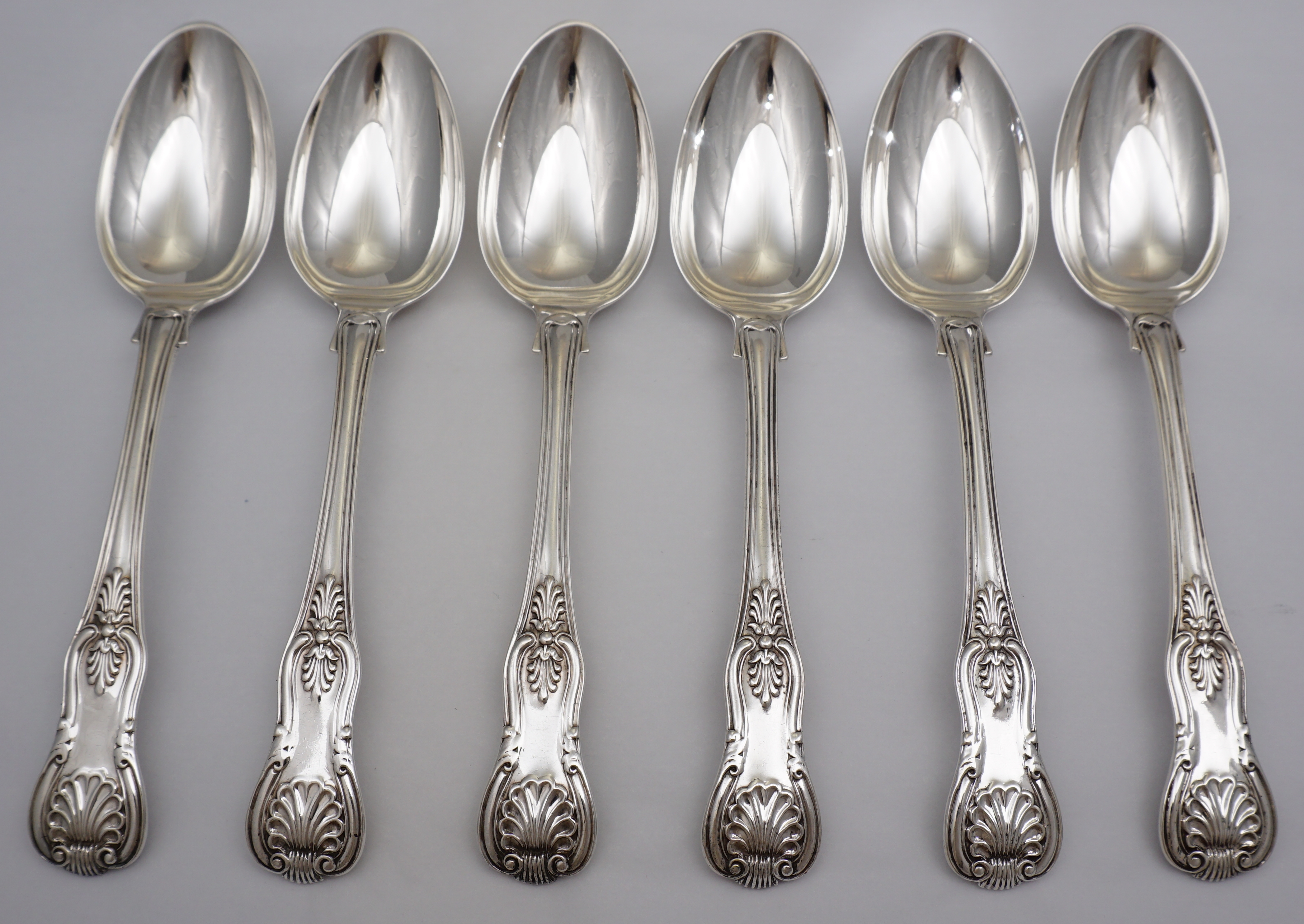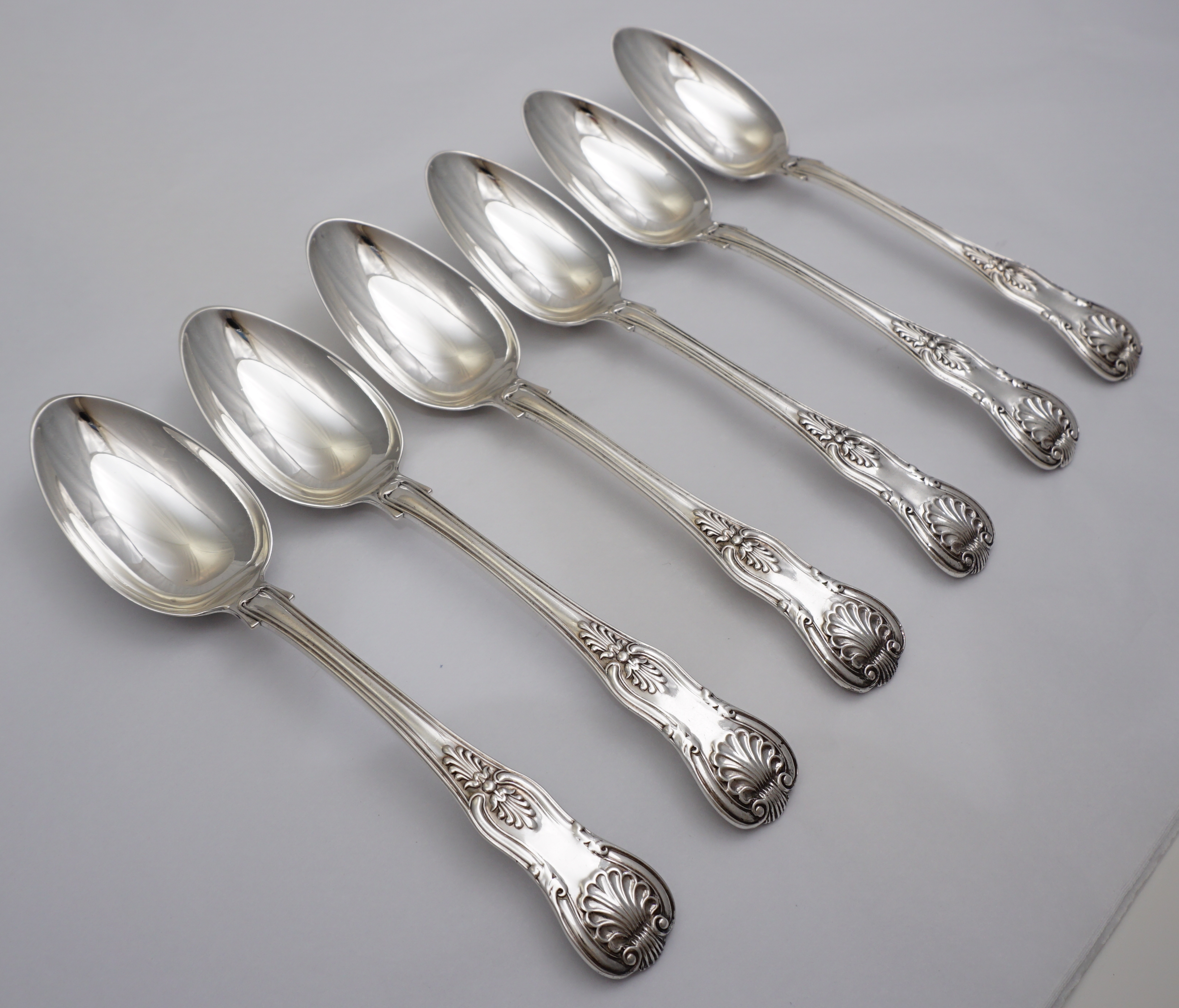 DESCRIPTION | Very good set of six antique English Georgian solid sterling silver double struck King's with diamond shell heel pattern dessert spoons with no engraving. |