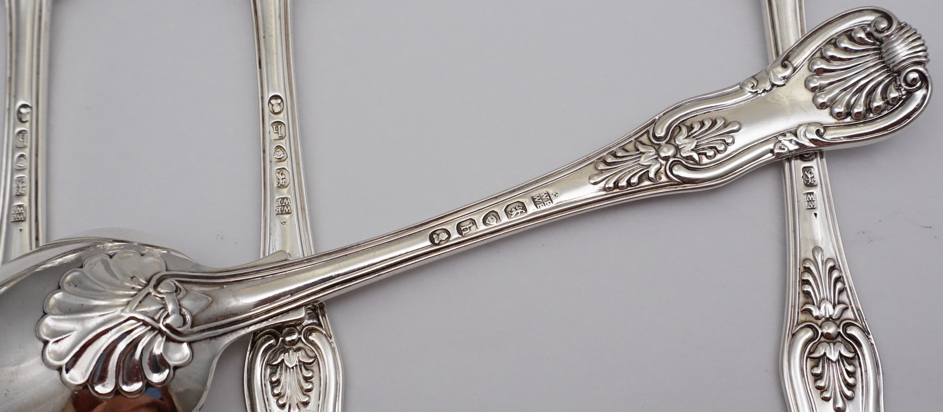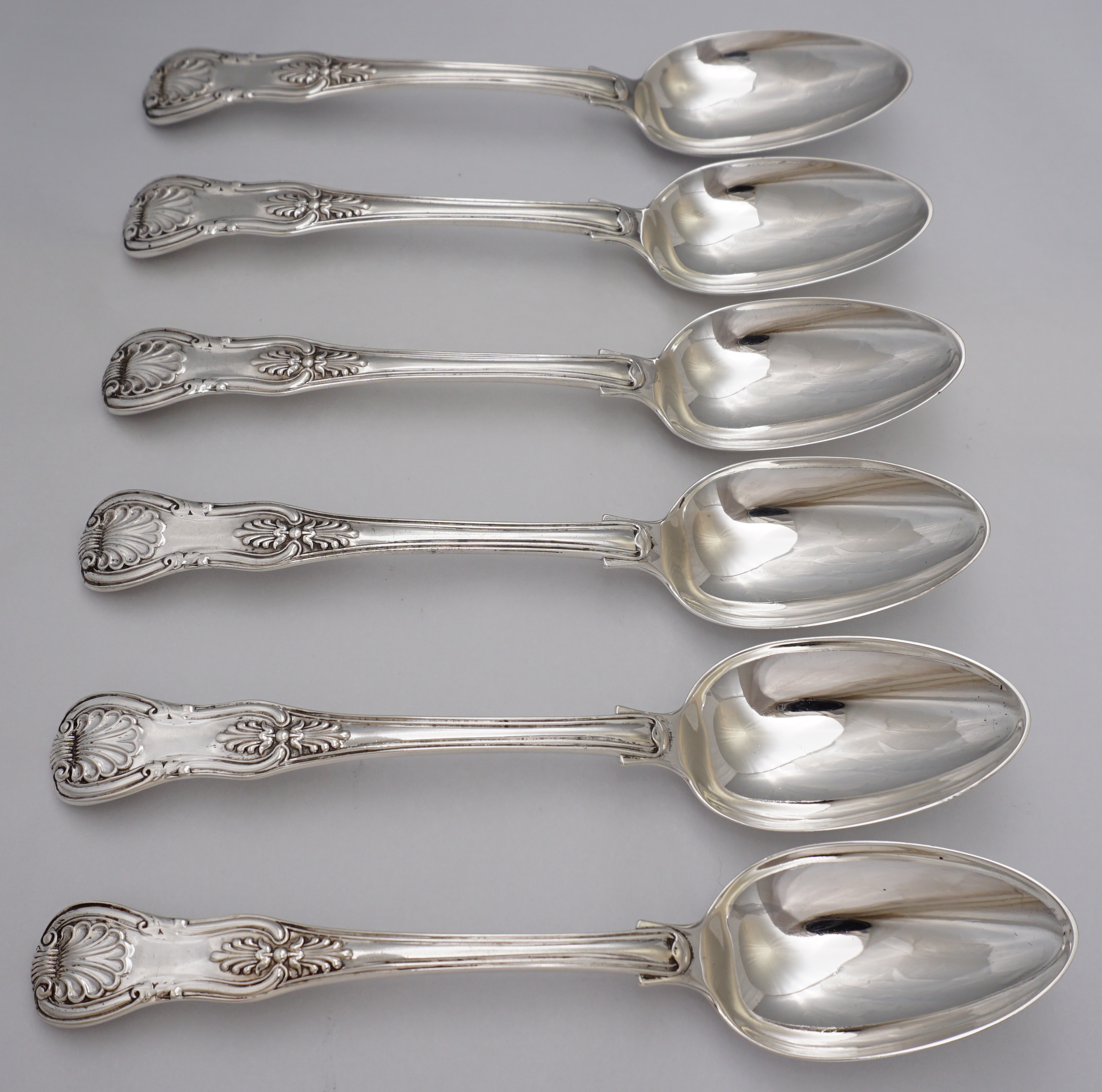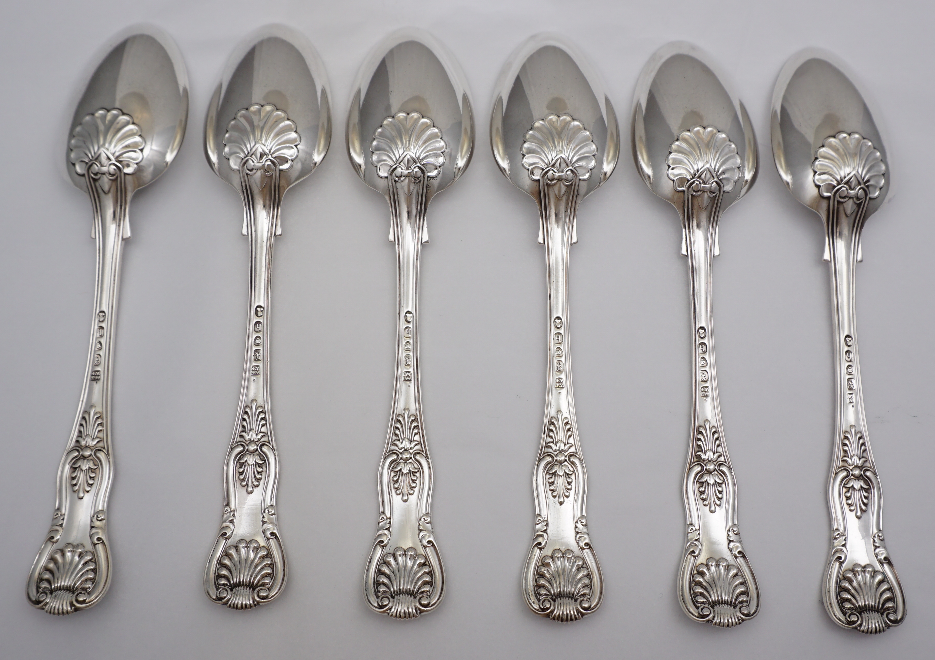 DESCRIPTION | Very good set of six antique English Georgian solid sterling silver double struck King's with diamond shell heel pattern dessert spoons with no engraving. |