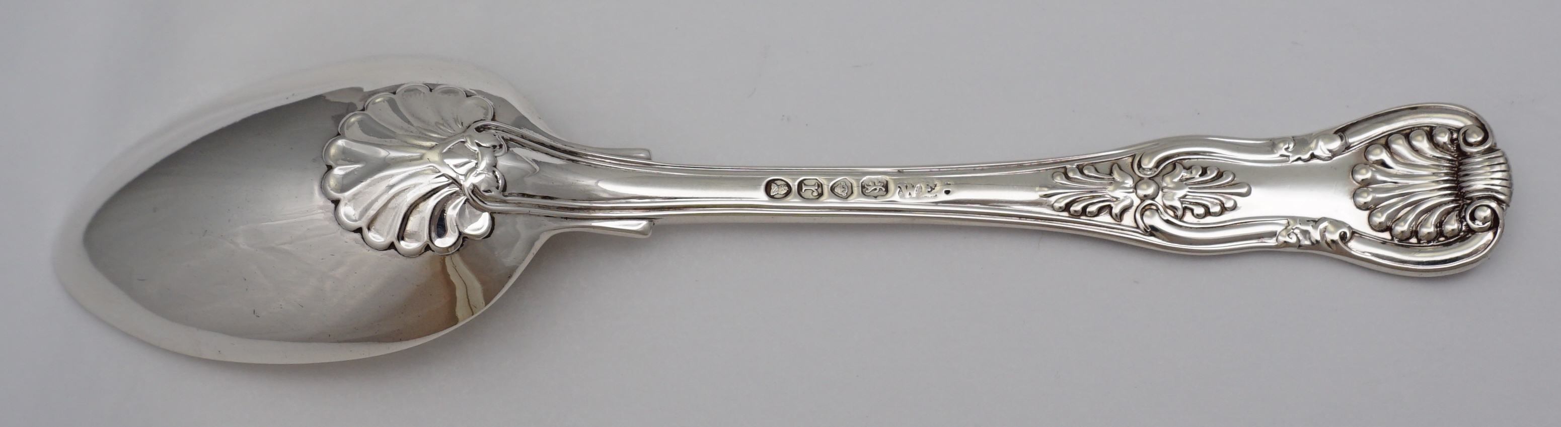 DESCRIPTION | Good antique English William IV solid sterling silver double struck King's with diamond shell heel pattern dessert spoon with no engraving but a frontal erasure. |