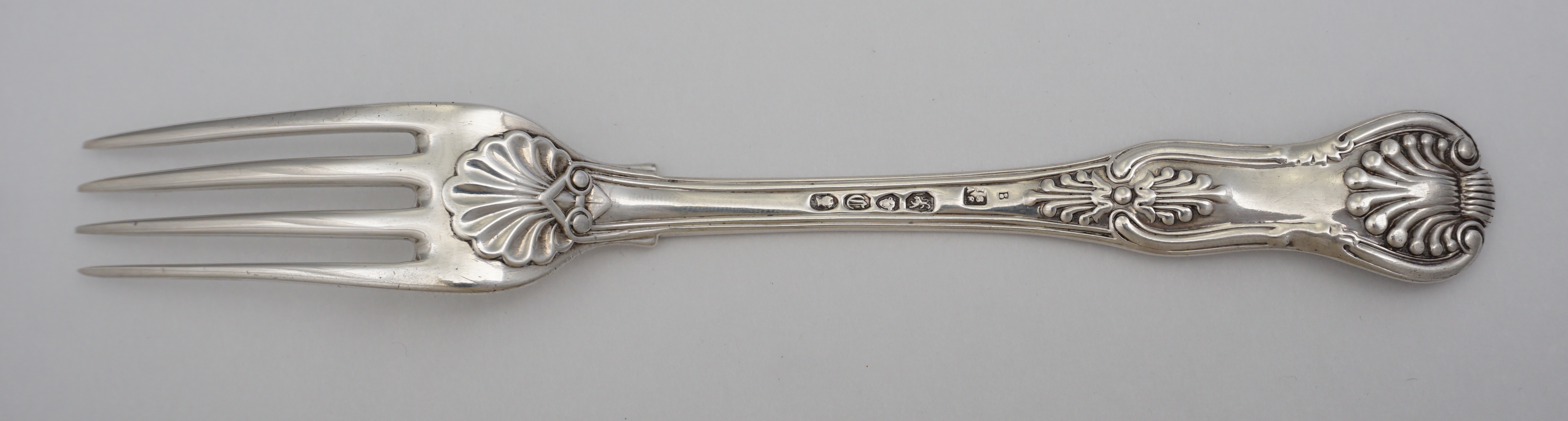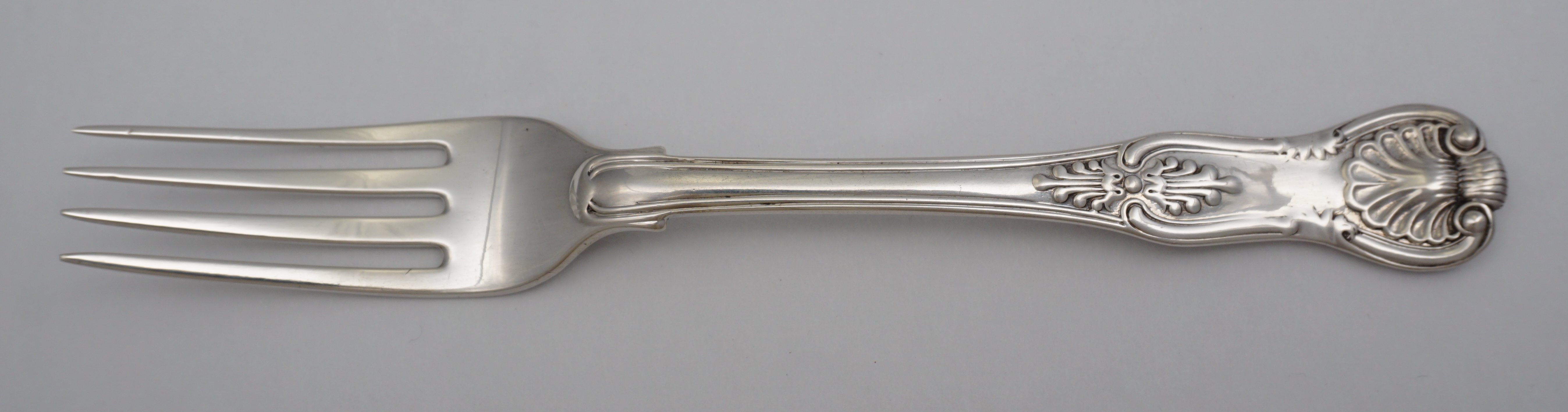 DESCRIPTION | Antique English Victorian solid sterling silver double struck (pattern both sides) King's pattern dessert fork. |