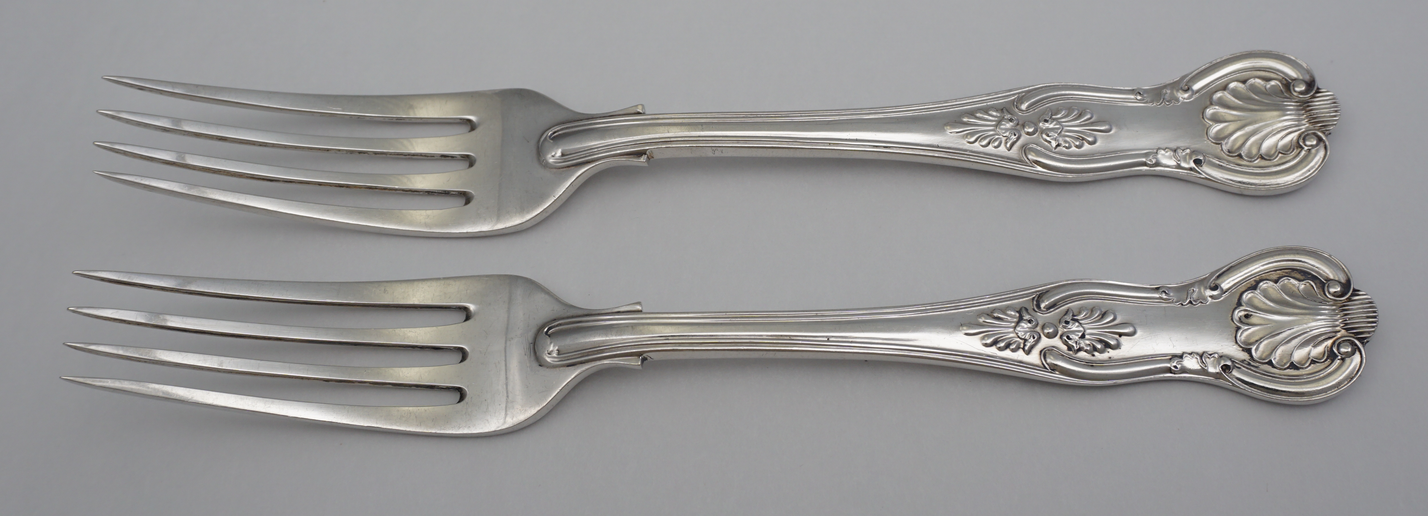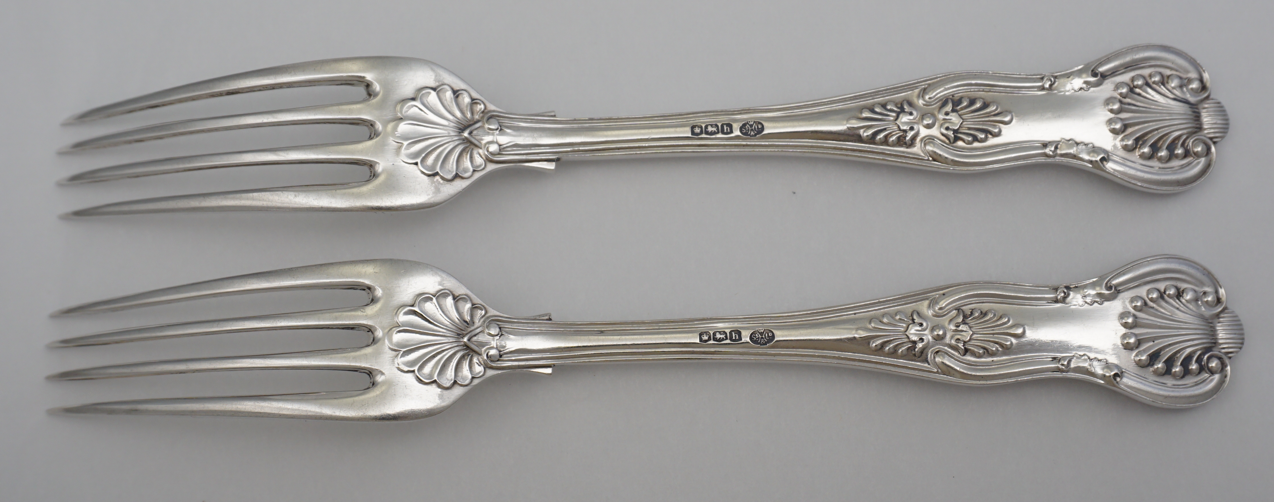 DESCRIPTION | Very good pair of vintage English solid sterling silver double struck (pattern both sides) King's pattern dessert forks with perfect, original condition, full length tines and no engraving or erasure. |