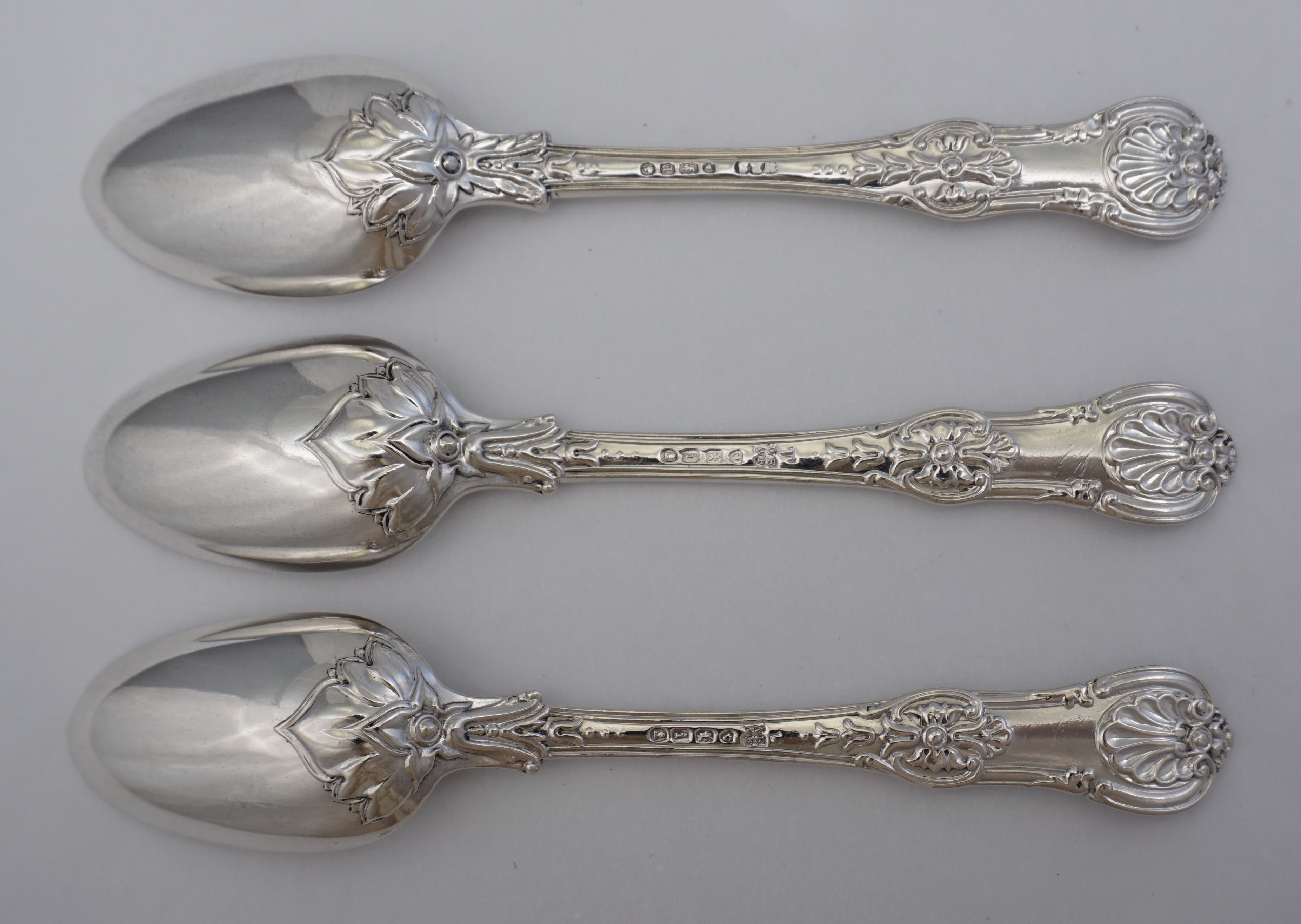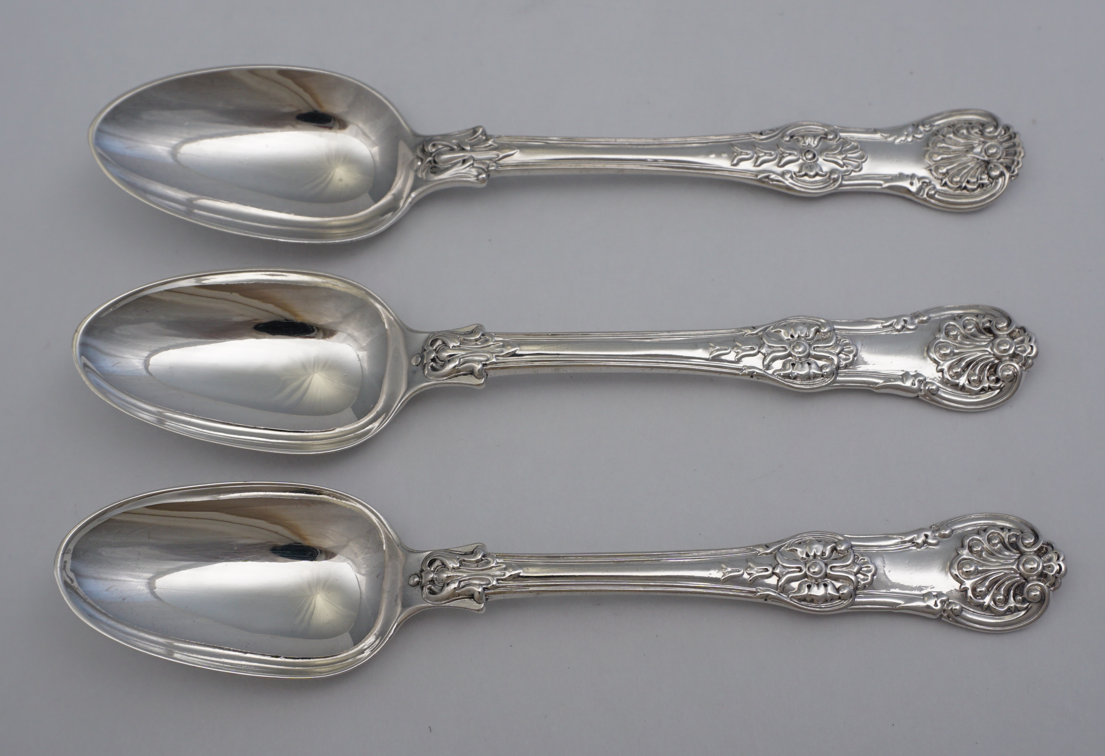 DESCRIPTION | Three antique Georgian/Victorian English solid sterling silver double struck (pattern both sides) Scroll Rosette pattern teaspoons. Scroll Rosette is a superb quality and sadly scarce variant of Queen's pattern. |