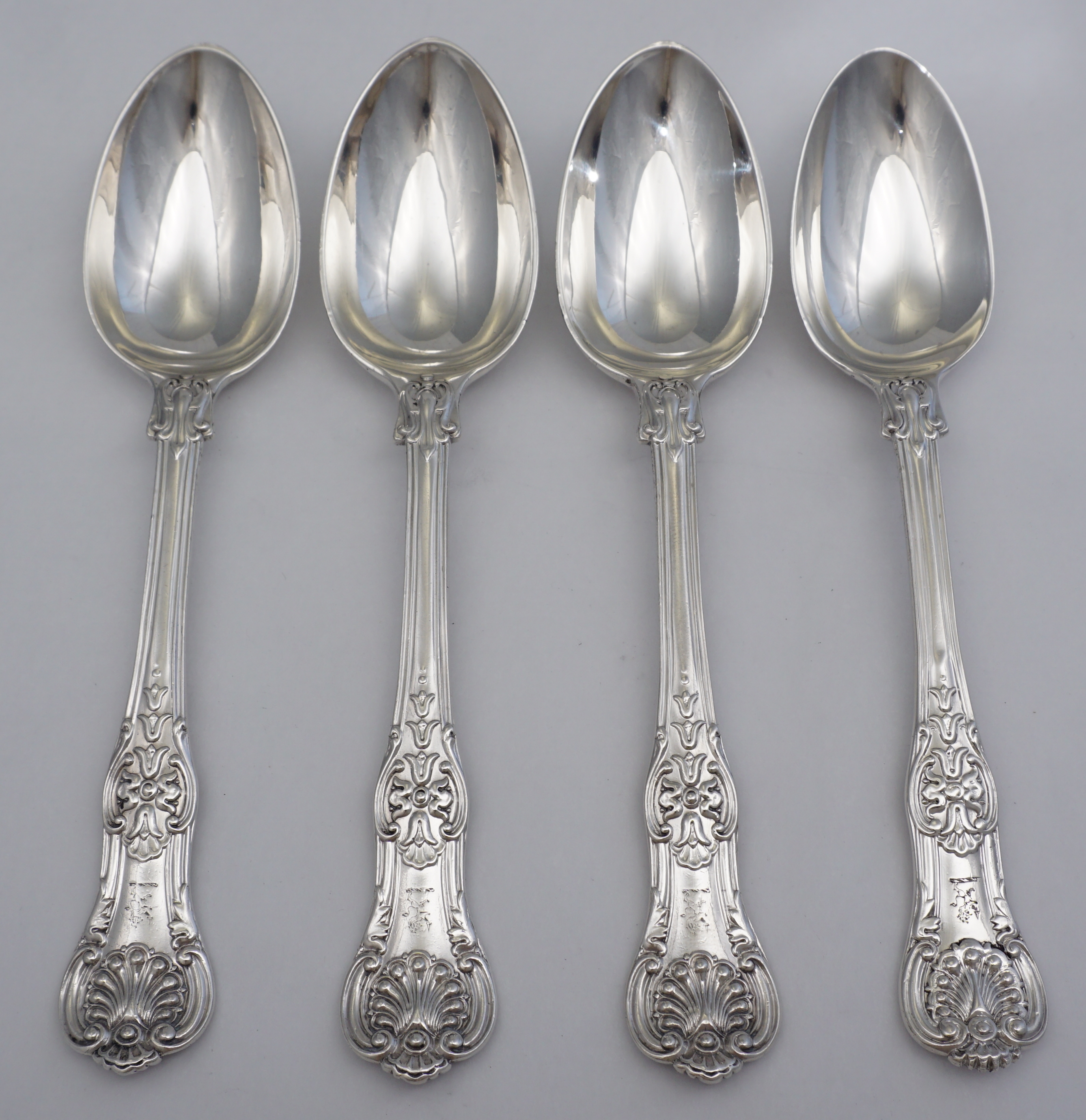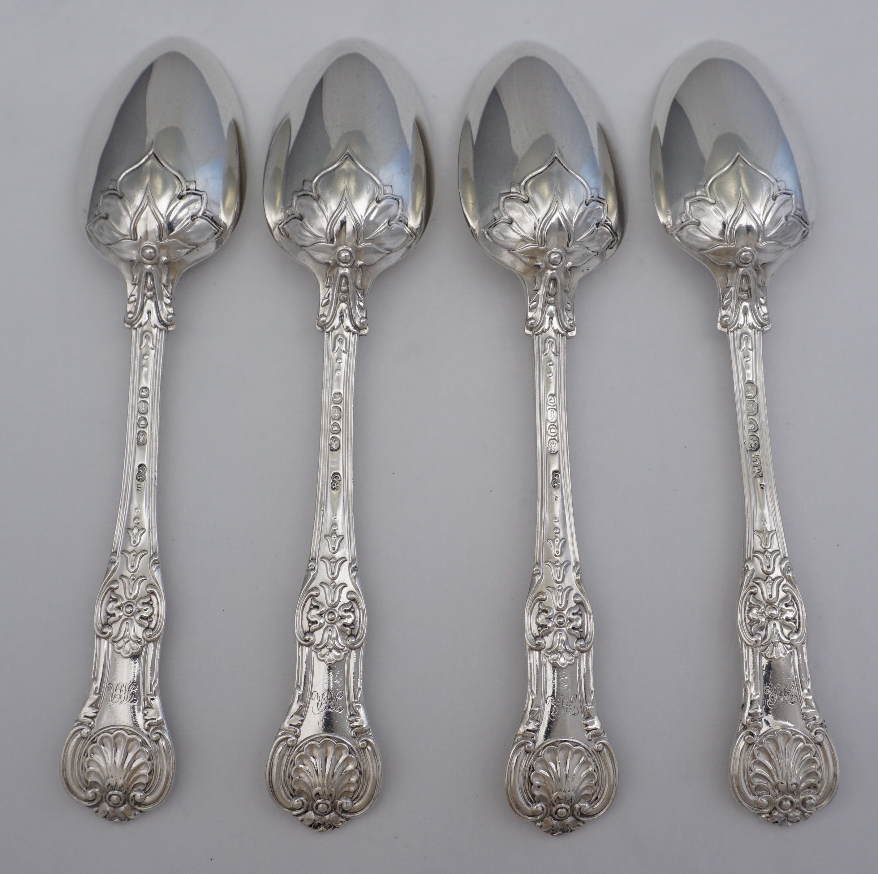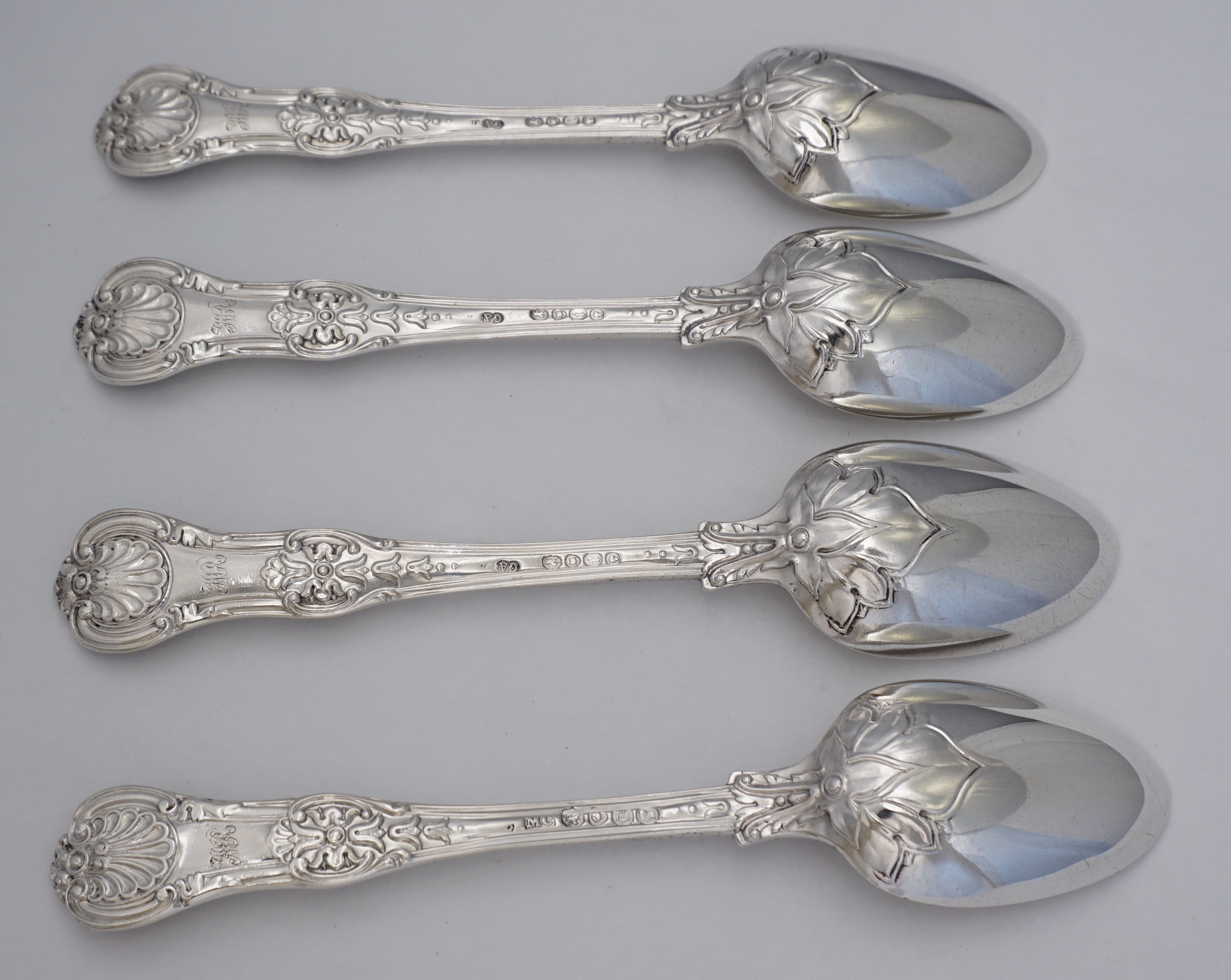 DESCRIPTION | Four antique Victorian English solid sterling silver double struck (pattern both sides) Scroll Rosette pattern dessert spoons with discreet frontal crest and small monogram verso. Scroll Rosette is a superb quality and sadly scarce variant of Queen's pattern. |