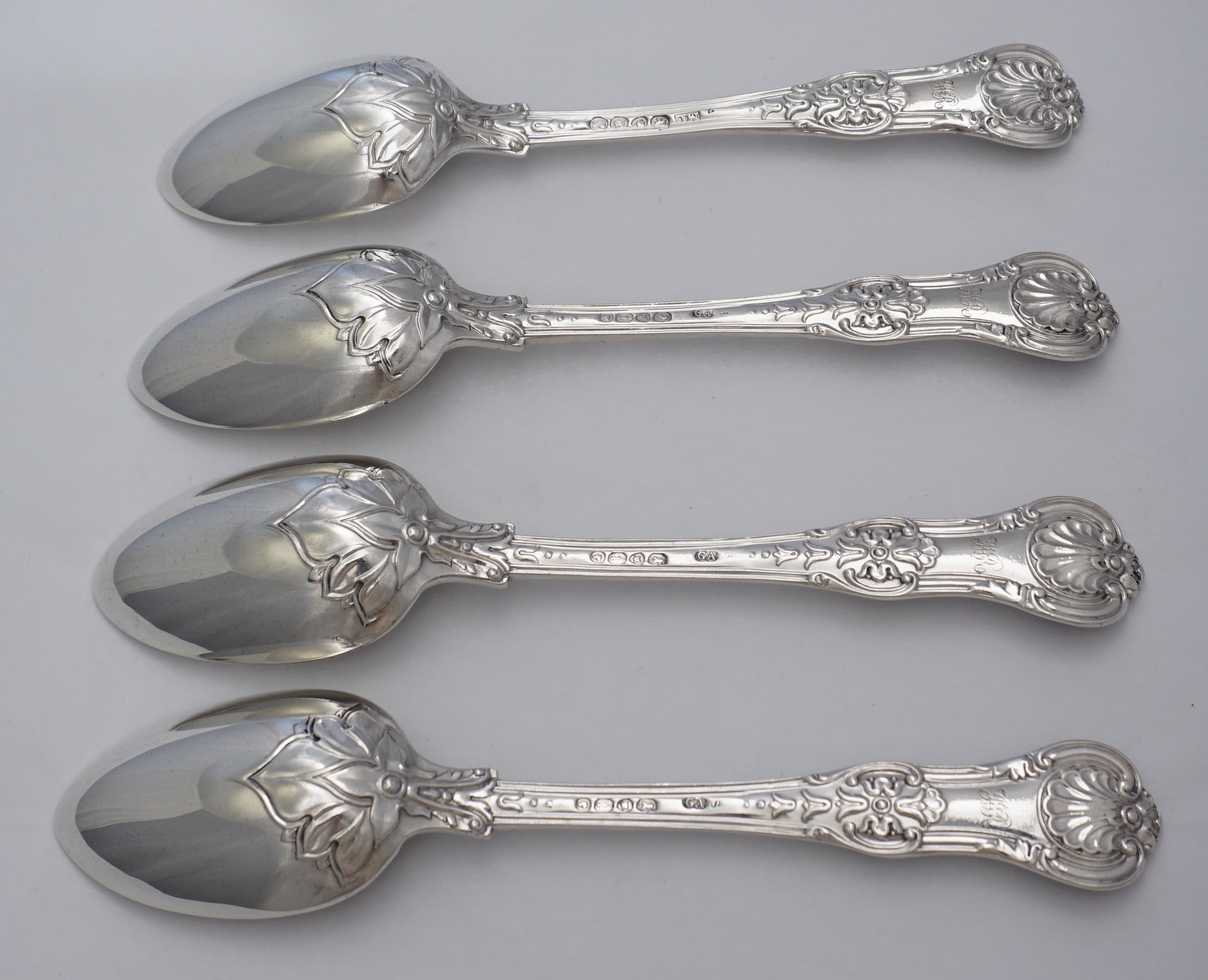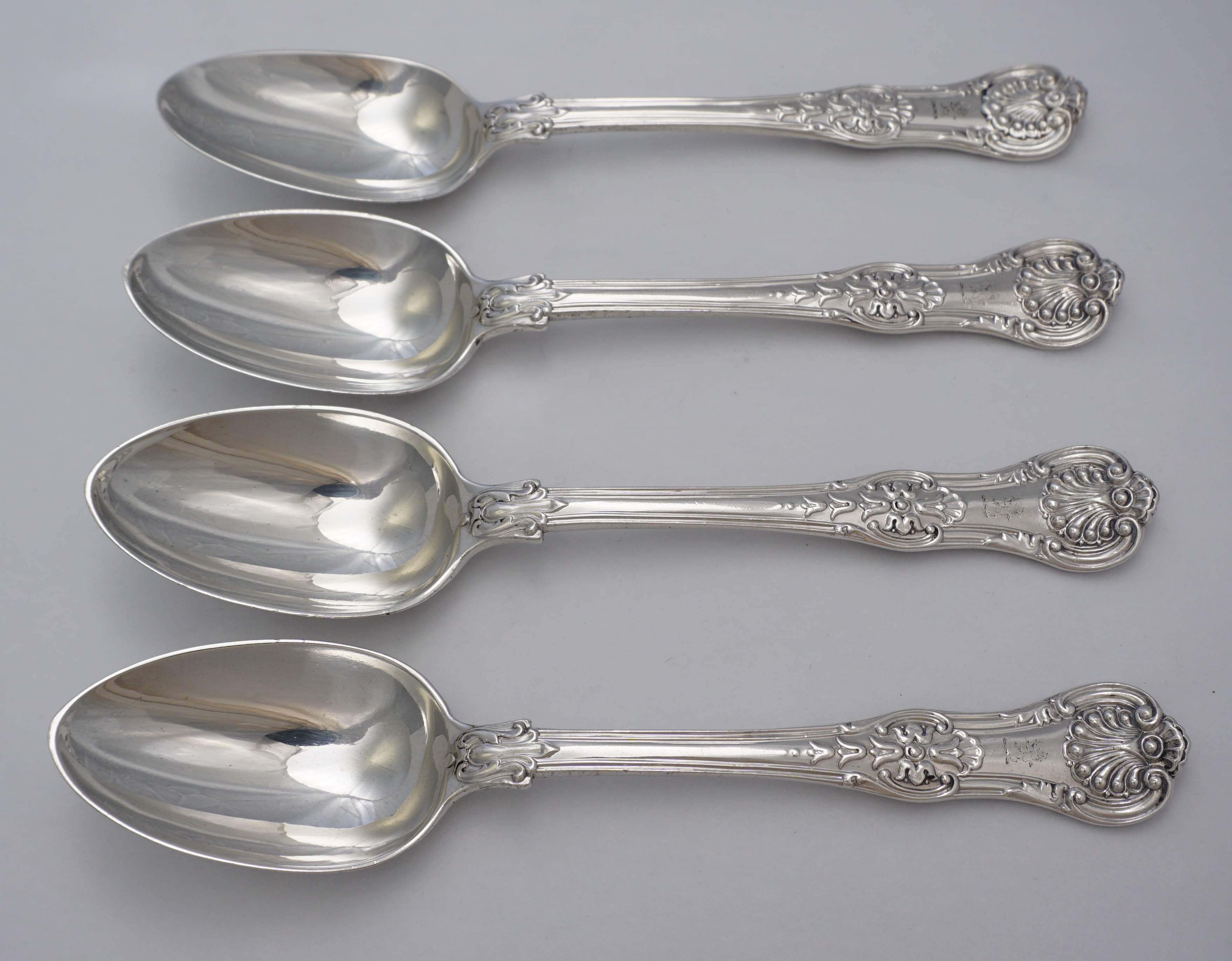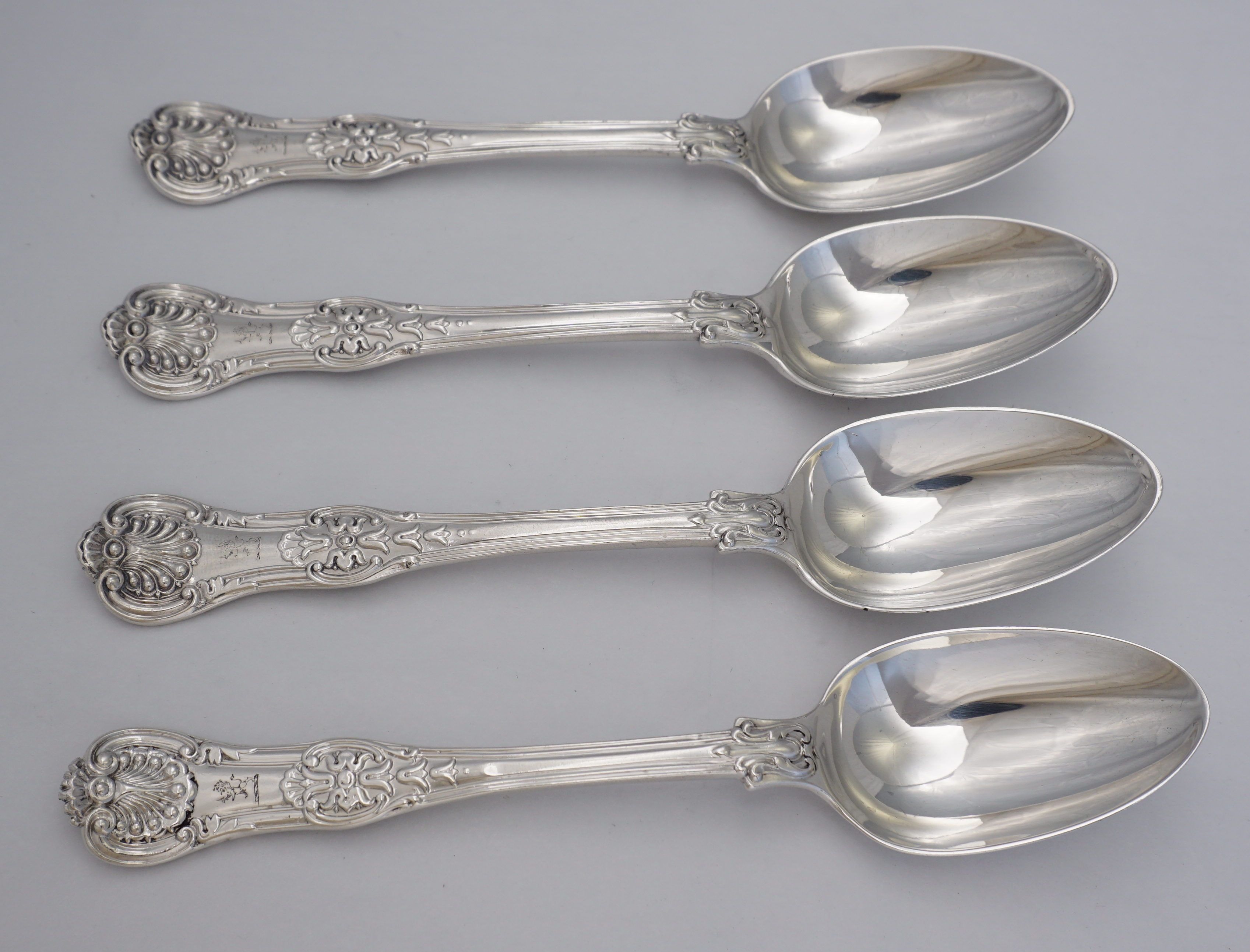 DESCRIPTION | Four antique Victorian English solid sterling silver double struck (pattern both sides) Scroll Rosette pattern dessert spoons with discreet frontal crest and small monogram verso. Scroll Rosette is a superb quality and sadly scarce variant of Queen's pattern. |