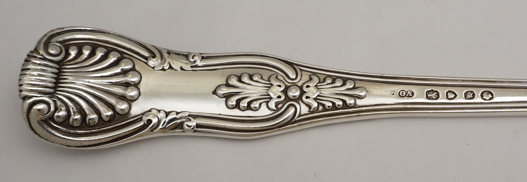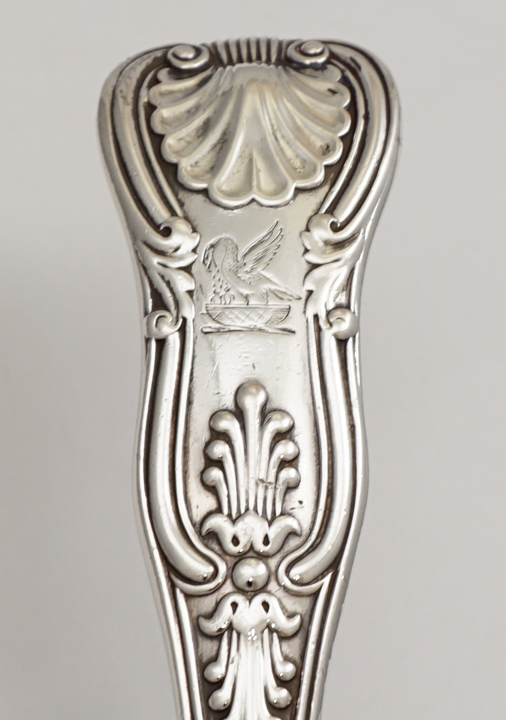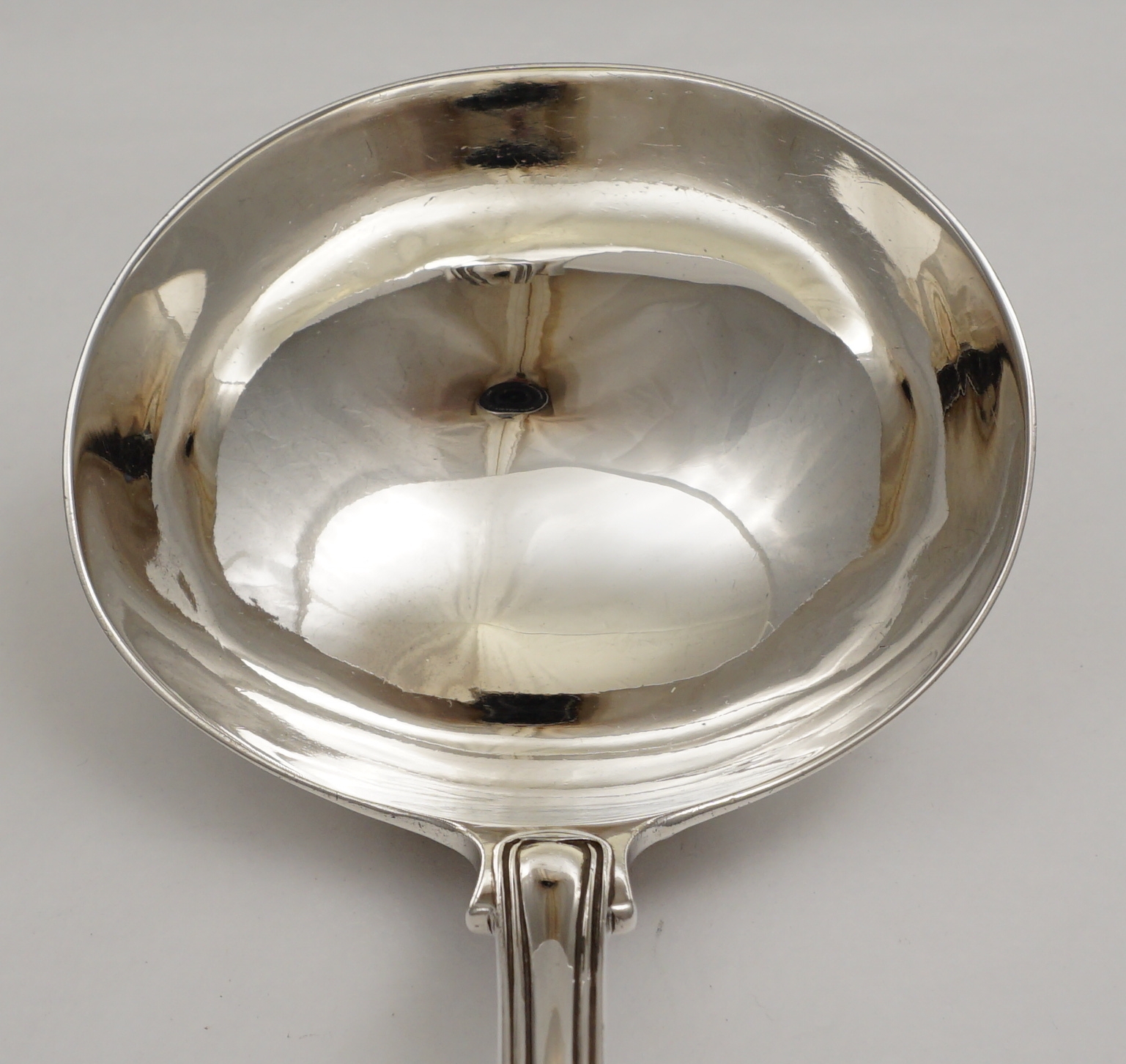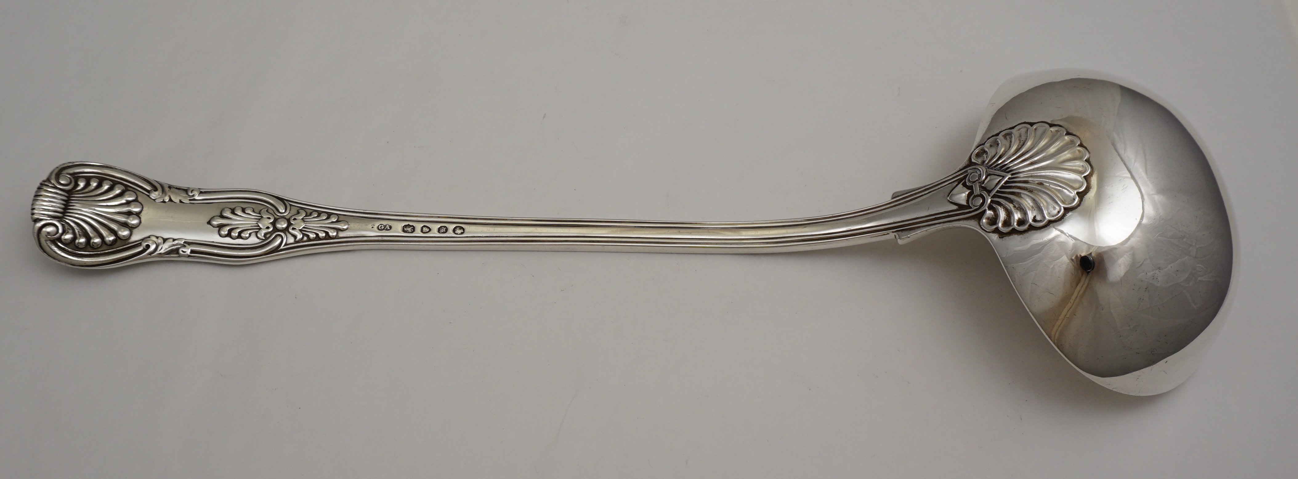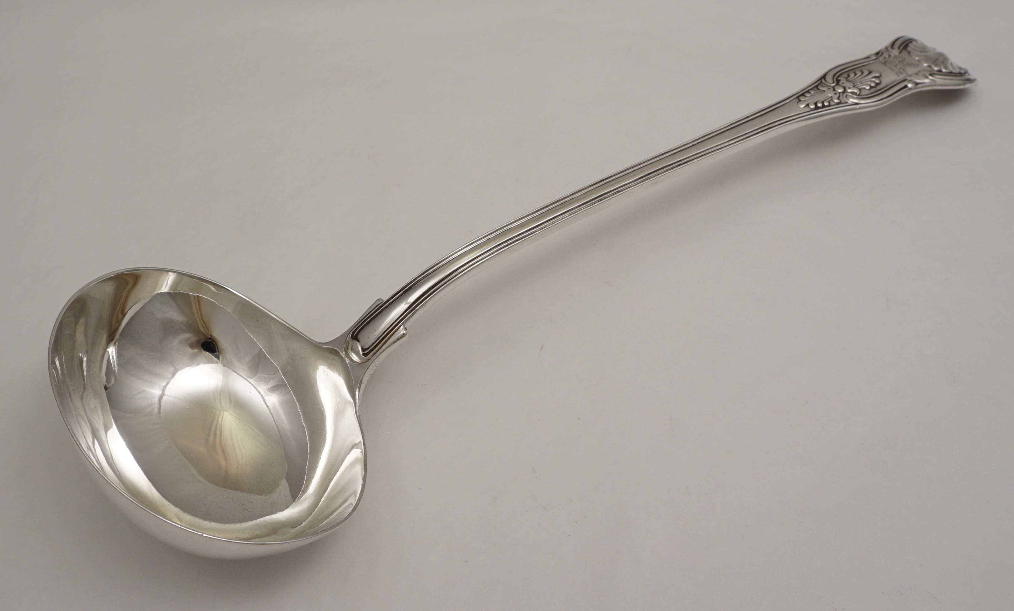 DESCRIPTION | Very good antique English early Victorian solid sterling silver double struck (pattern both sides) King's pattern soup ladle with a nice frontal crest. |