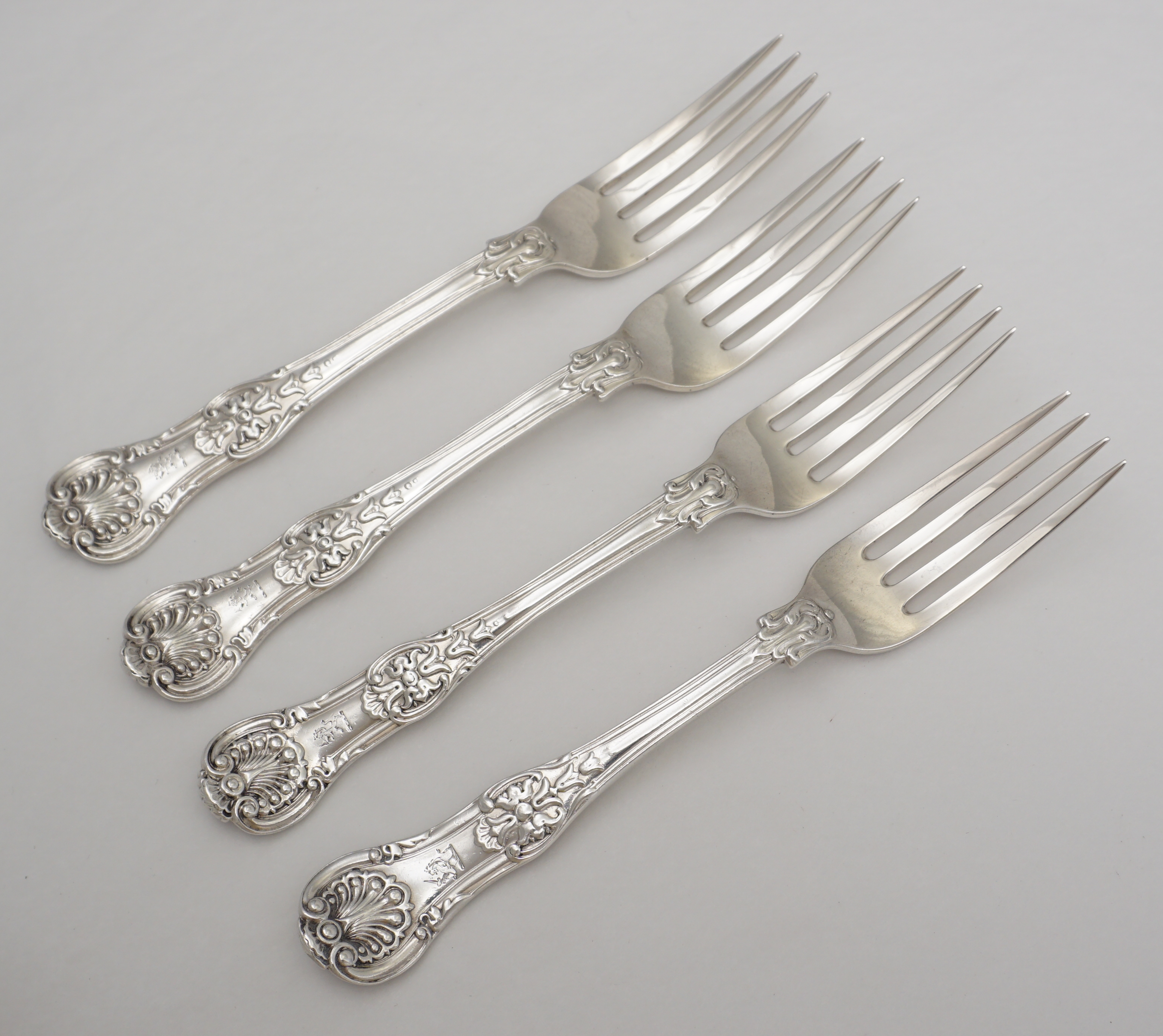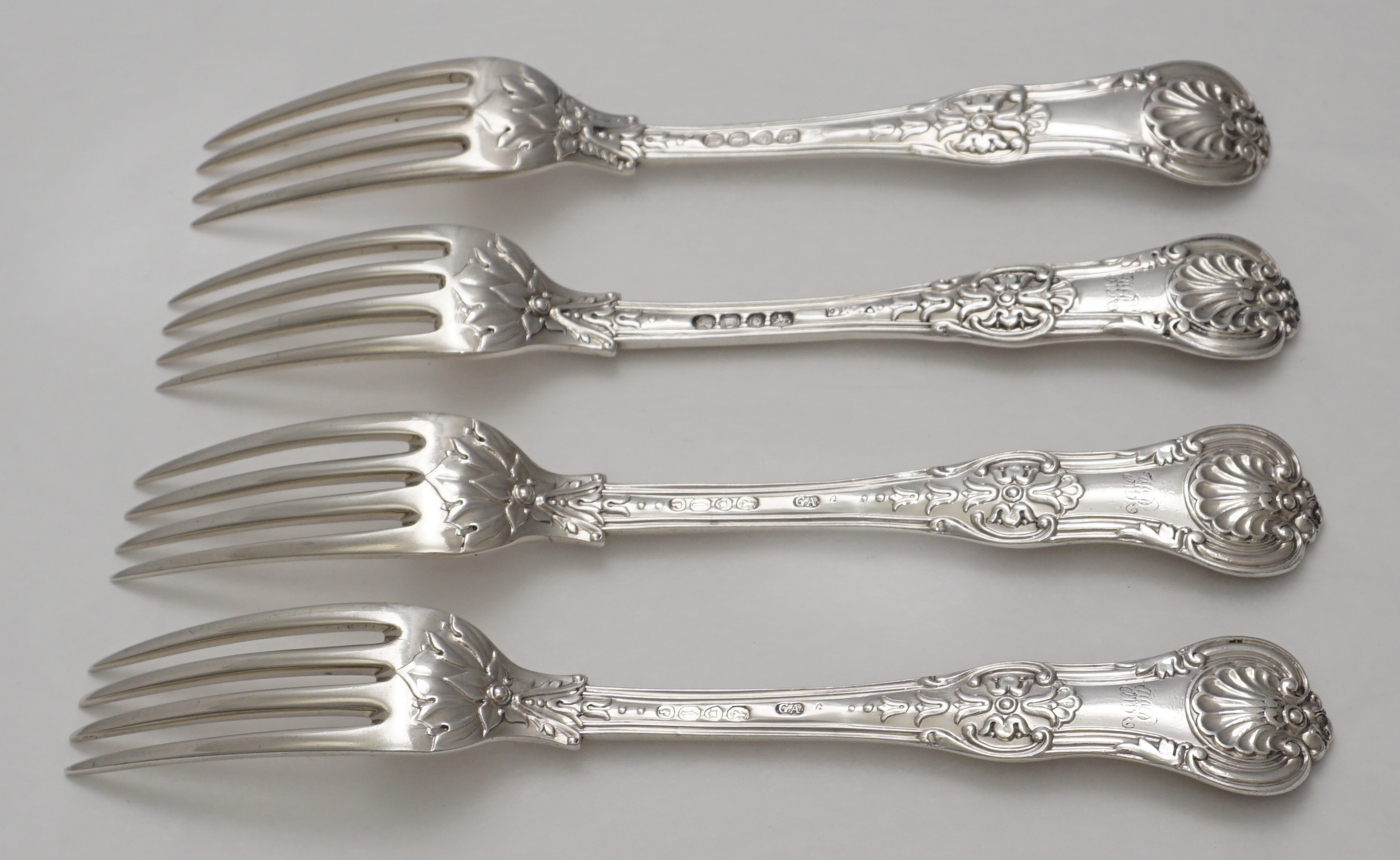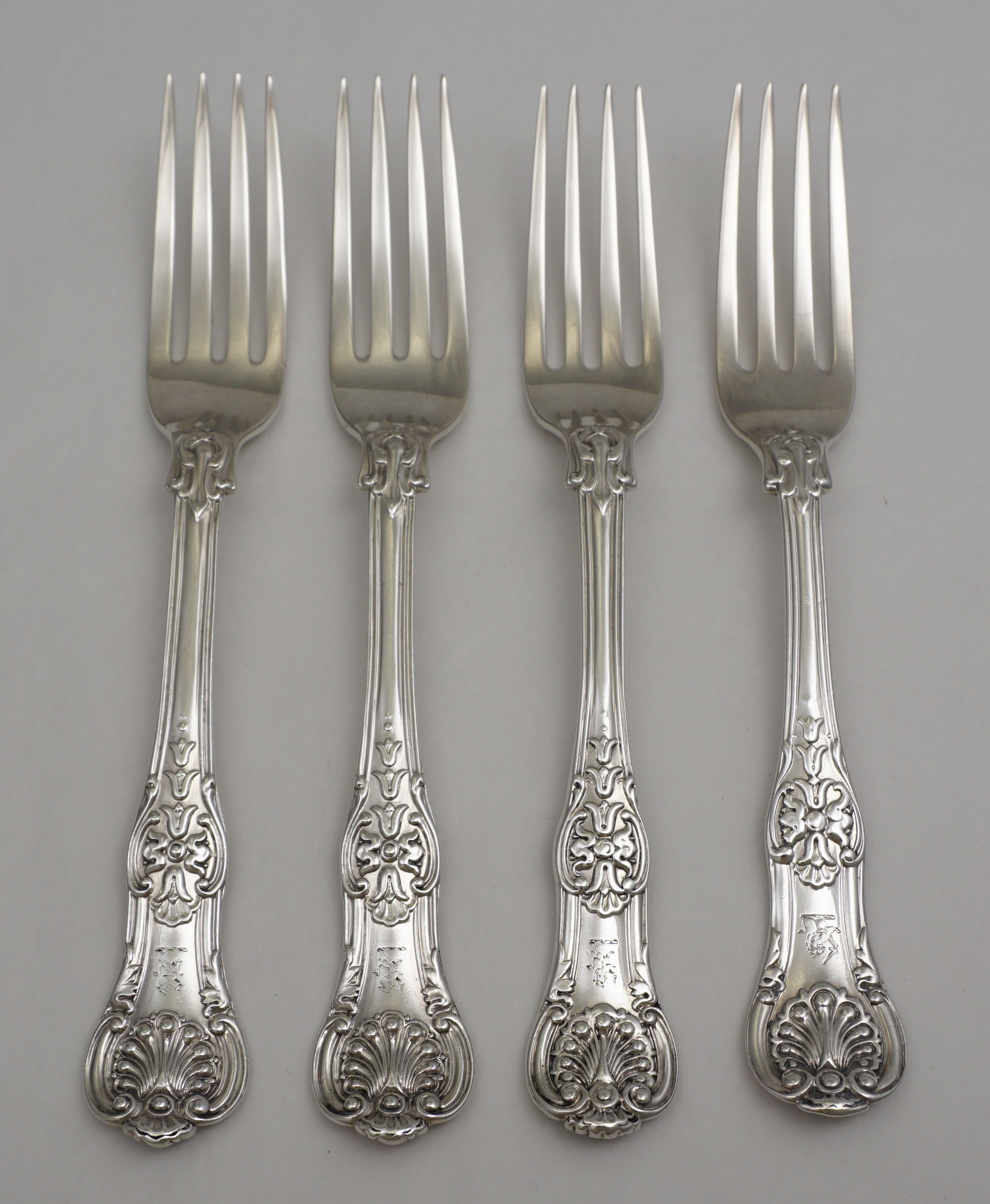 DESCRIPTION | Four antique English solid sterling silver double struck (pattern both sides) Scroll Rosette pattern dessert forks with frontal crest engraving and three with monogram verso. |