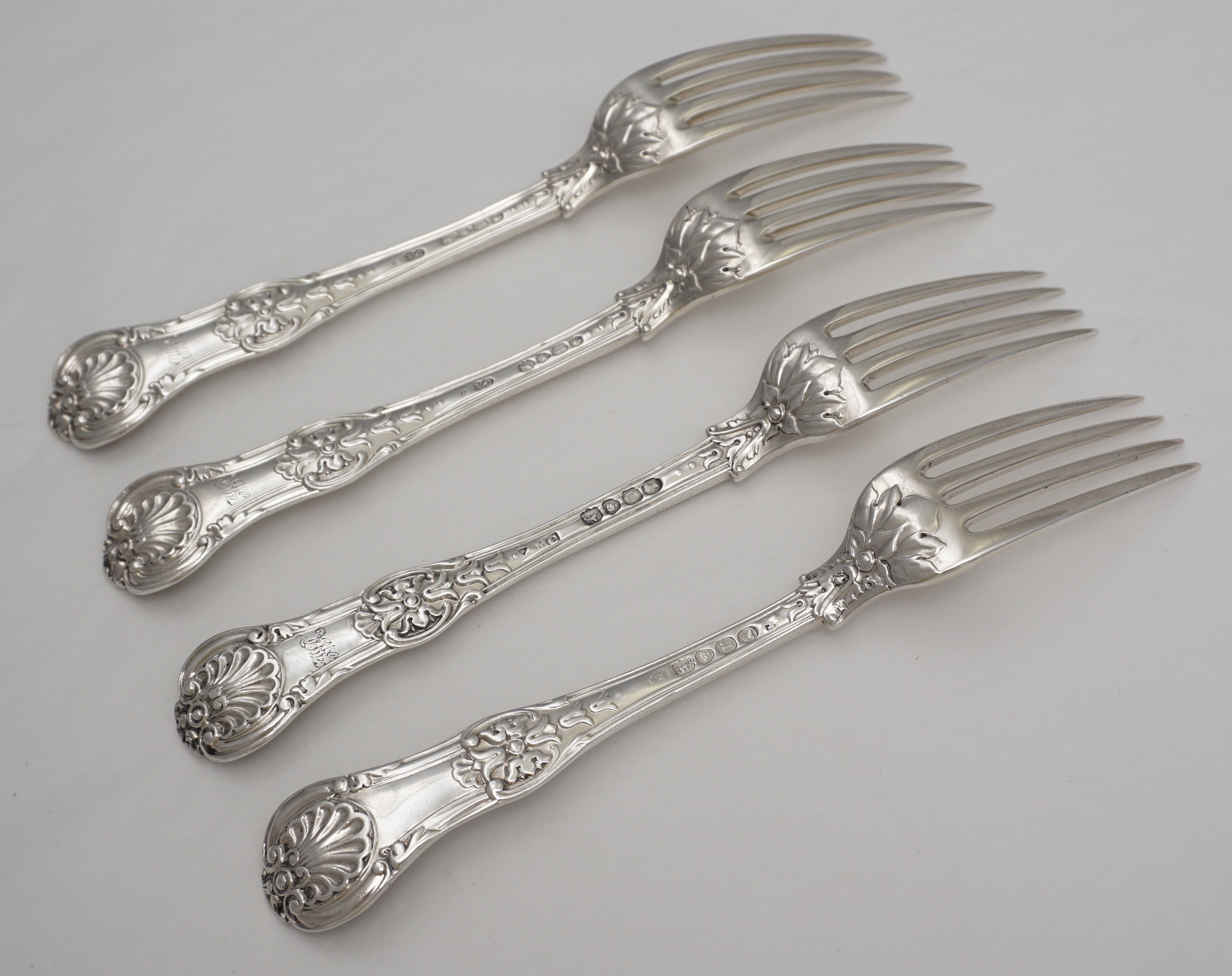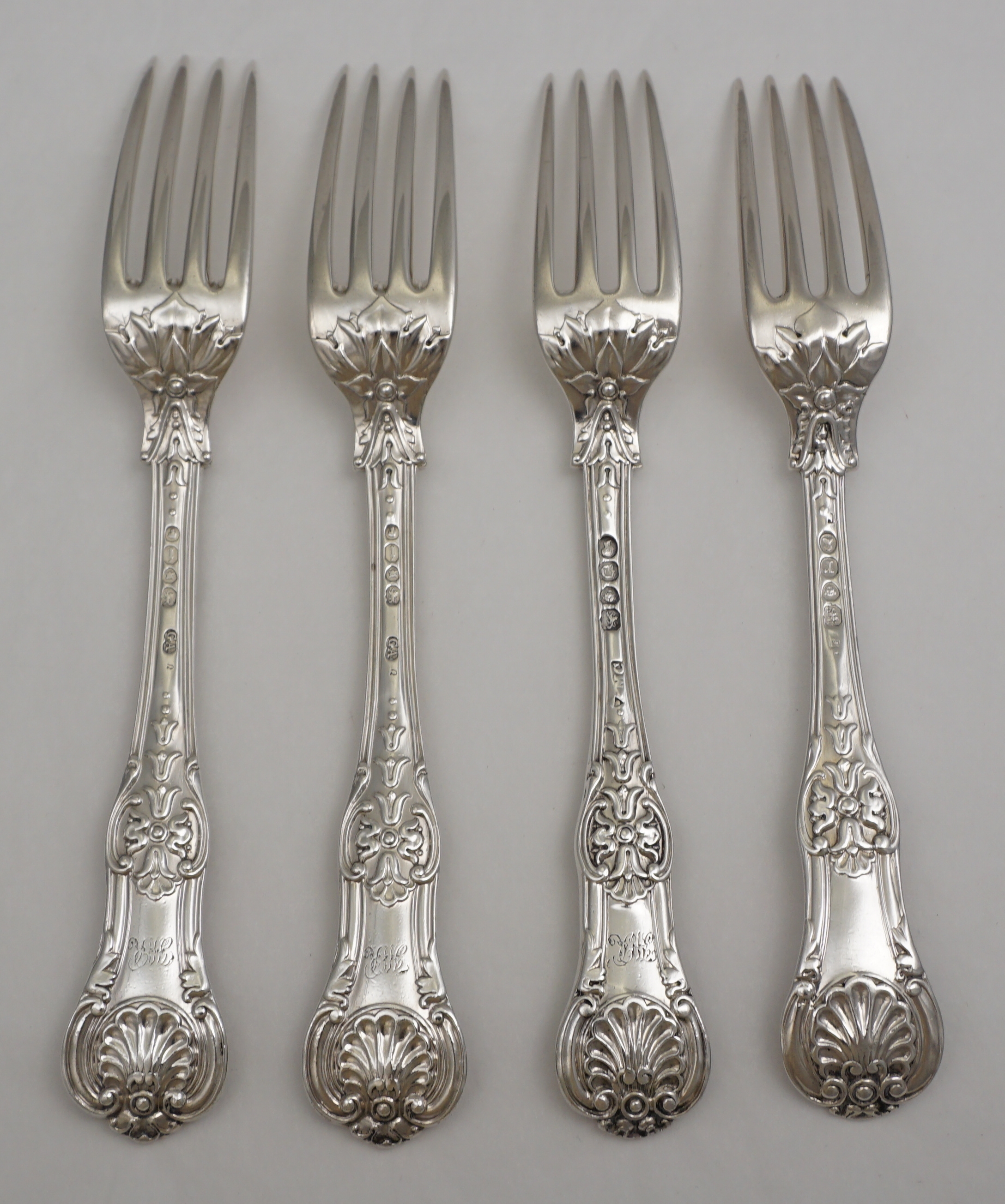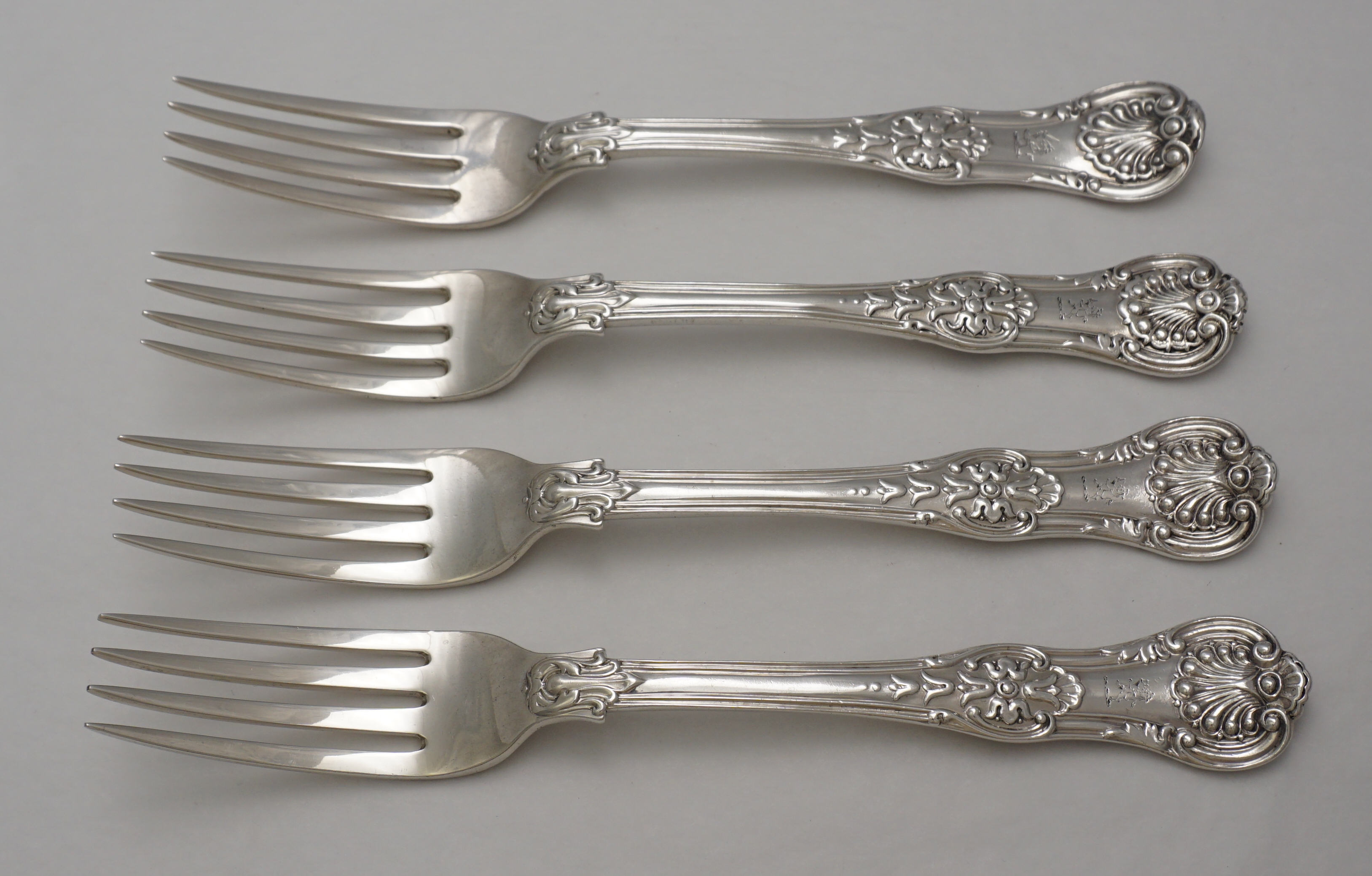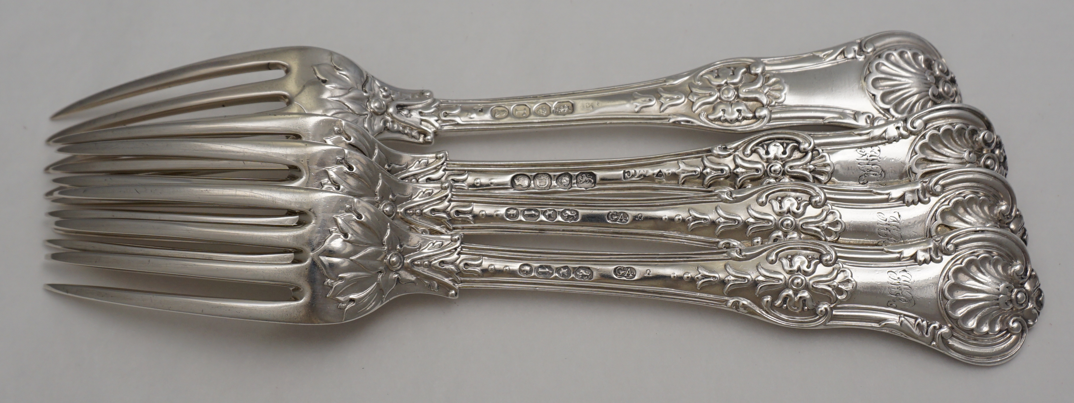 DESCRIPTION | Four antique English solid sterling silver double struck (pattern both sides) Scroll Rosette pattern dessert forks with frontal crest engraving and three with monogram verso. |