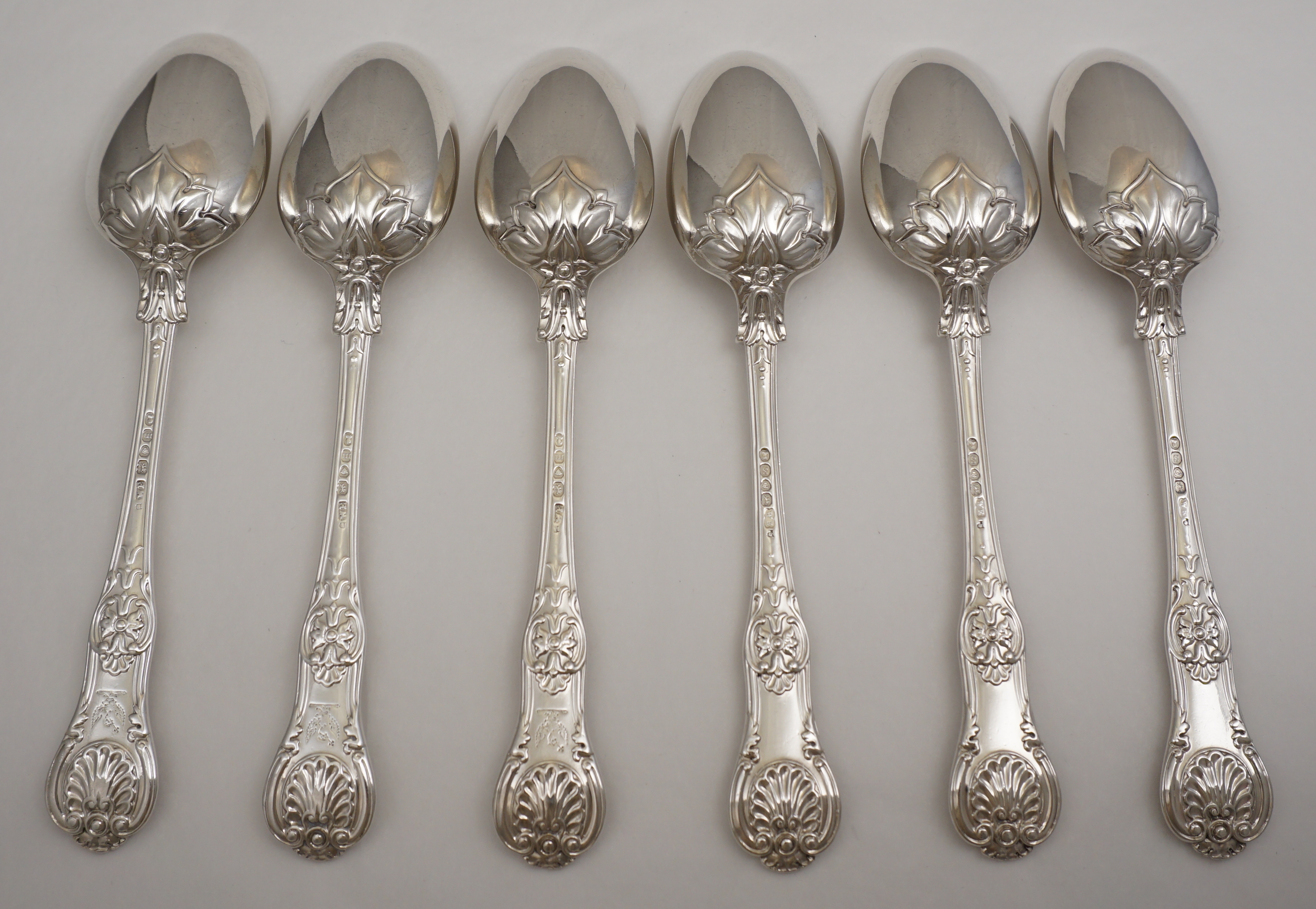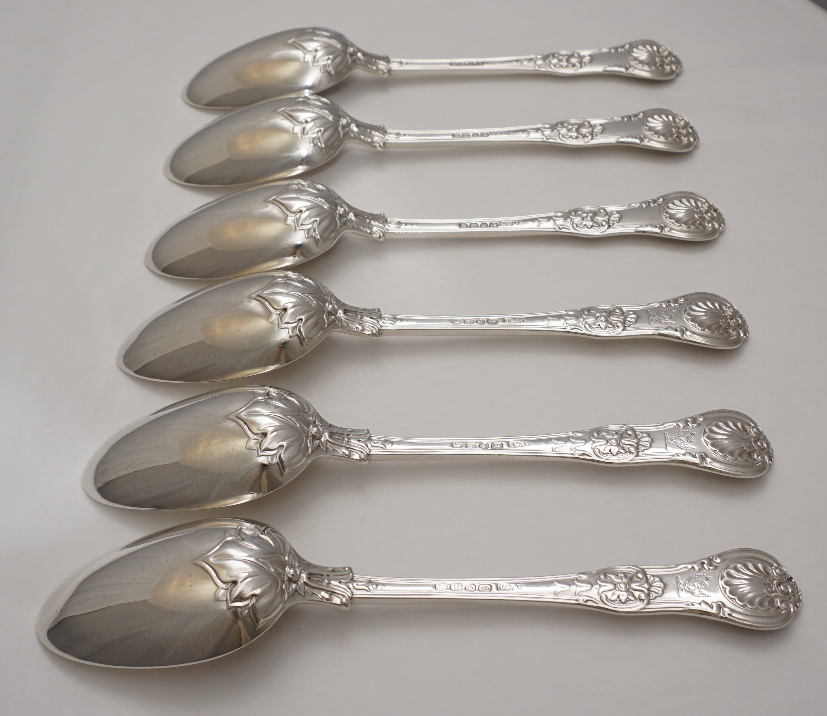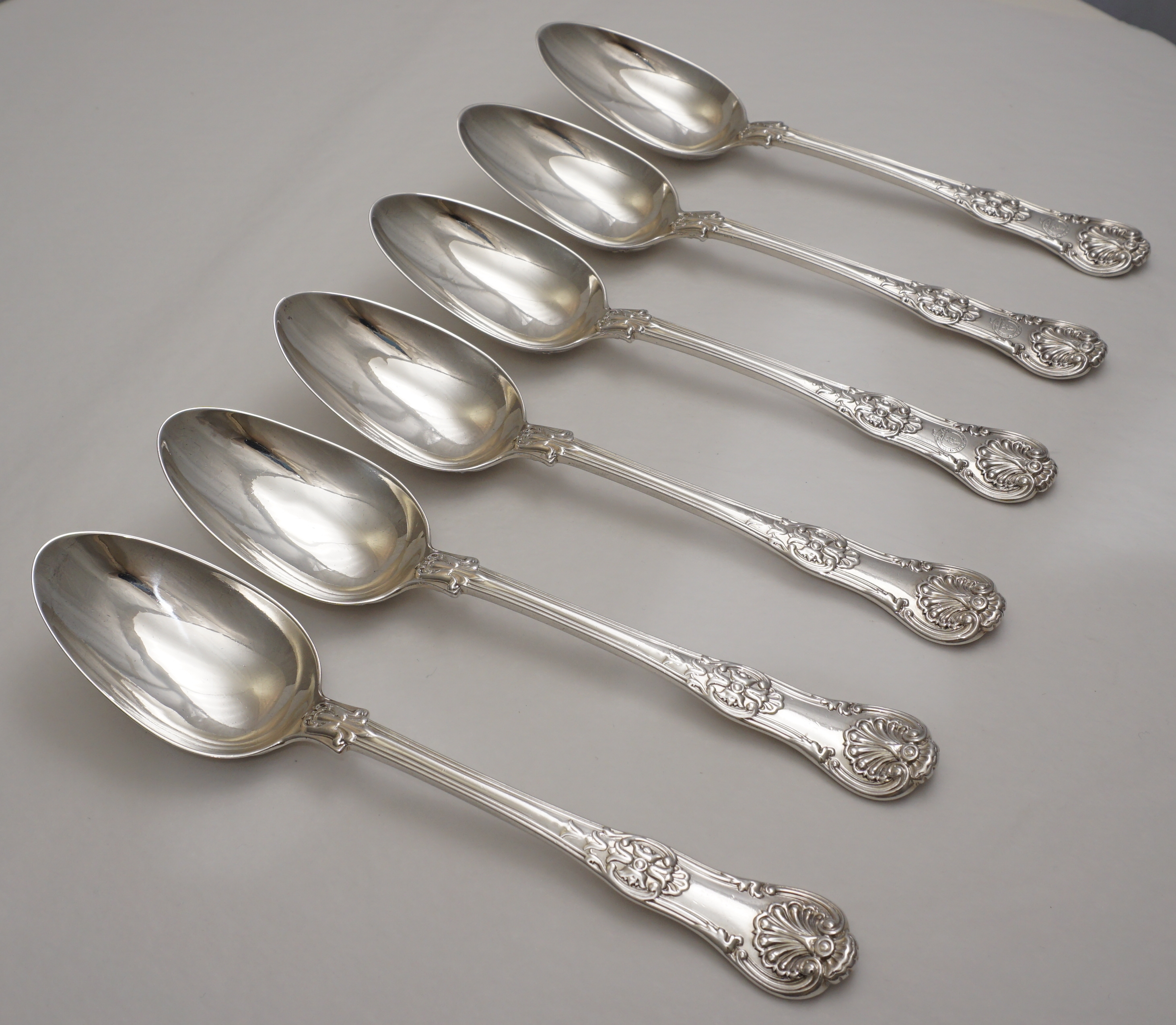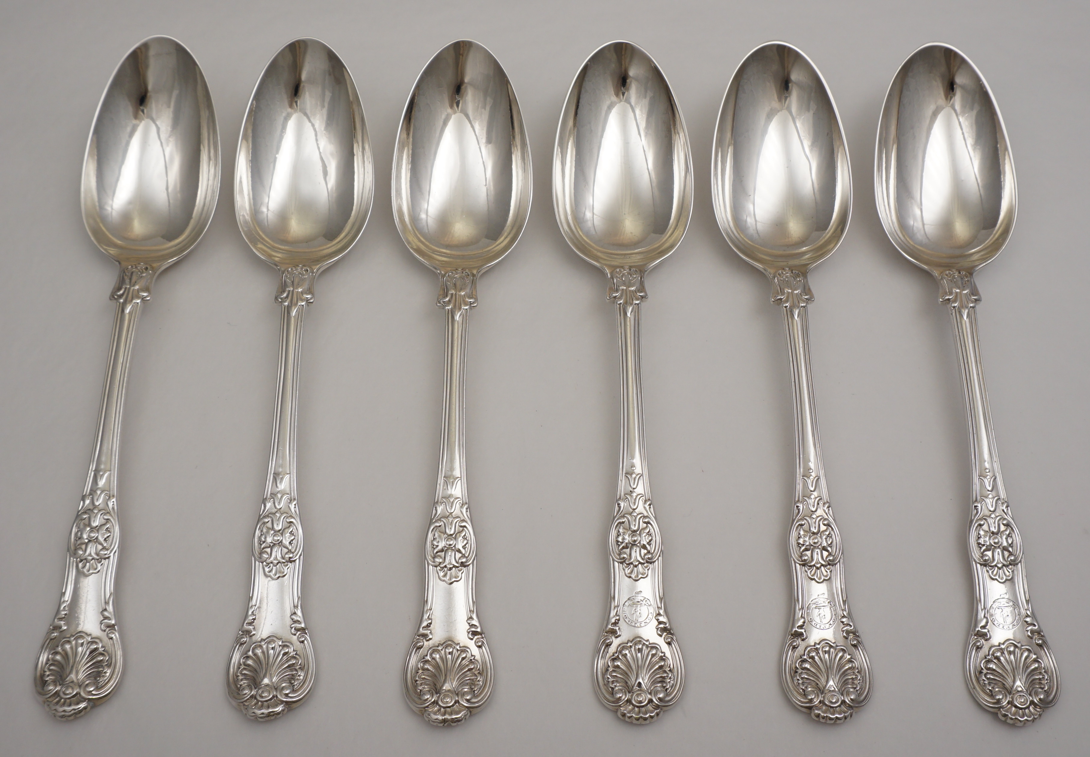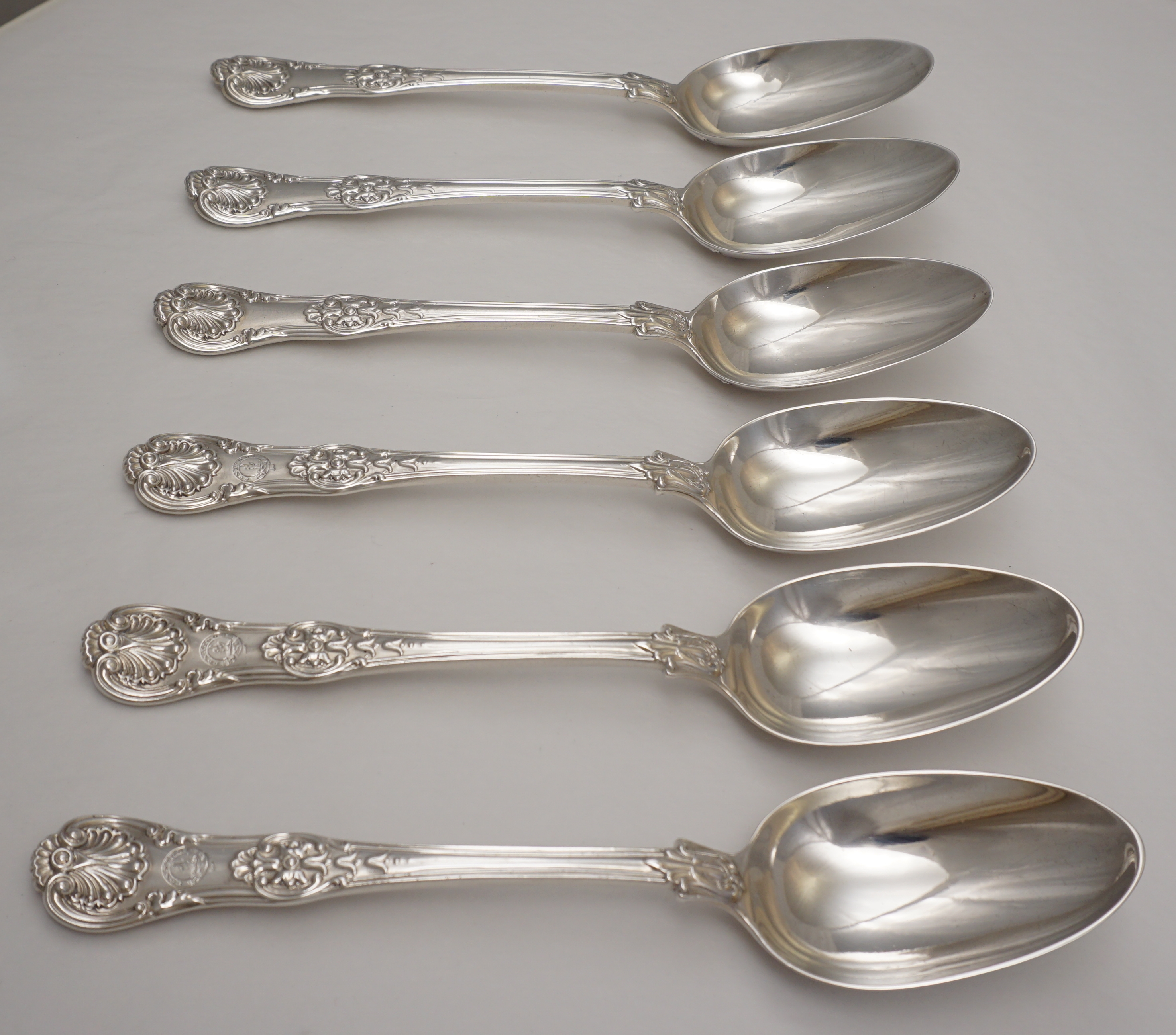 DESCRIPTION | Very good set of six antique English Georgian and William IV solid sterling silver double struck (pattern both sides) Scroll Rosette pattern table spoons, three with crest verso and three with frontal crest and motto. |