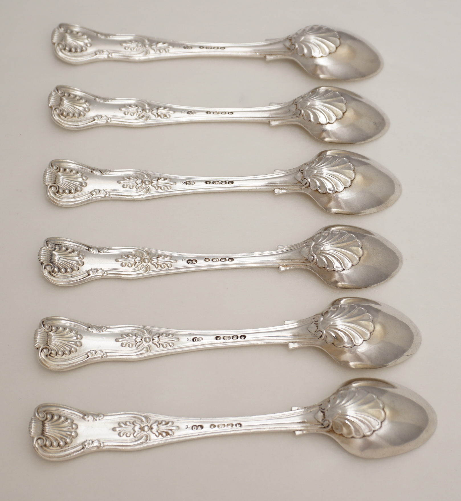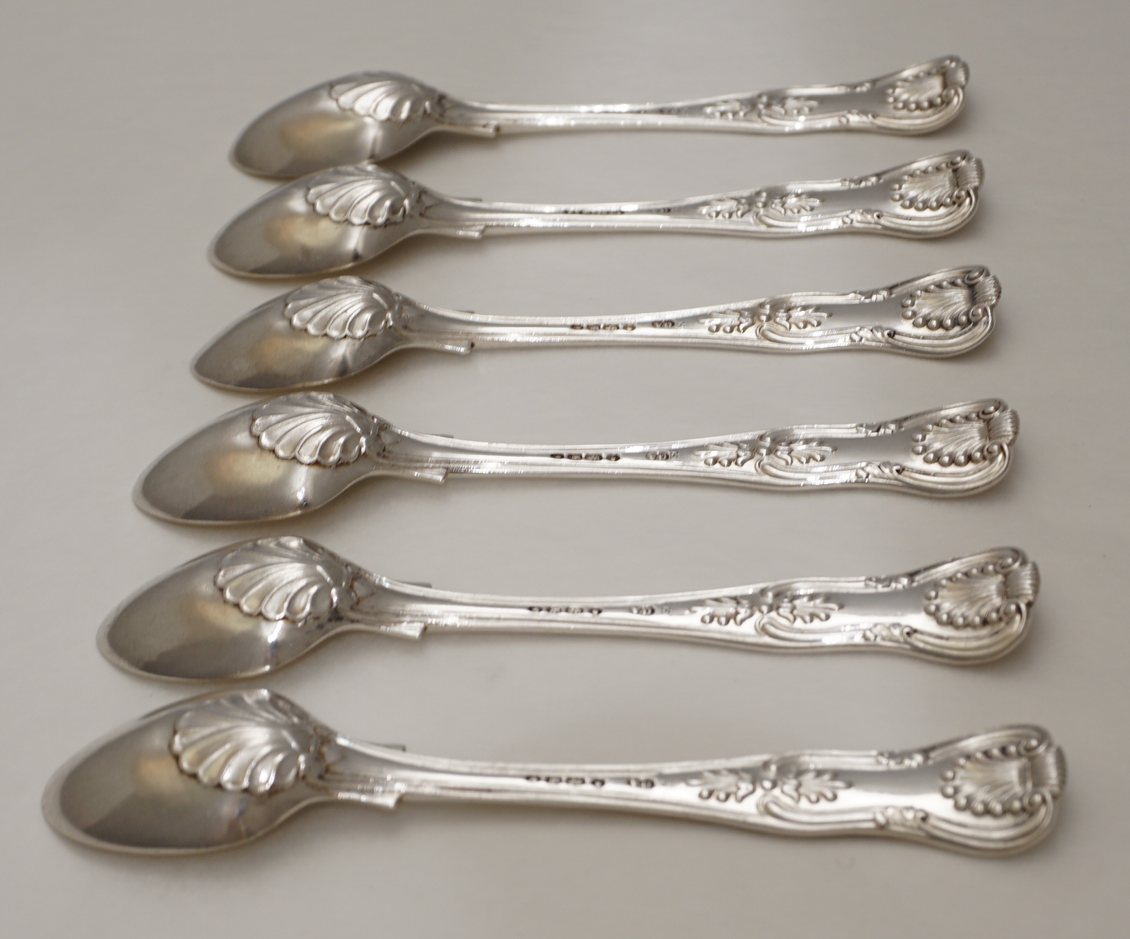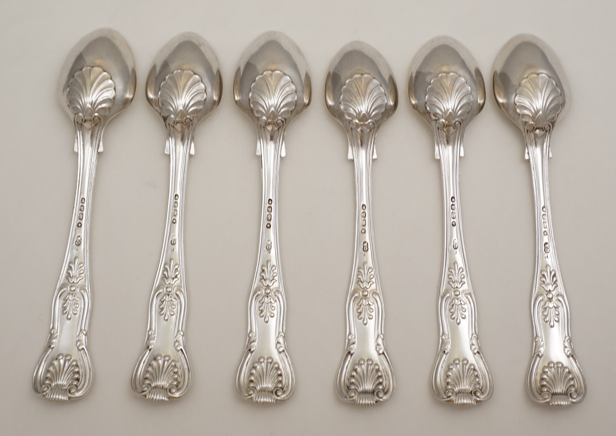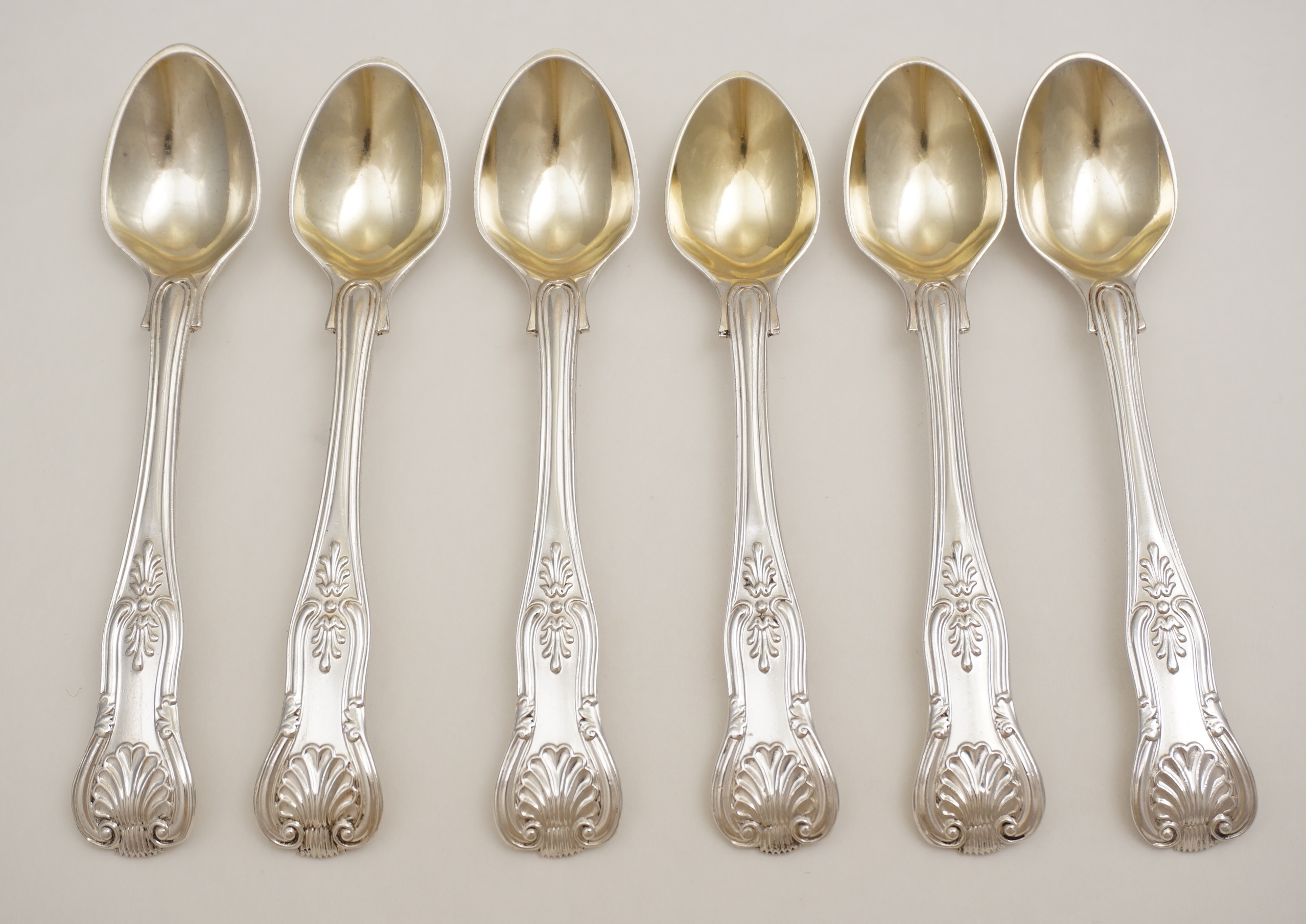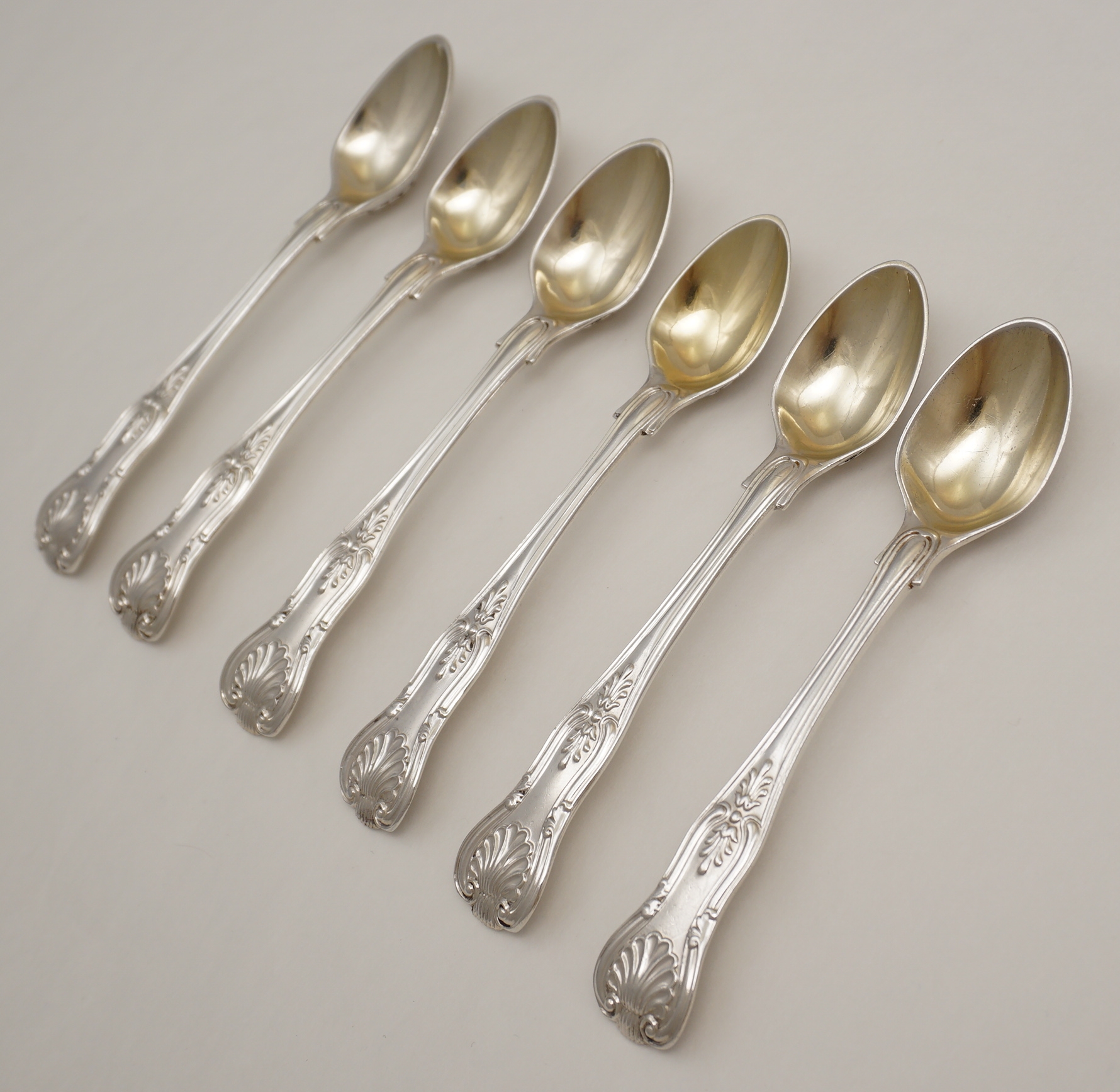 DESCRIPTION | Superb set of six antique English Victorian solid sterling silver double struck (pattern both sides) King's pattern egg spoons with gilded bowls and no engraving or erasure. |